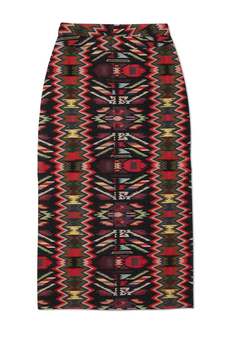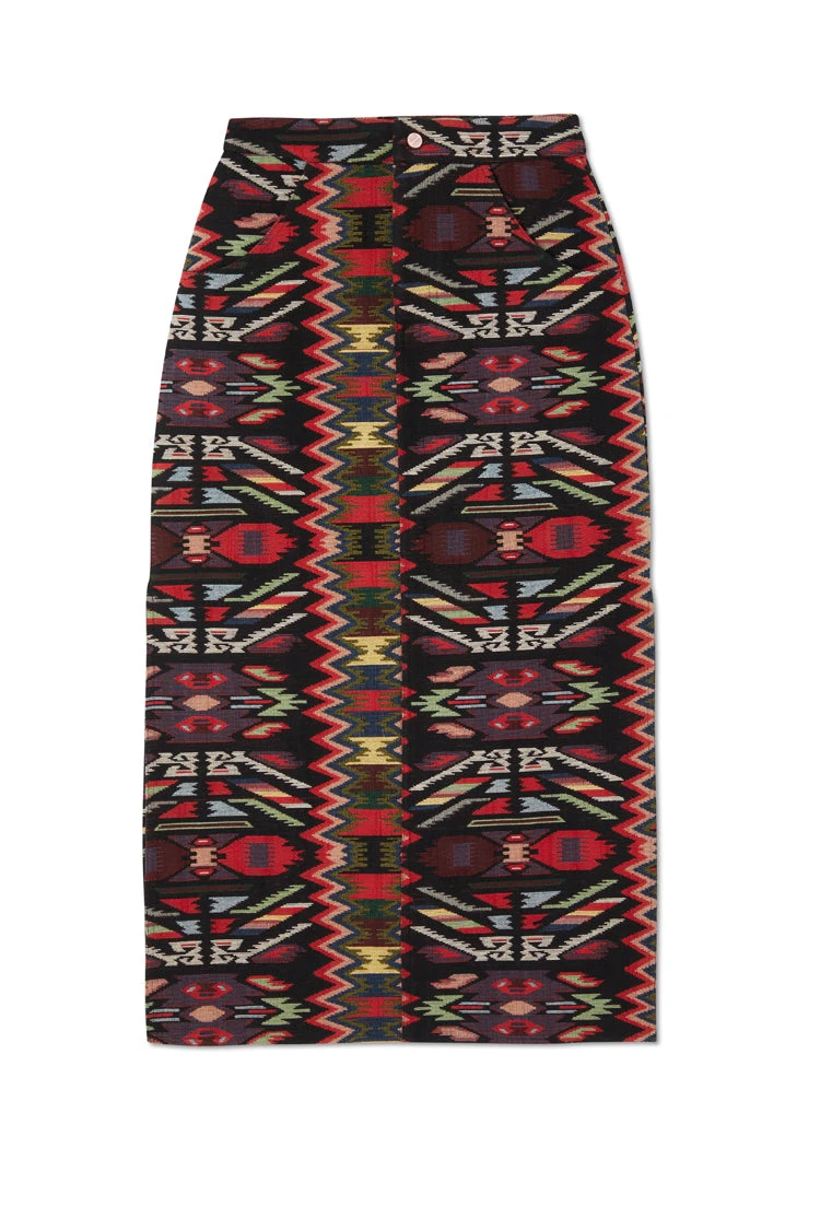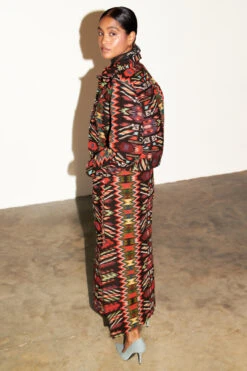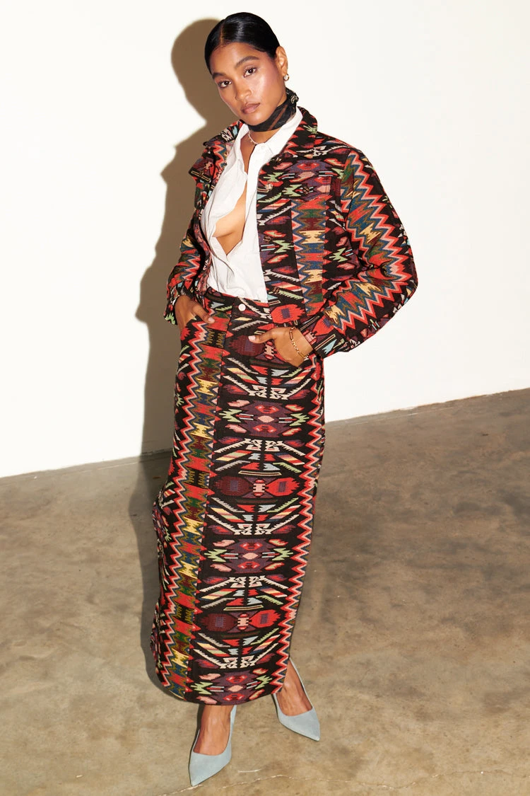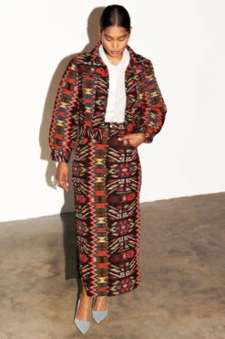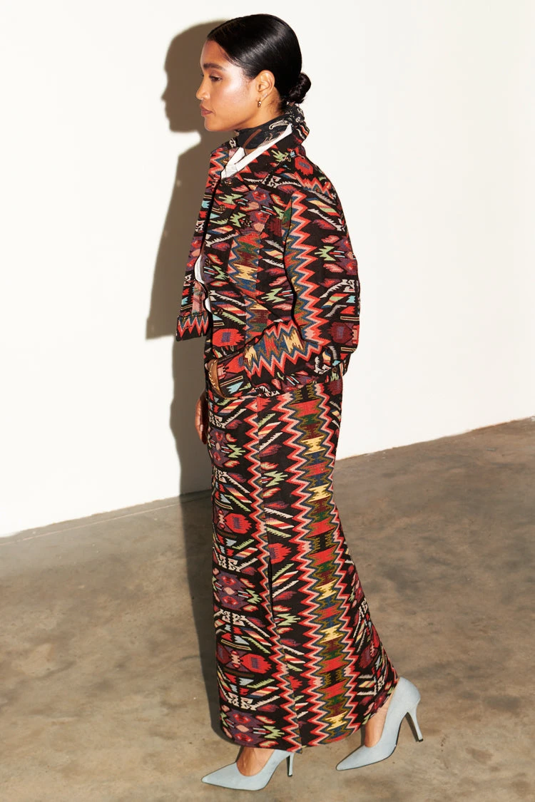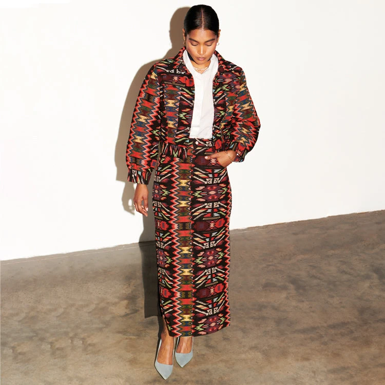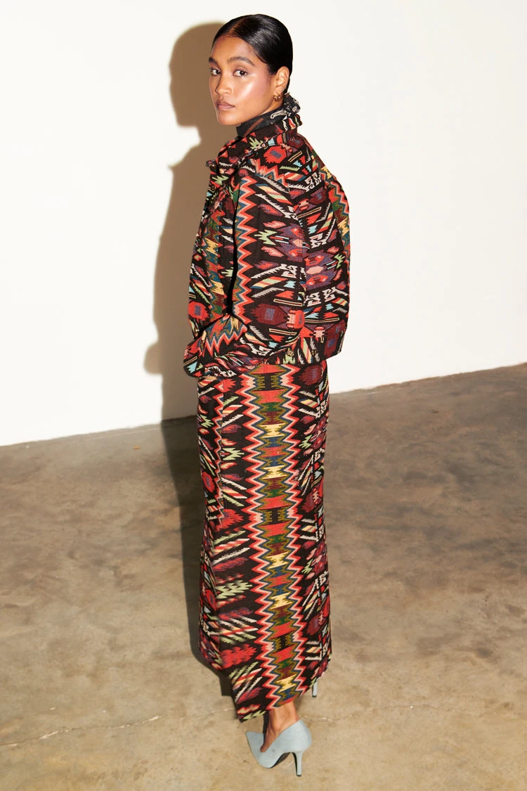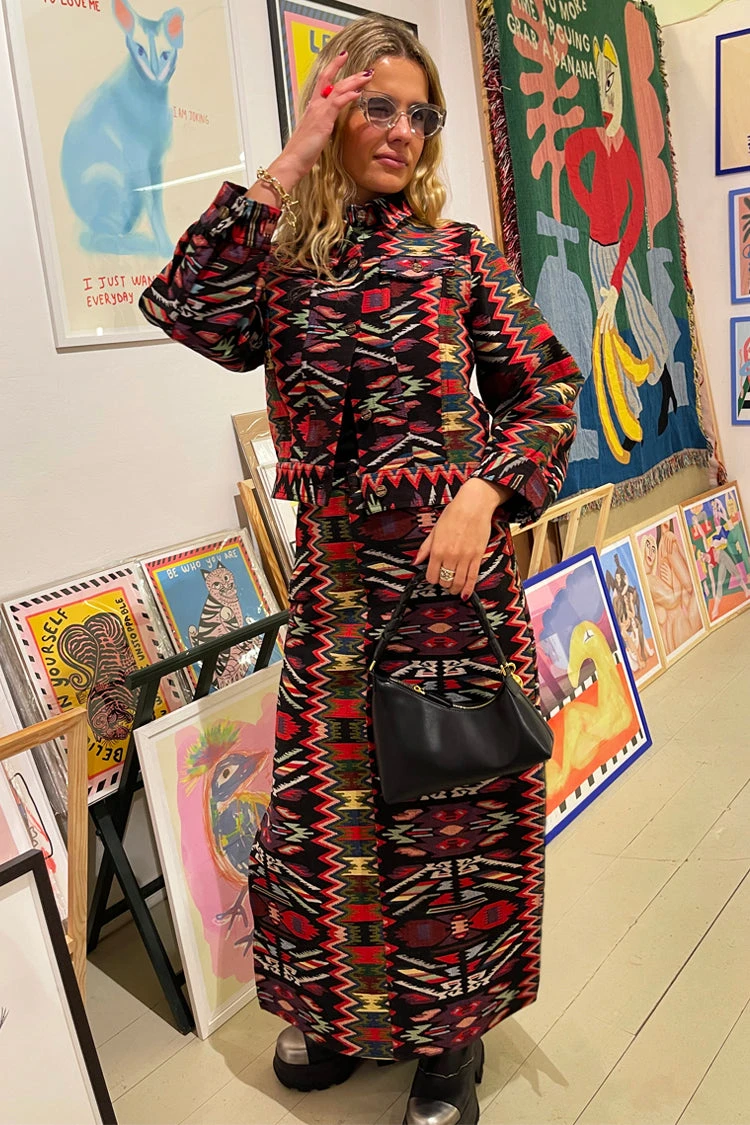 Maxi skirts are trending but timeless. So elegantly chic, and easy to throw on with everything. This bold abstract print is flecked with different shades of red, and is truly a one of a kind. The side slits make showcase a little bit of leg and make it comfortable to walk or dance in. Continue the print with an oversized white tee and the matching jacket.