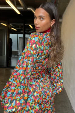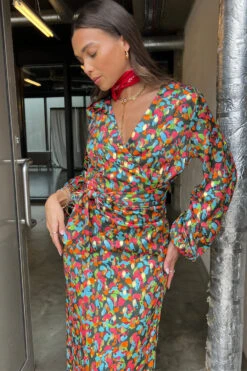 Our classic wrap dress in a gorgeous mixed colour palette, with gold flecks that will catch the sunlight throughout spring. We have been working hard to improve our fabric bases, and this viscose feels super heavy and luxurious. It creates a drapey fit that can be left loose for a more boho vibe or defined at the waist like a classic wrap. Tie at the back if you prefer a clean non-bow look. Elasticated cuffs that cut off at the wrists but can be rolled up to the elbow for more volume, as shown in pictures.