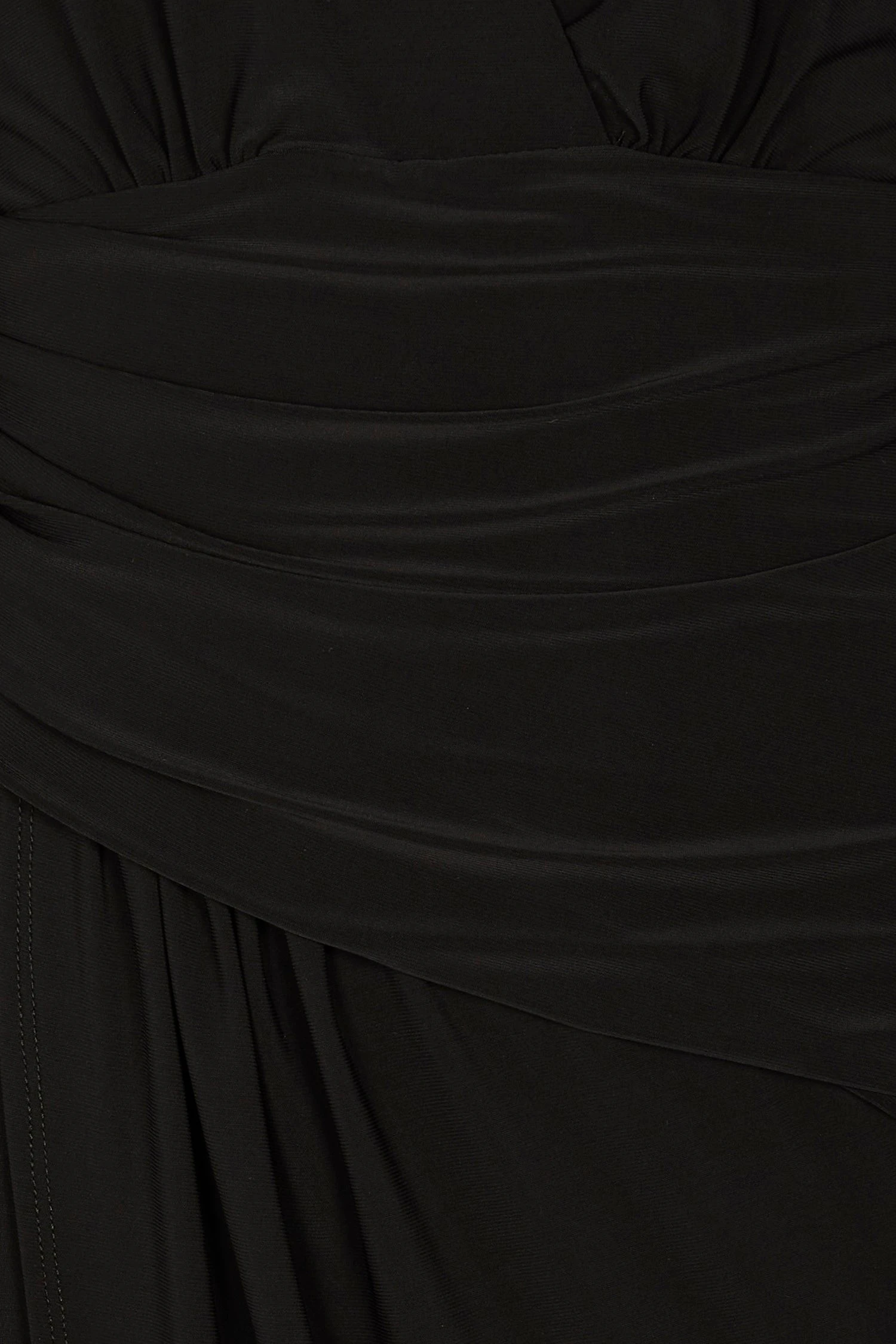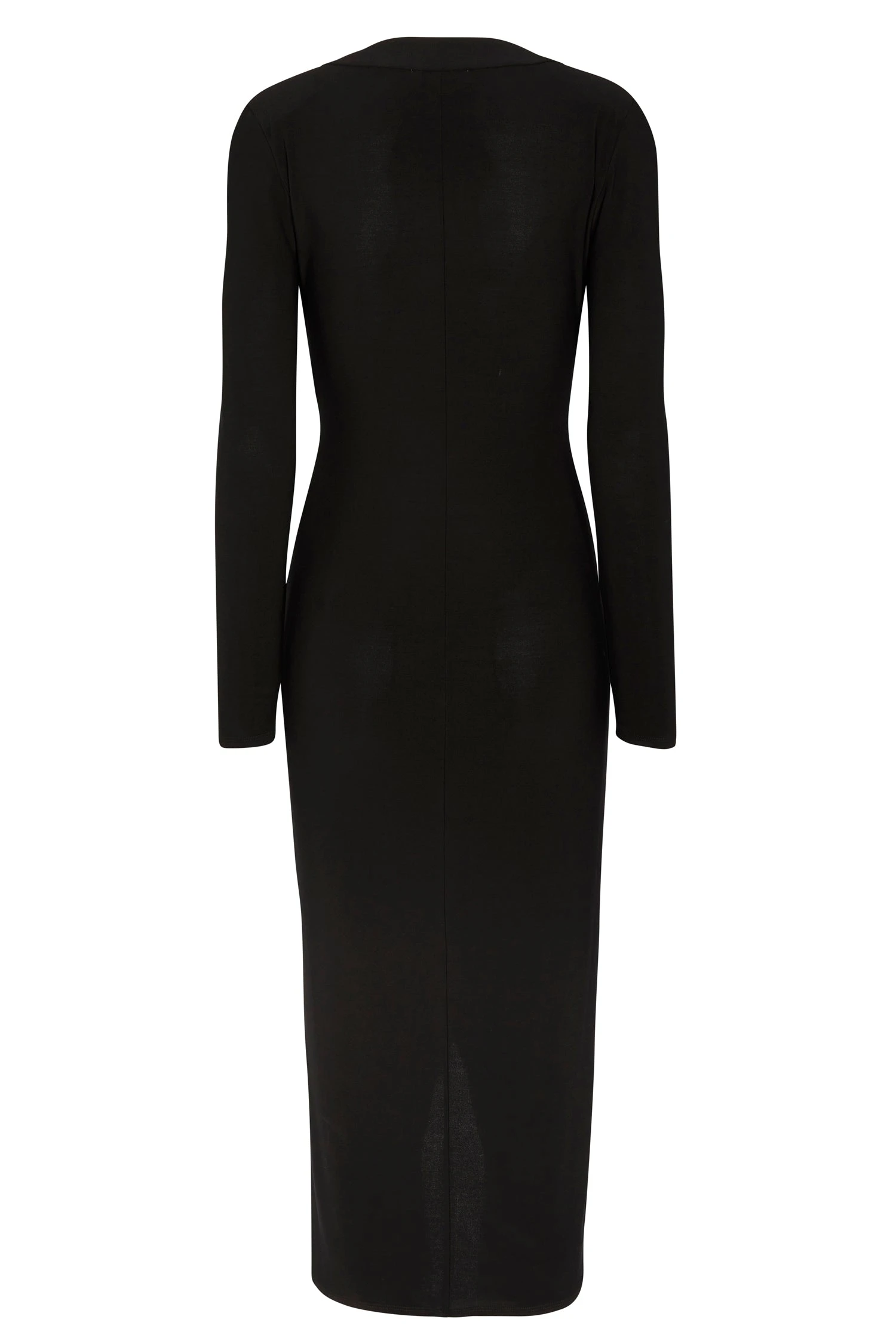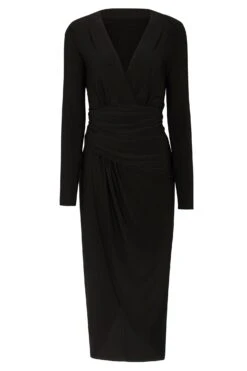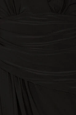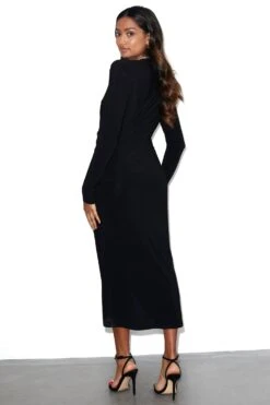 A sleek black midaxi draped into a timeless crossover detail, perfect for sculpting the figure. A deep V neck and boxy shoulders create a luxurious structured silhouette, designed for evening events – dinner parties, festivities, or date night. Cut from a soft heavy fabric with lots of stretch.