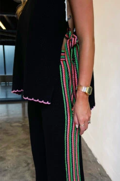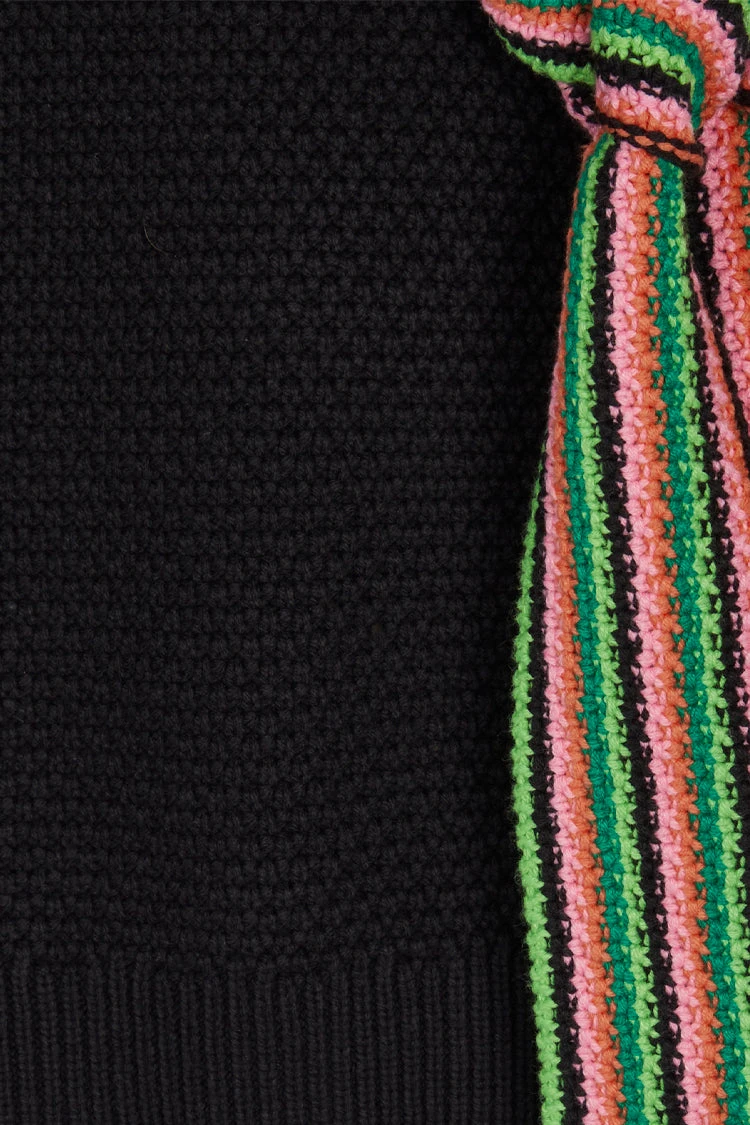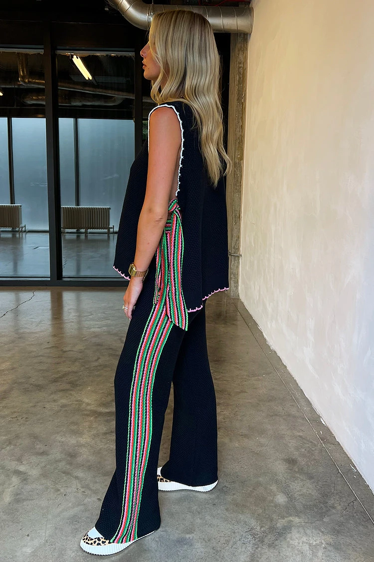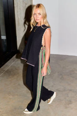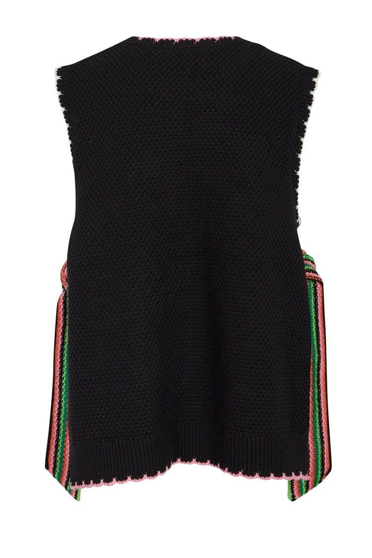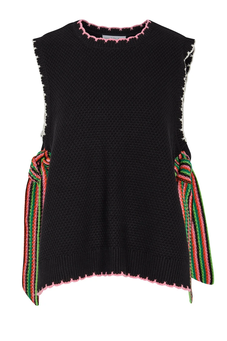 Knitted vests are this seasons most popular style. A black knit trimmed with a colour contrasting tipping detail. Bold striped ties close the open sides of the vest, and can be tied in a big bow or a knot. Layer it with a tee or wear it solo for the cool transition to Autumn. The relaxed and adjustable fit makes it the perfect option for bump dressing or breastfeeding.