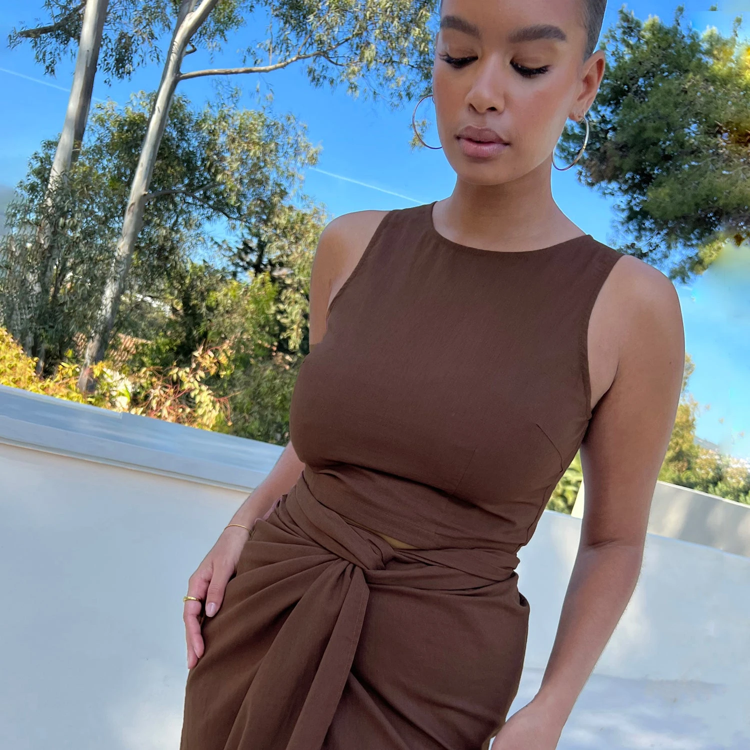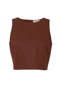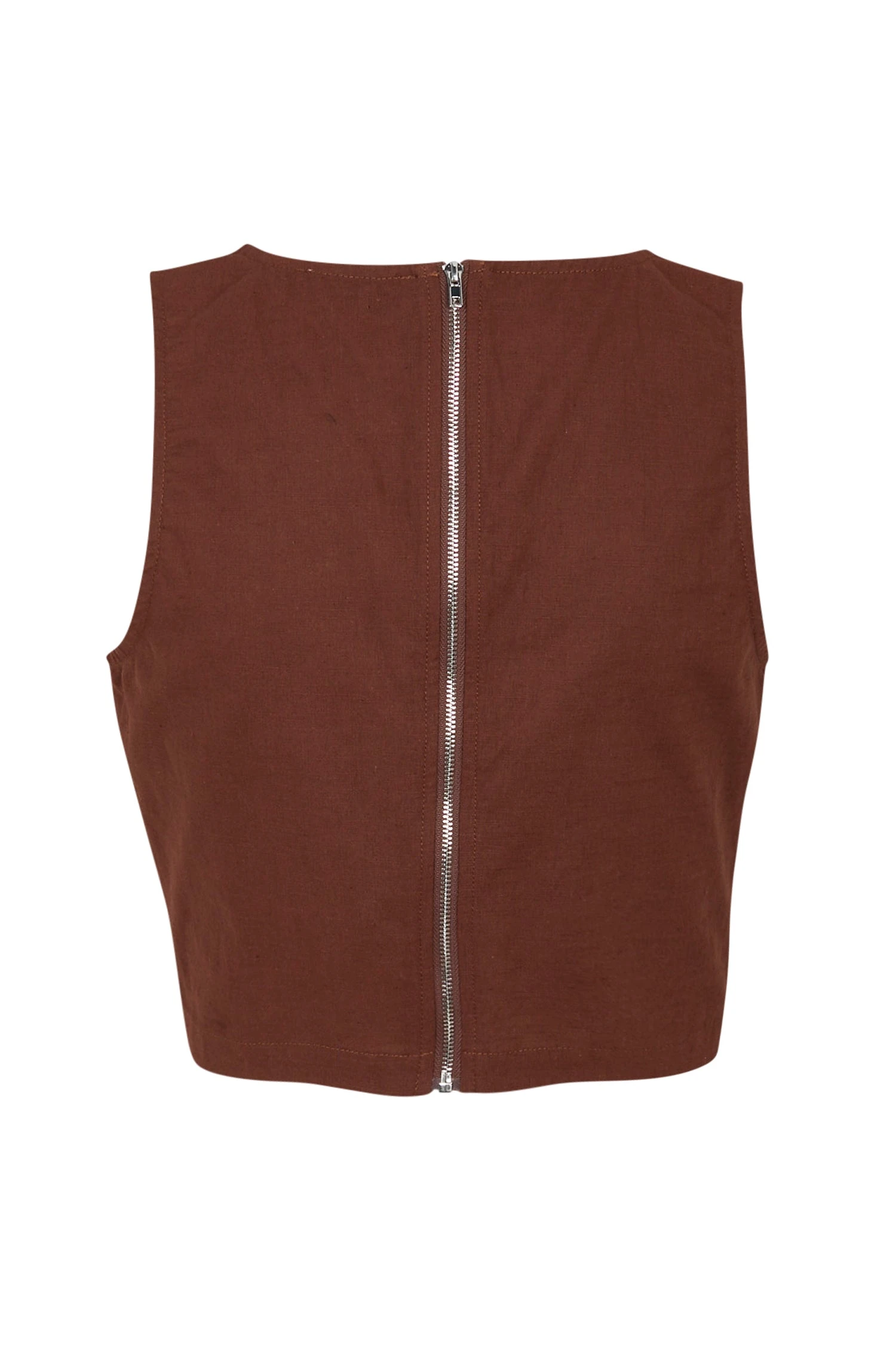A racer top in a soft brown Cotton Linen with a silver back zip. With a high round neck and darts on the bust. Pair with the matching Brown Linen Jaspre or dress down with jeans and sandals.