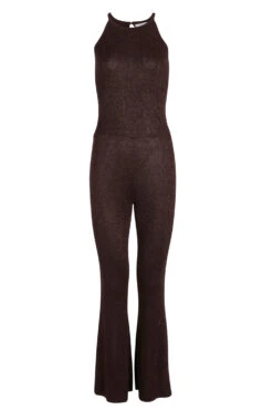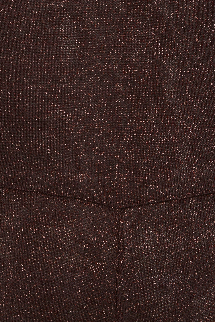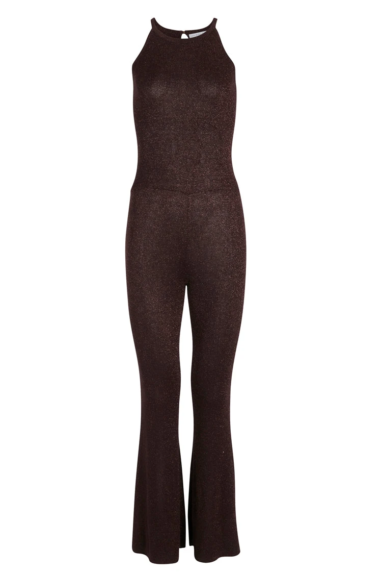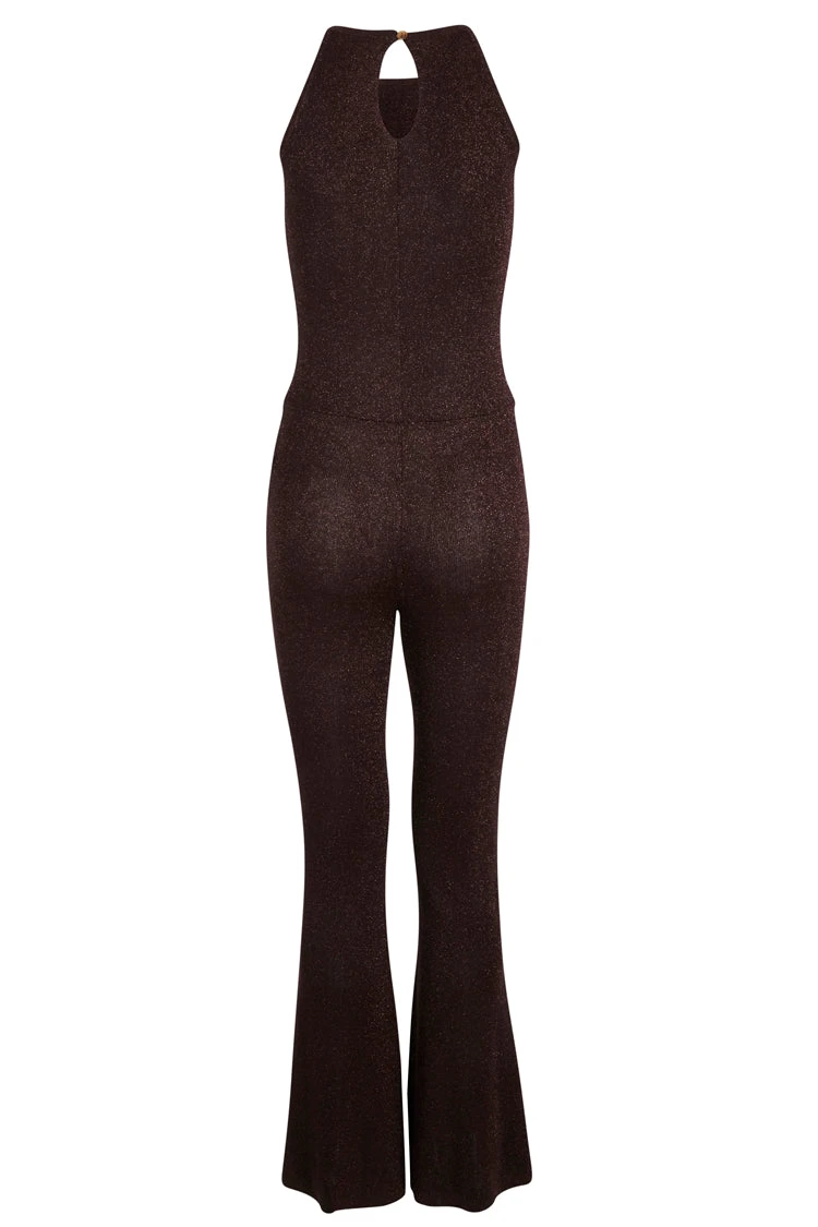 A fun and playful jumpsuit in a luxurious and stretchy bronze fabric with sparkles that catch and glimmer in the light. Figure hugging fit with a flared leg for that feminine edge. So gorgeous with a tee or jacket or as is with platform heels.