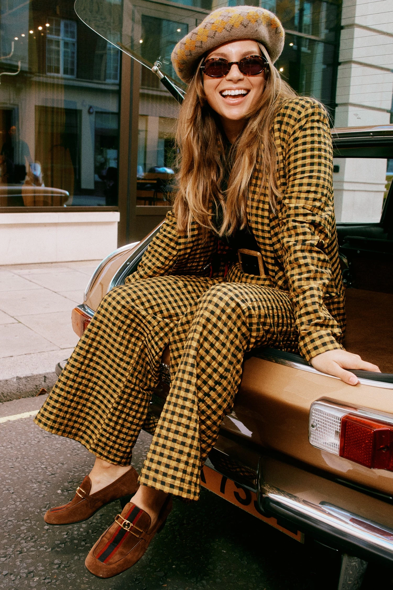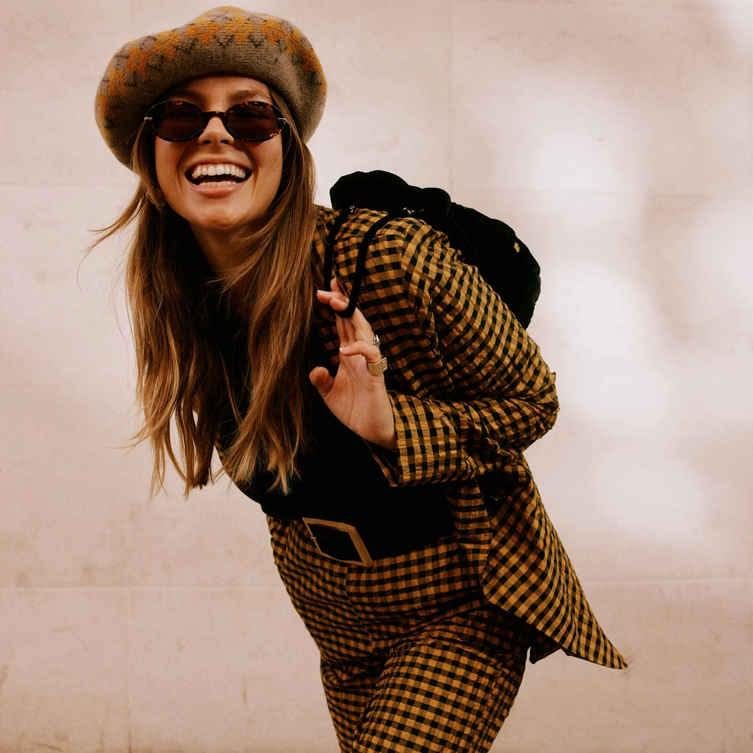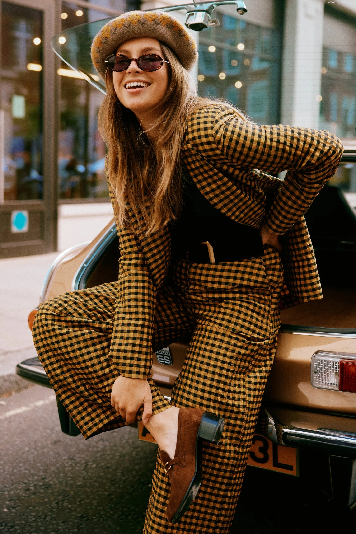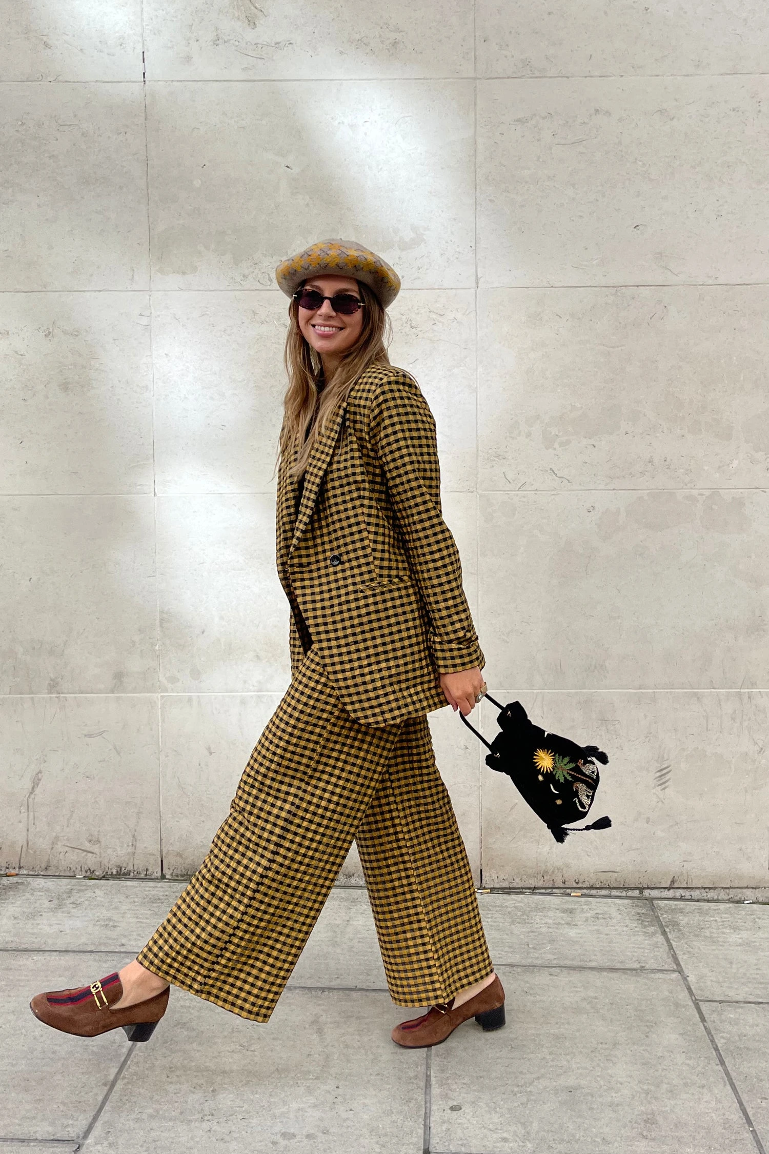 A structured double breasted blazer decorated with contrasting black and yellow gingham. Wear with a sleek all black outfit or pair with the matching Check trouser for an eccentric suiting look. Style with boots and big sunnies!