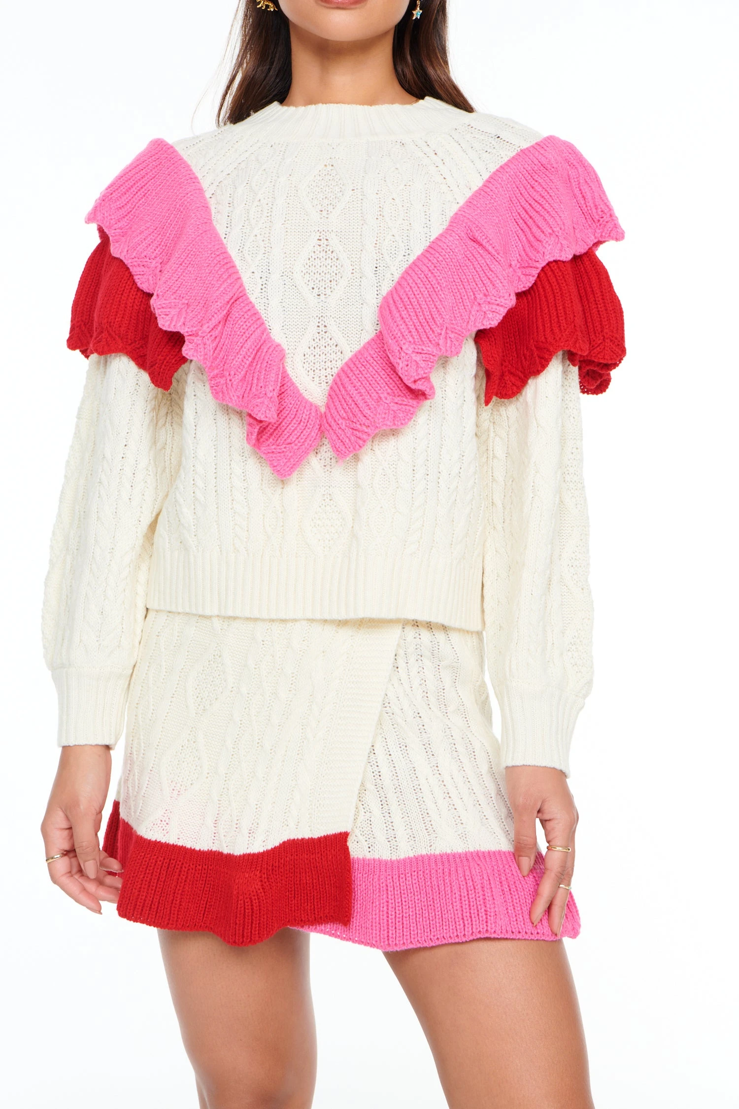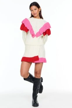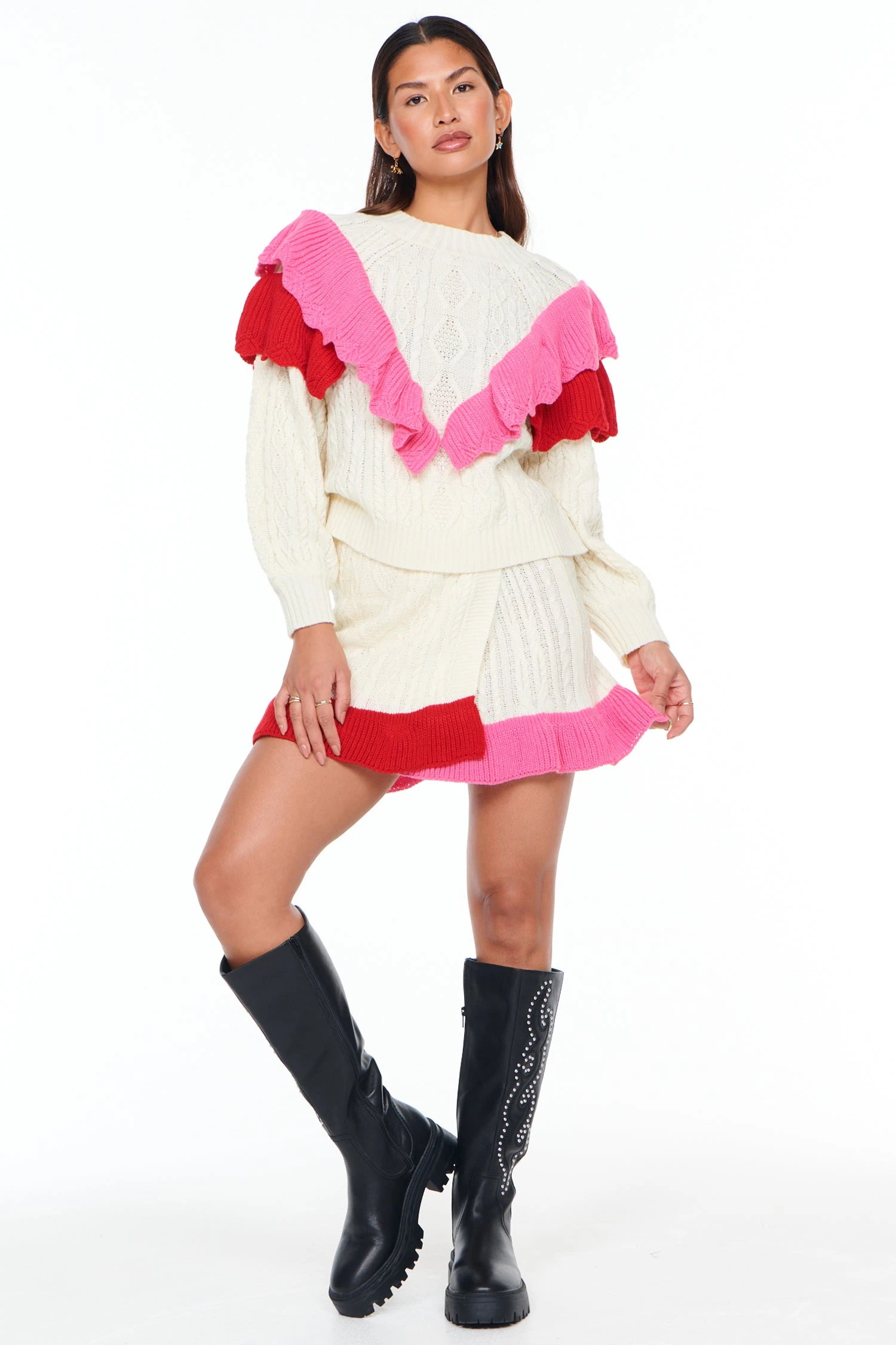 Beautiful and unique, this skirt has been spun with soft and cosy fabrics. Featuring an elasticated waistband with a colour clash wrap over style. Perfect for this season with the matching jumper and boots.