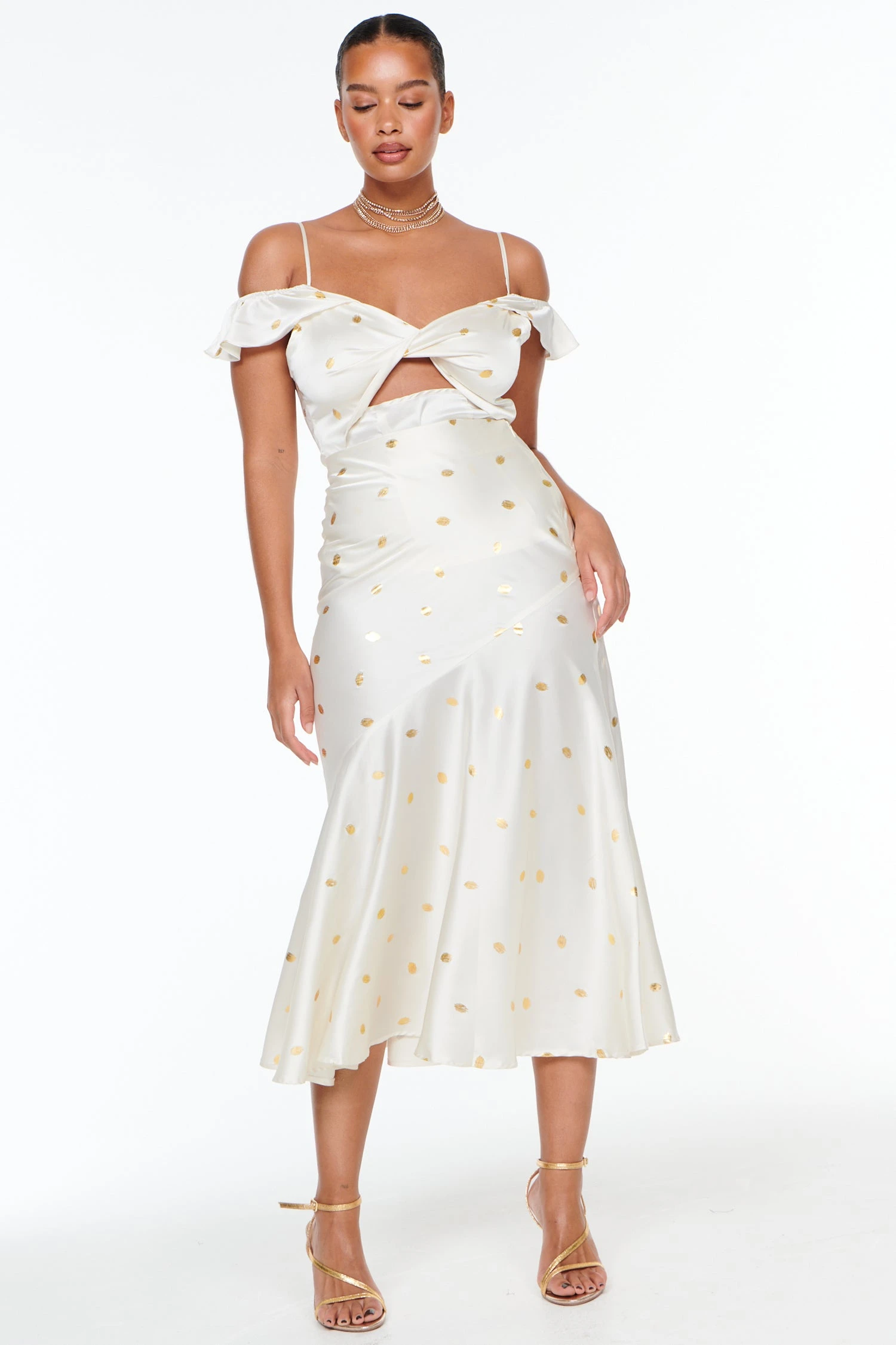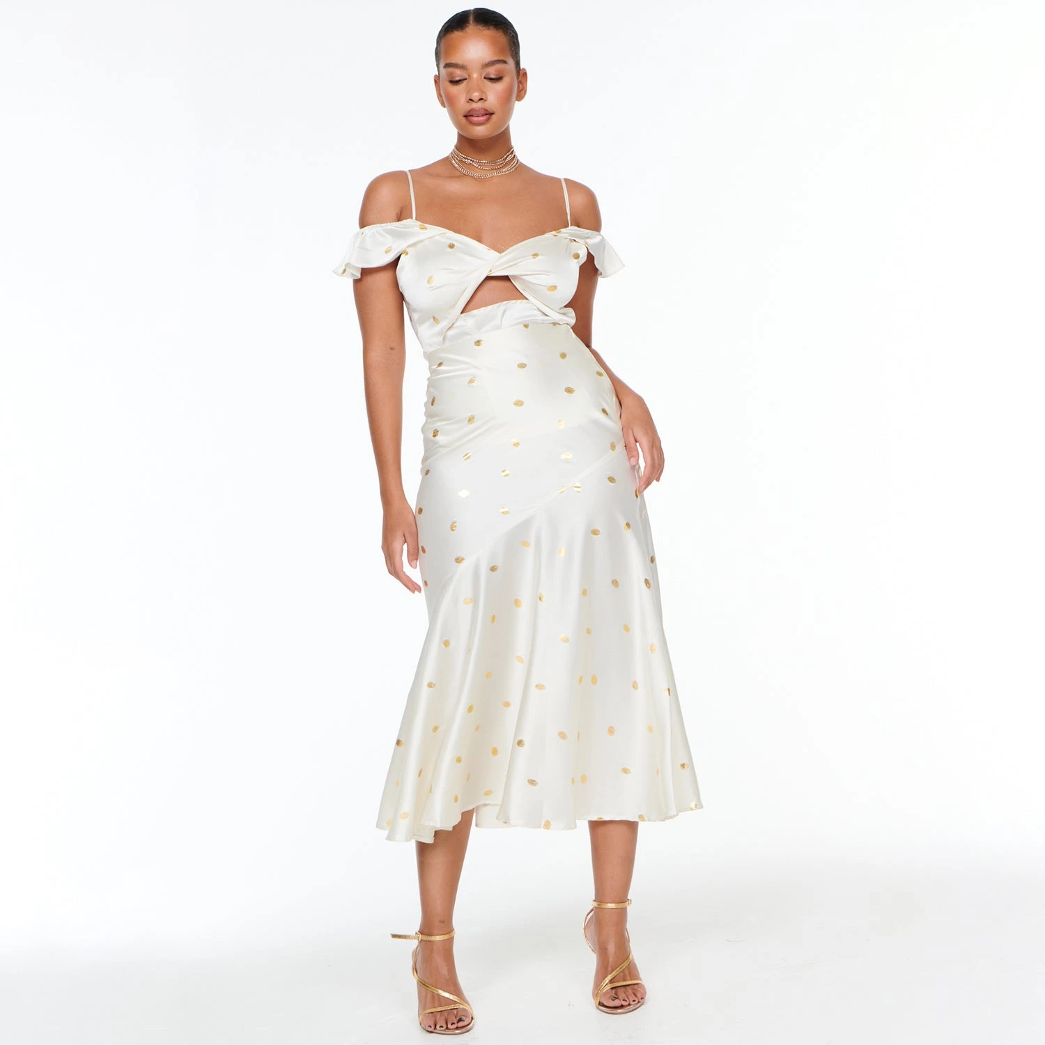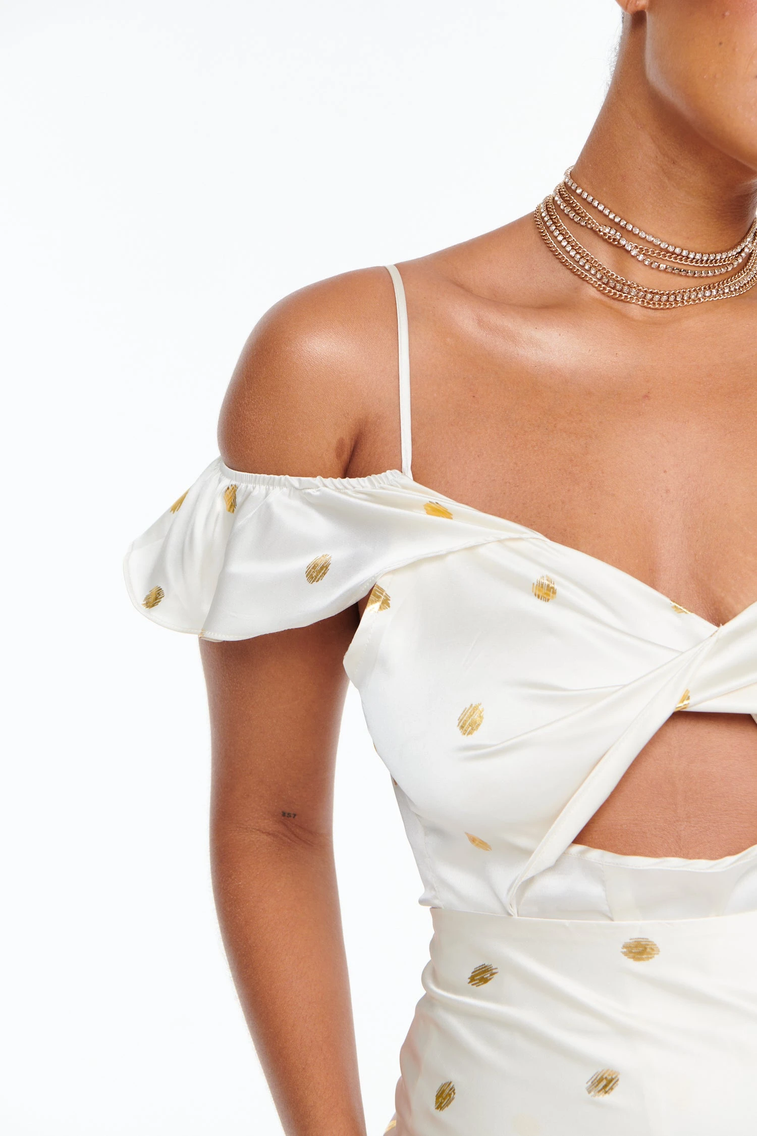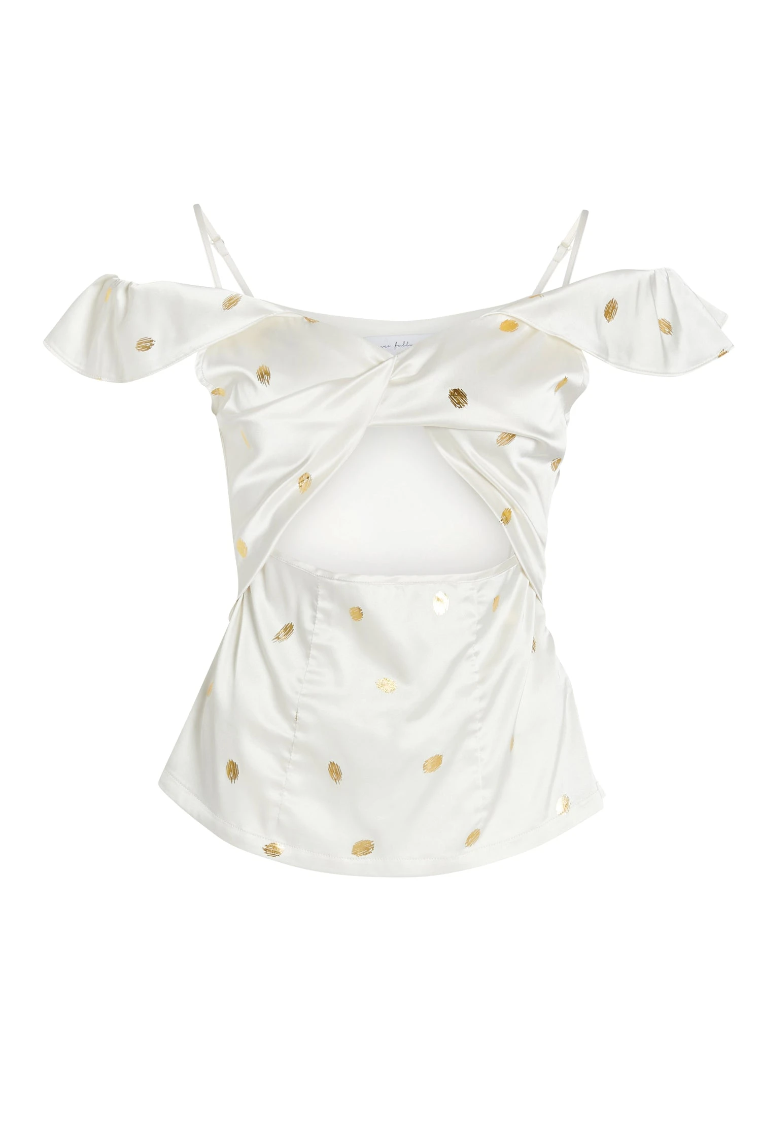 This glossy two piece is forever-flattering and made to turn heads, the gold spotty embellishment is the perfect statement to this special occasion ready set. Perfectly paired with your favourite denim, leather trousers or the matching cami, there’s an outfit to suit all.. from parties to work and straight to the bar.