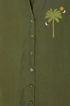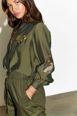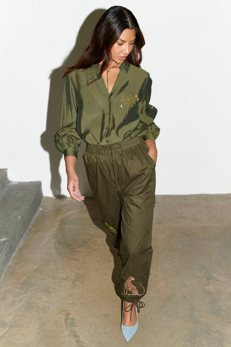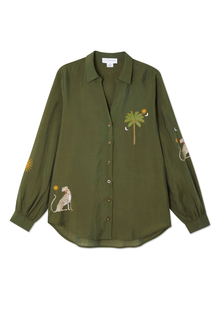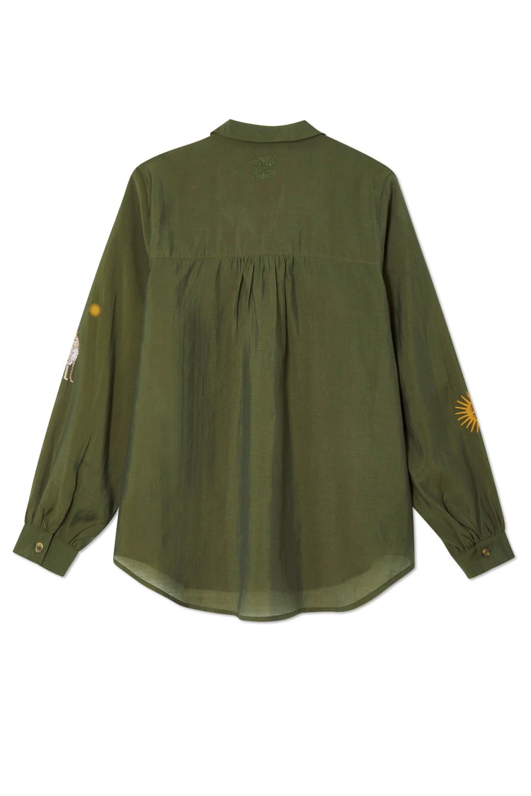 A super wearable khaki shirt, with blouson sleeves and a floaty silhouette. A very slight sheerness for a luxe and lightweight feel but solid enough for everyday work wear. We have added contrast tortoise summarys for an extra touch of interest and printed it with emblems that are a signature to our brand