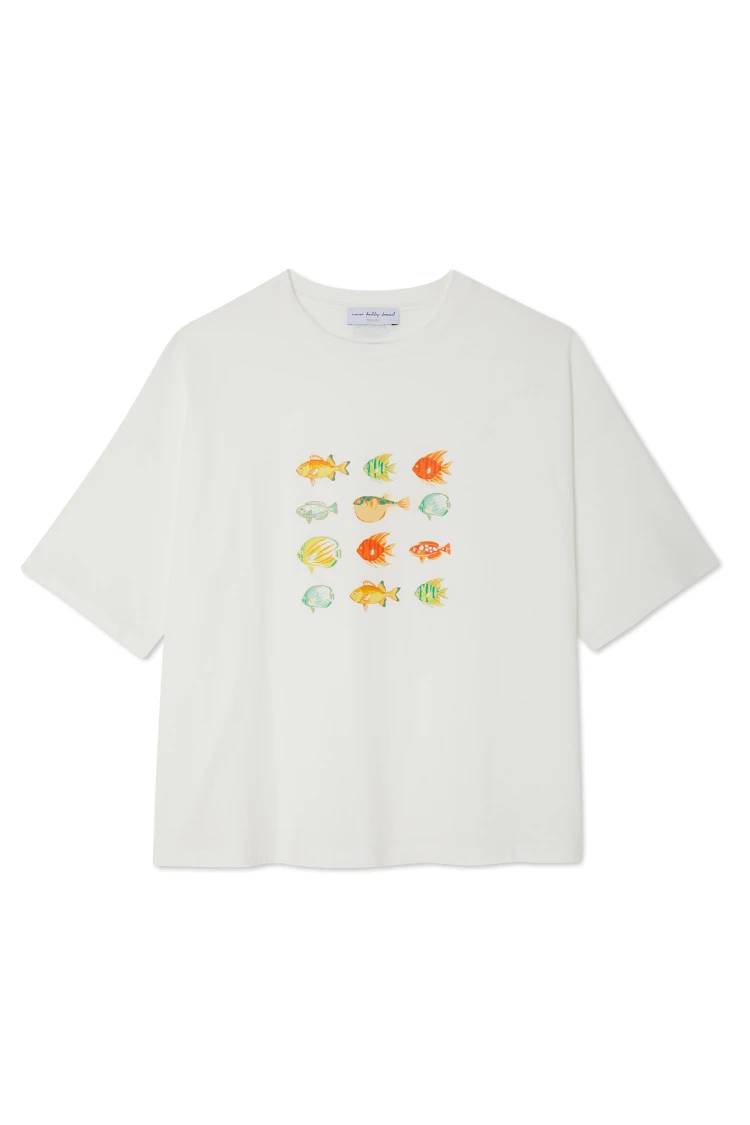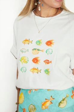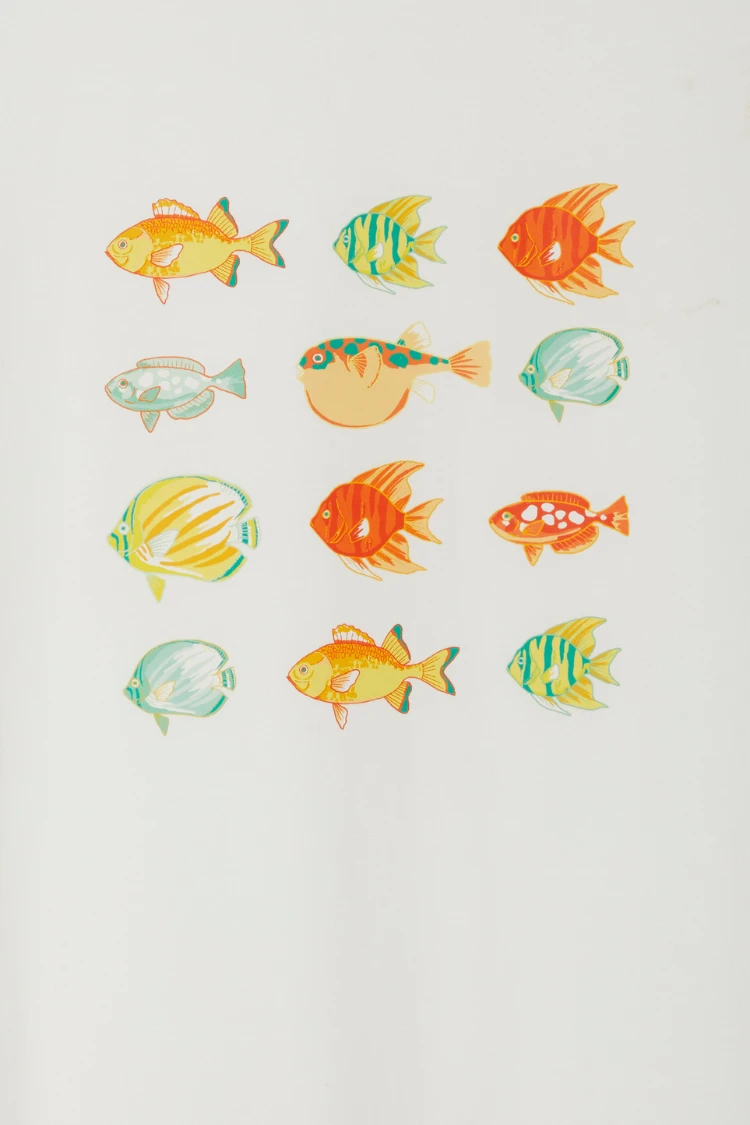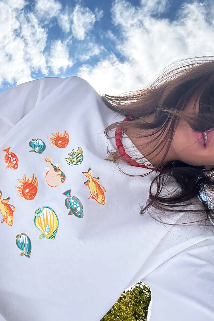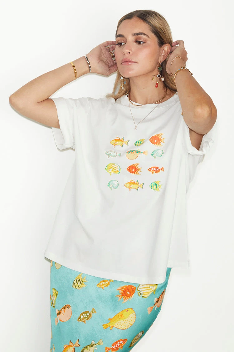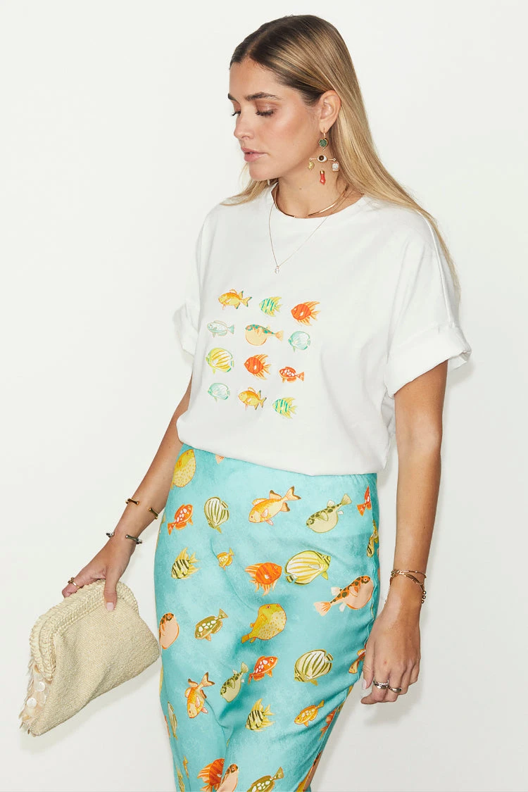 The Atlantis collection follows its namesake of the lost underwater city by drawing inspiration from the ocean depths. Dive deep into this aquamarine toned print and find playfully bold yellow, orange and green fishes swimming alongside each other. Notably ‘sardinecore’ was an emerging trend last summer with its influence reaching fashion, homeware and social media. Along with our ongoing love affair with the city of Lisbon, it was hard for our eyes not to be drawn to walls of beautifully decorated sardine tins at the local shops and markets. The collection is an ode to long summer days and dining by the sea.