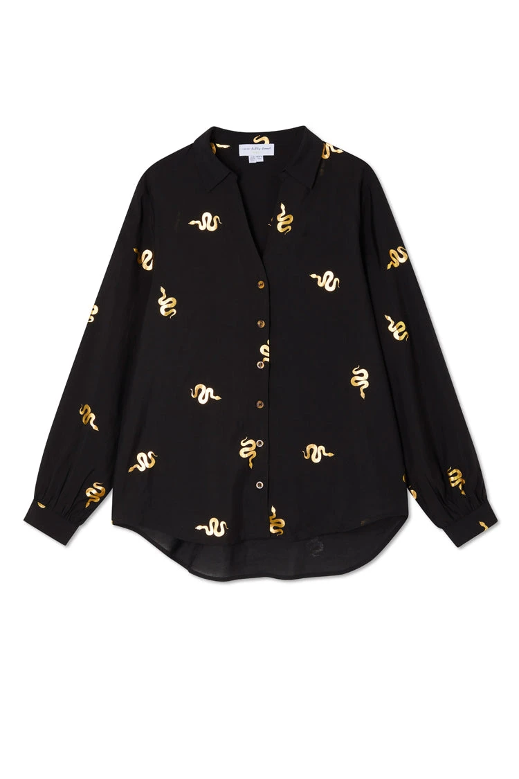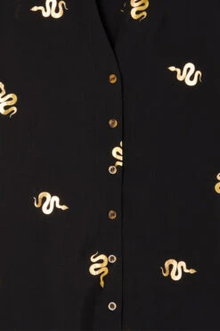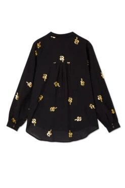 A super wearable black shirt, blouson sleeves and a floaty silhouette. A very slight sheerness for a luxe and lightweight feel but solid enough for everyday work wear. It features exclusive print designs, created by our in-house team. Snakes are a key element of our favorite manifestation theme (we like to hint towards it in everything we make), it feels quite grounded and balances out the femininity of the silhouette.