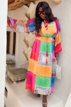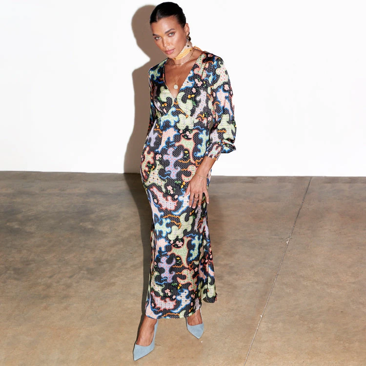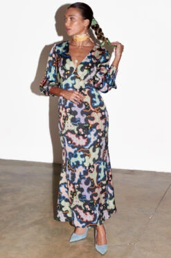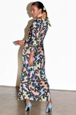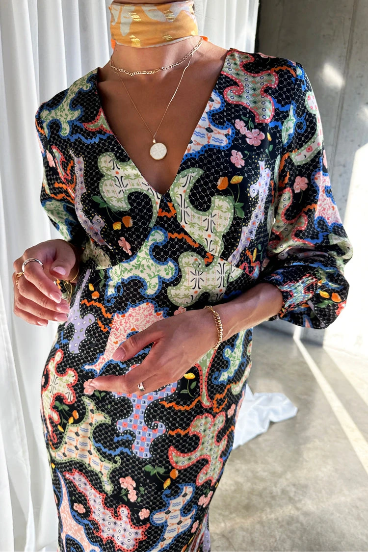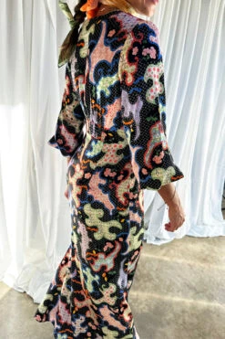 Made from a weighty gloss viscose that drapes and skims the curves, and creates gorgeously fluid movement as you walk (or dance). The print is made up of a patchwork of designs that we love – palms, stars, shells and LOADS more. The bold green pink and blue hues really pop against the black base. Softly pleated cups and darts along the front of the bodice give it a bit of a structured silhouette, but with a side zip and elasticated back panel, a comfortable fit is ensured.
