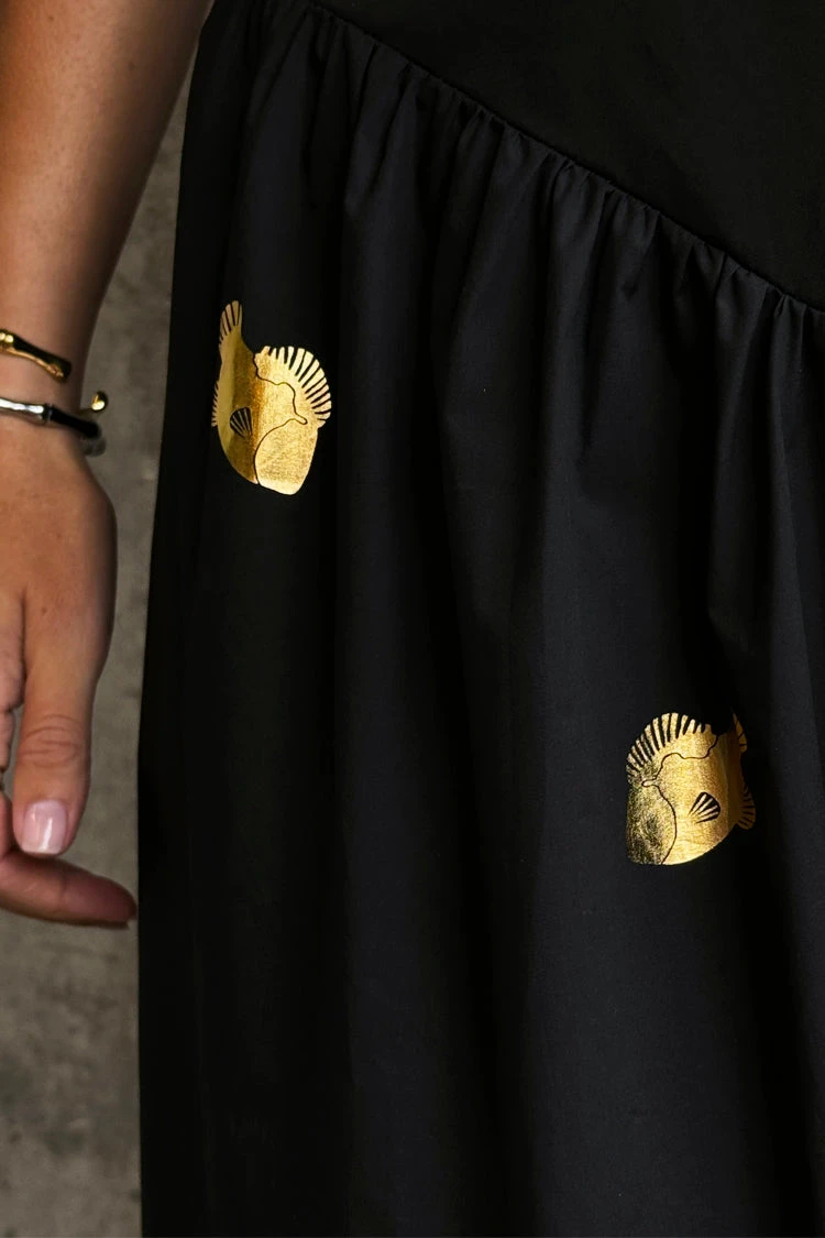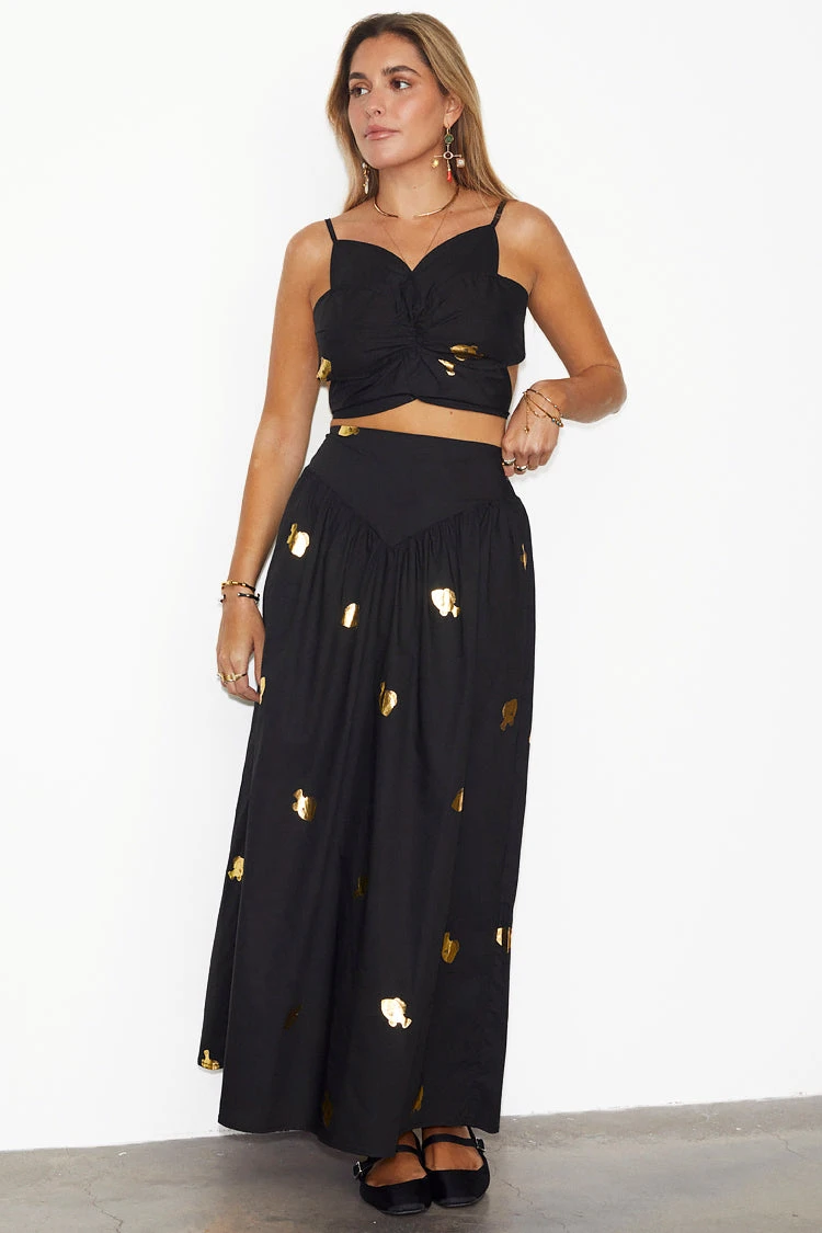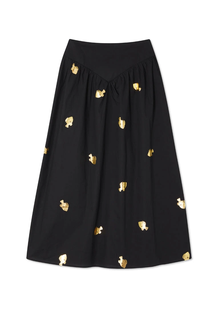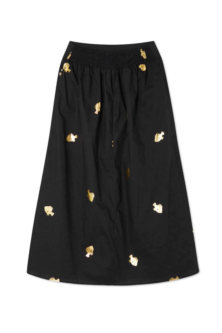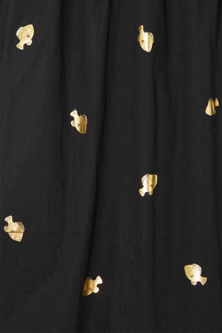 A maxi skirt dotted with little gold fish embellishments made from a metallic foil that glistens in the light, and really pops against the black base. It has a super flattering V shape waistband that pleats into a voluminous skirt. Pair it with a t-shirt or match it to the very special Dahlia top.