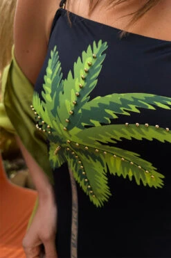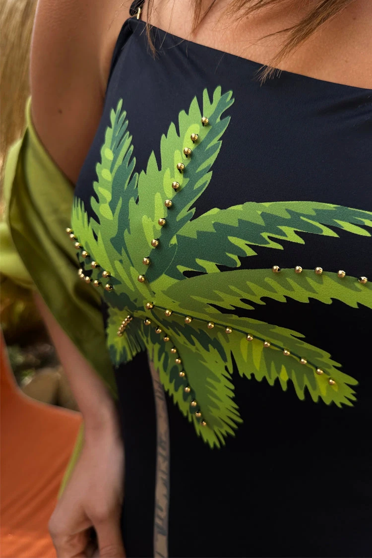 A bandeau swimsuit with detachable straps makes for endless vacation wear, especially a black base with a bold contrasting palm. Intricately beaded with little gold pearls for texture interest and to add a bit of metallic sparkle. Like all of our swimsuits, it doubles up as a bodysuit to get the most wear out of this piece possible, and save room in your suitcase.