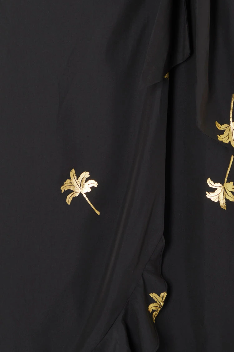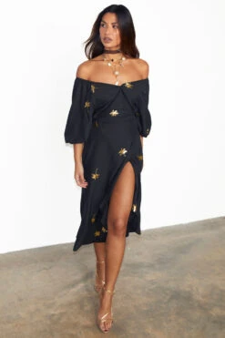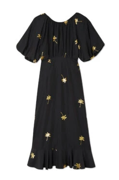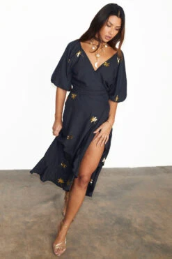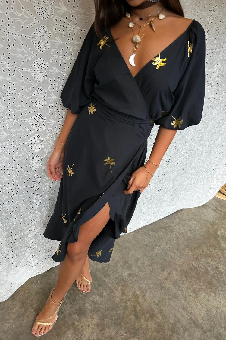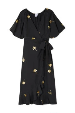 Elasticated shoulder seams mean you can wear it on or off the shoulder, and a little summary on the neckline for adjustable closure on the chest. Super dramatic blouson sleeves give it a soft feminine edge that ties together with the frilled hem skirt. A wrap waist is so classic for defining the waist and ensuring a comfortable fit.