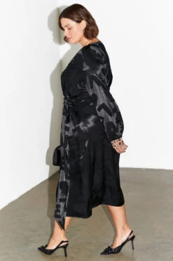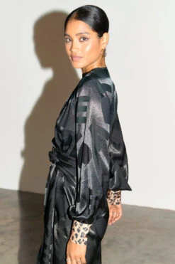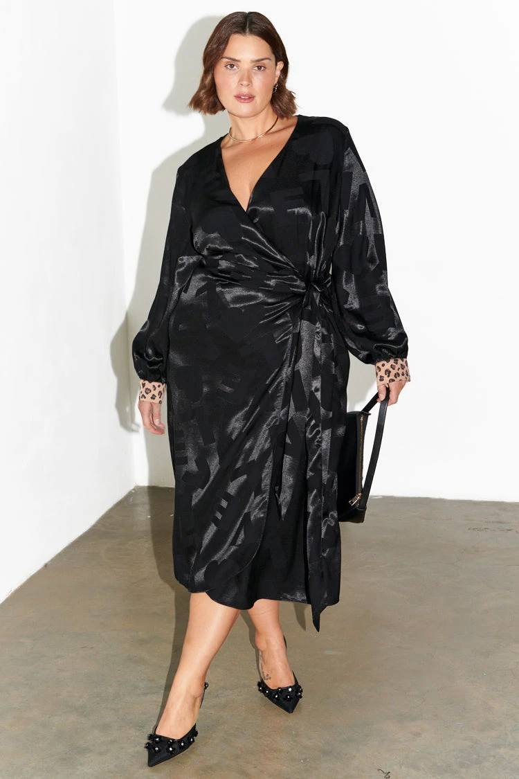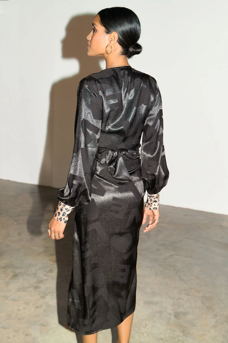 Designed in a wrap silhouette from a glossy satin, our Viennas are the ultimate dress for effortless styling. Throw on with a pair of strappy heels, sneakers, or chunky boots. Adjustable styling due to its wrap waist feature, you can wear as loose or as fitted as you choose. Printed in a classic jacquard LOVE print with contrasting animal print cuffs.