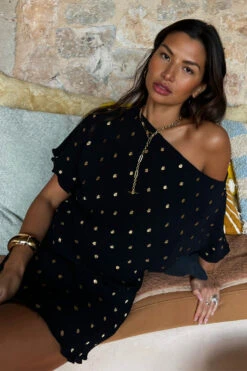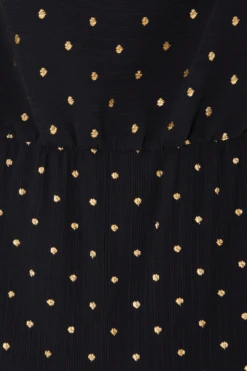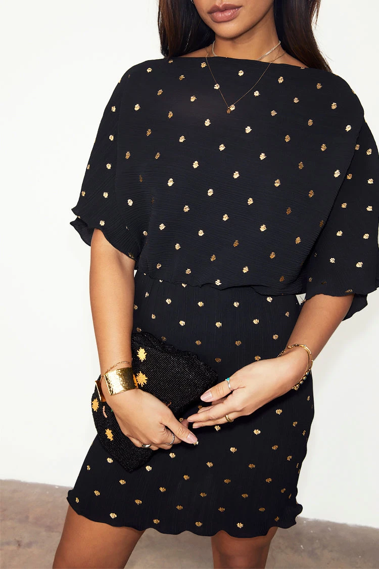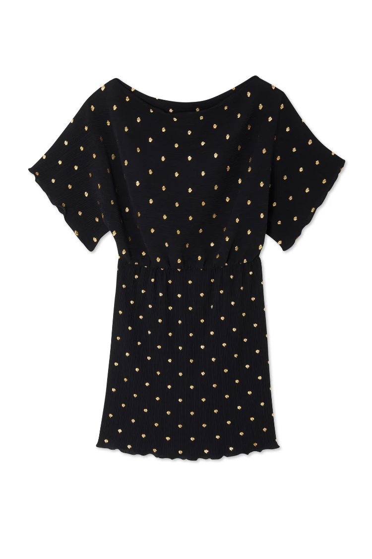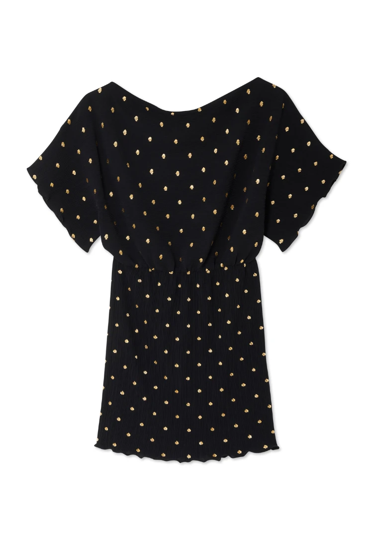 A reedition of our bestselling Plisse Tilly dress in a brand new mini silhouette. Made with a plisse fabric, hundreds of tiny little pleats and an elasticated waistband means it has extra give, super comfortable fit and is perfect for bump dressing. Speckled with little gold metallic dots that are highlighted by the sunshine, it’s a suitcase staple.