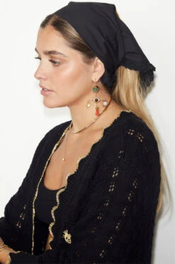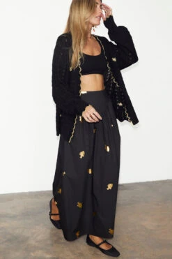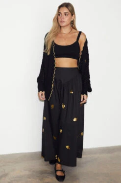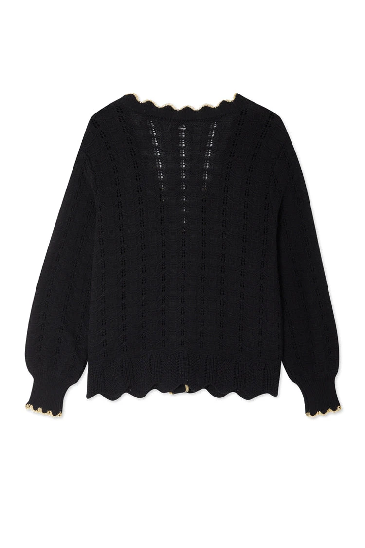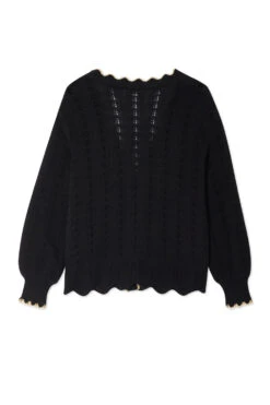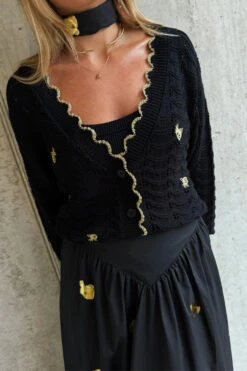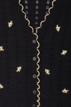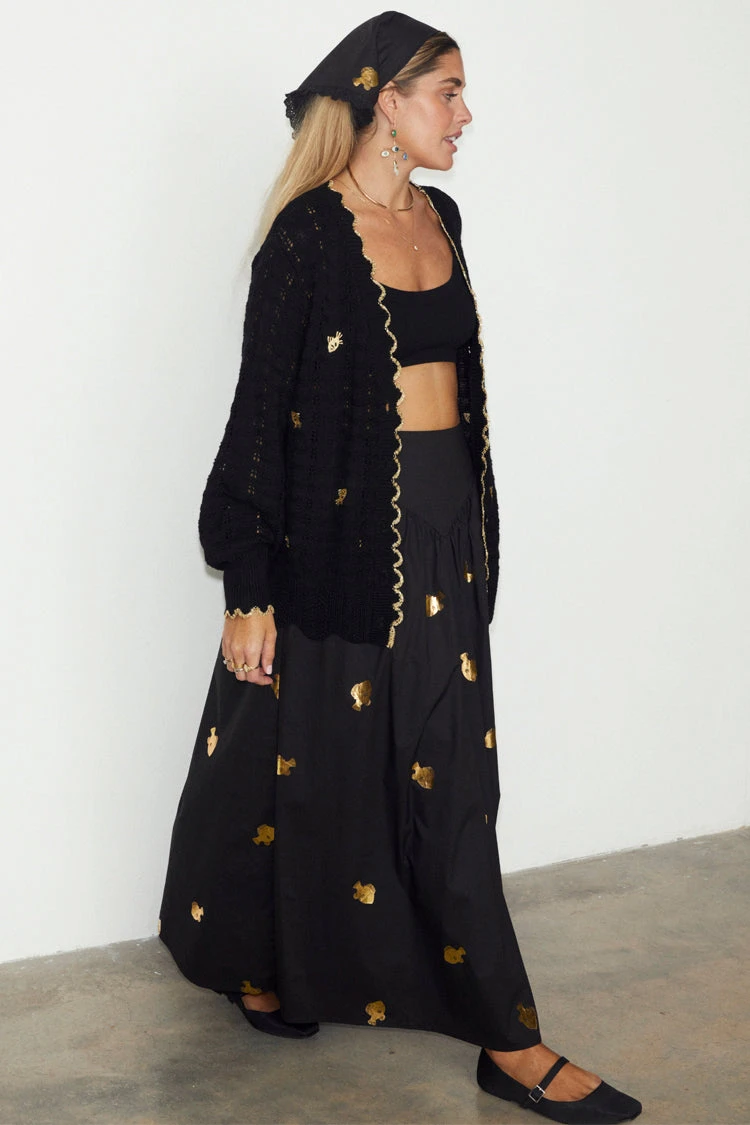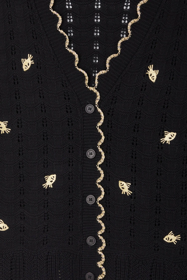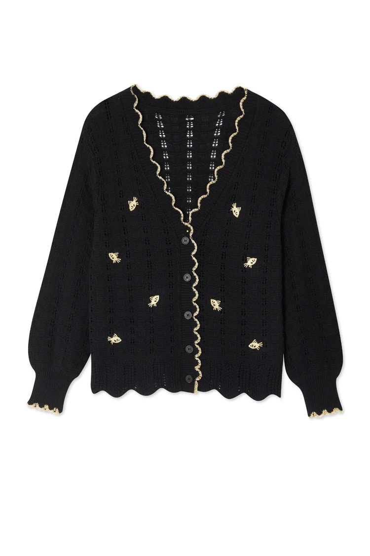 A knitted cardigan embroidered with metallic gold fish that sparkle when caught by the sun. It has a slightly slouchy fit that makes it feel a bit bohemian, and a scalloped trim woven with shimmering gold threads. The summary down front makes it bump and breastfeeding friendly, and means you can layer up or wear it as a top.