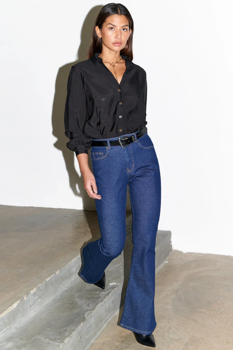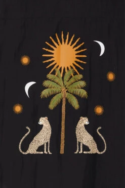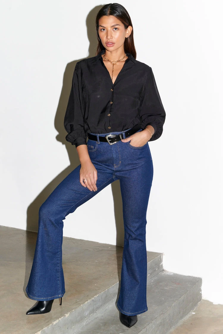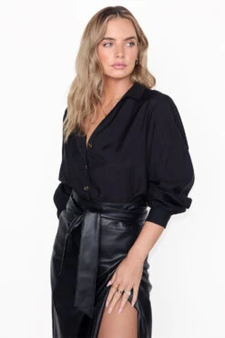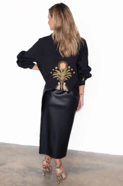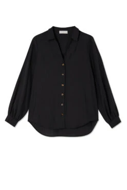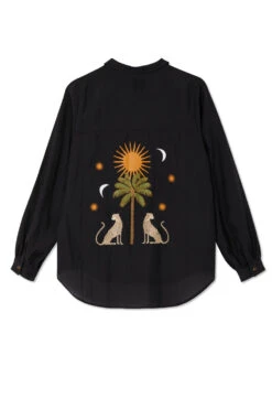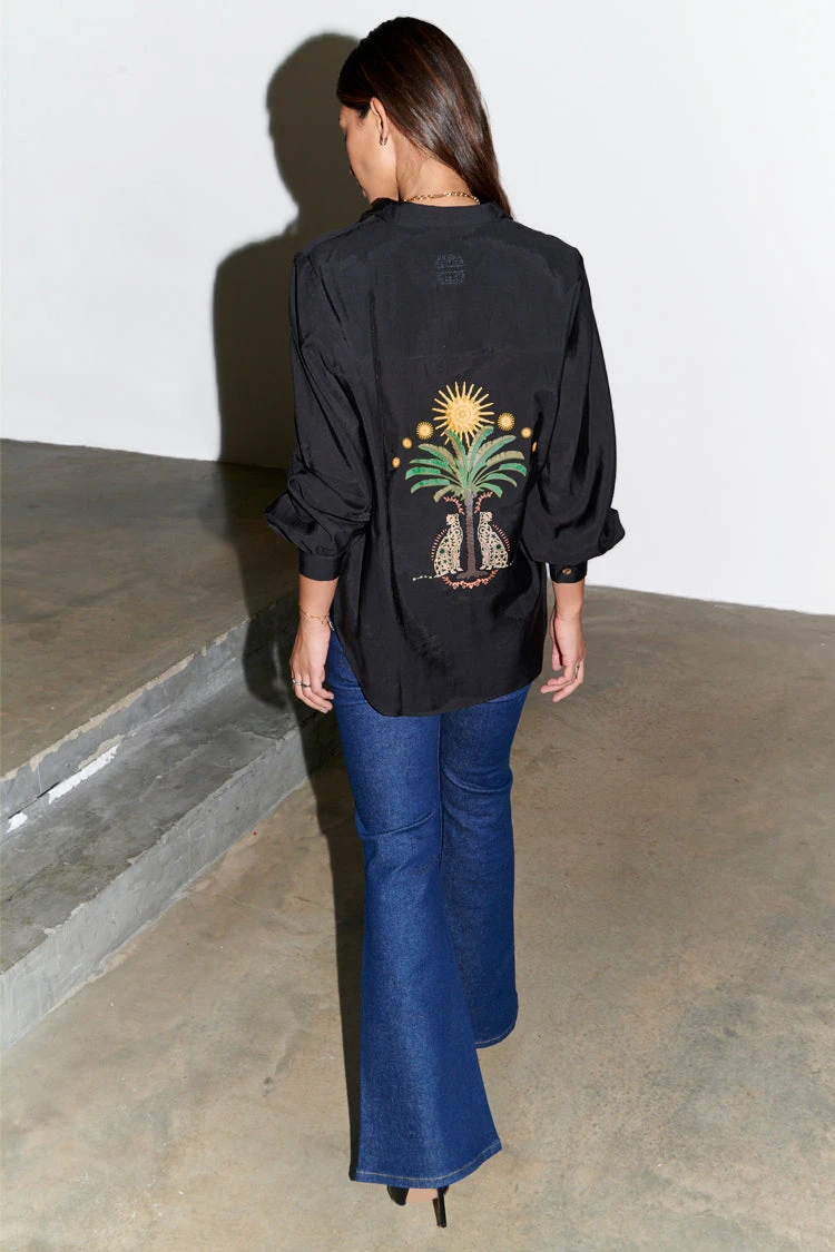 A super wearable black shirt, blouson sleeves and a floaty silhouette. It features our updated running wild emblems that are so transferable for every season. A very slight sheerness for a luxe and lightweight feel but solid enough for everyday work wear. We have added contrast tortoise summarys for an extra touch of interest and gorgeous embroidered logo on the back neck.