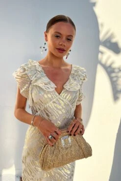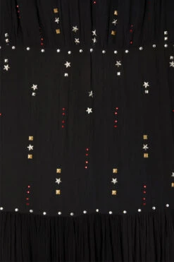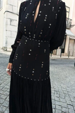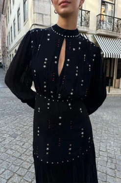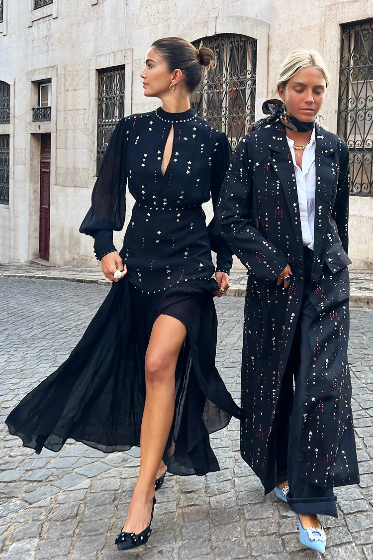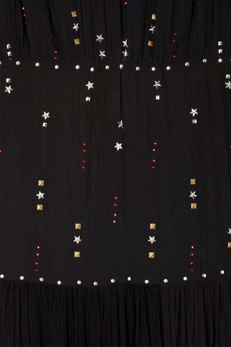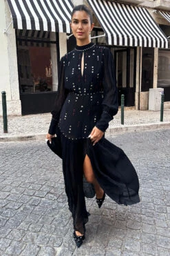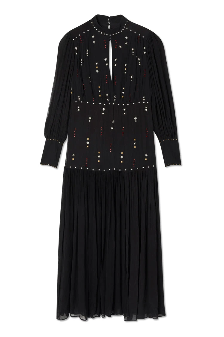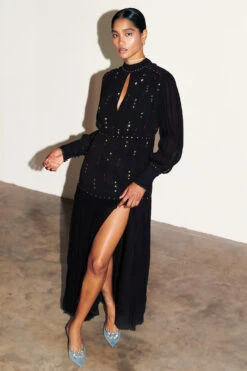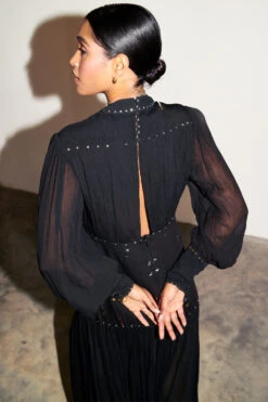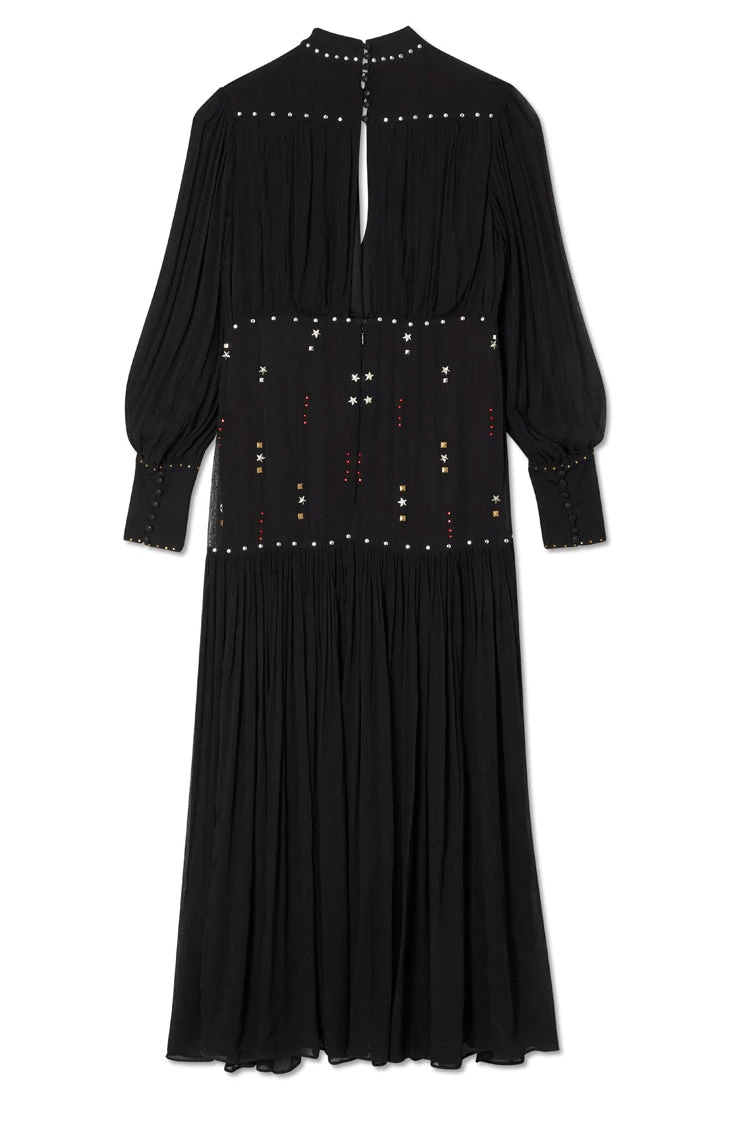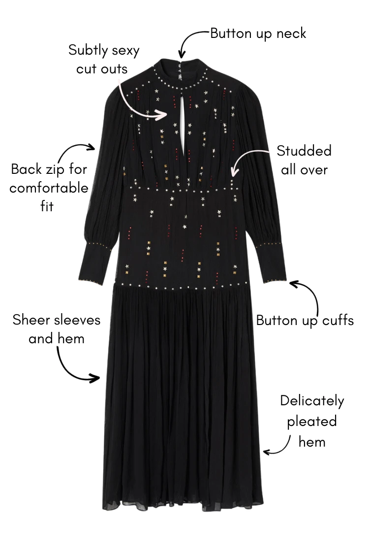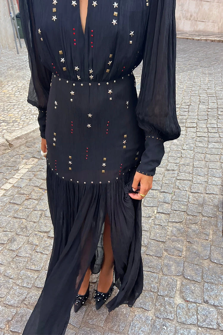 Dotted with metal studs in a classic and elegant maxi silhouette, this dress truly is one of a kind. Front and back cut outs for a sexy but subtle edge, and a leg slit to allow for gorgeous movement of the sheer hem. Drapey blouson sleeves make it look and feel so luxe, and we love to elevate it with a pointed toe heel.
