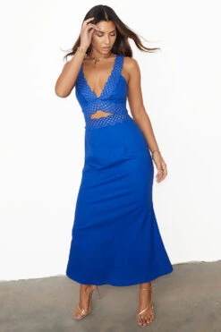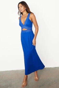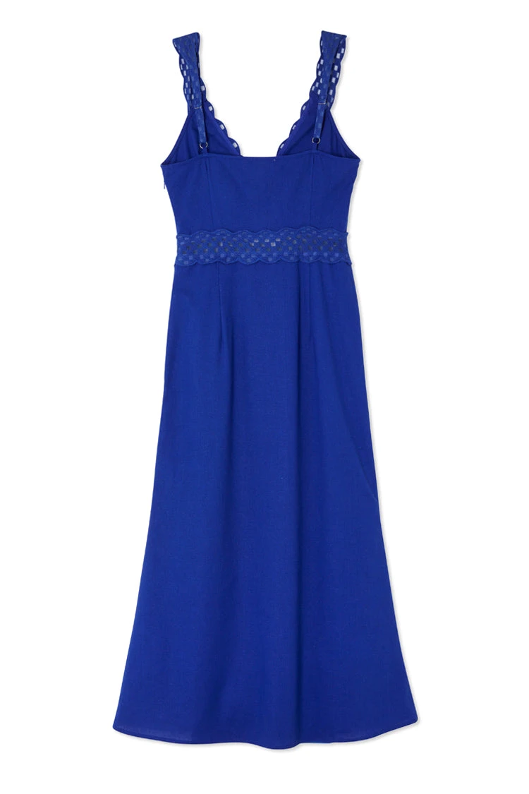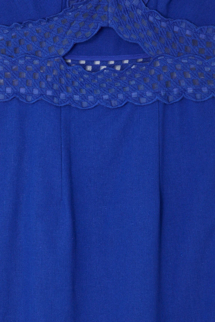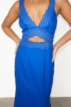 Gorgeous lace trim and purposeful cut outs elevate our blue mimi dress to give you that sexy yet elegant feel. In a light linen that adds an air of comfortability, this dress is perfect for any occasion whether its day or night.