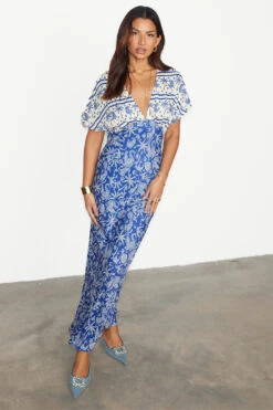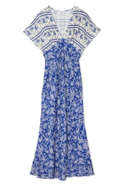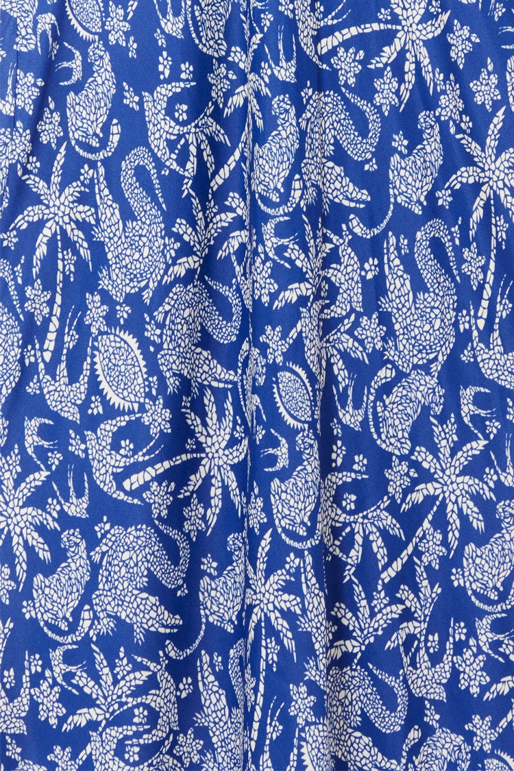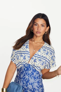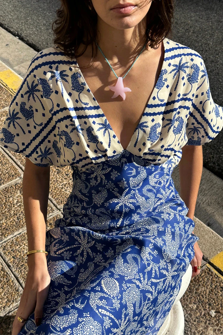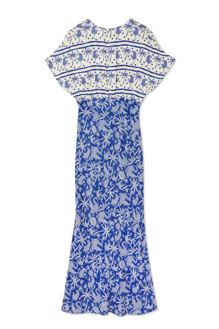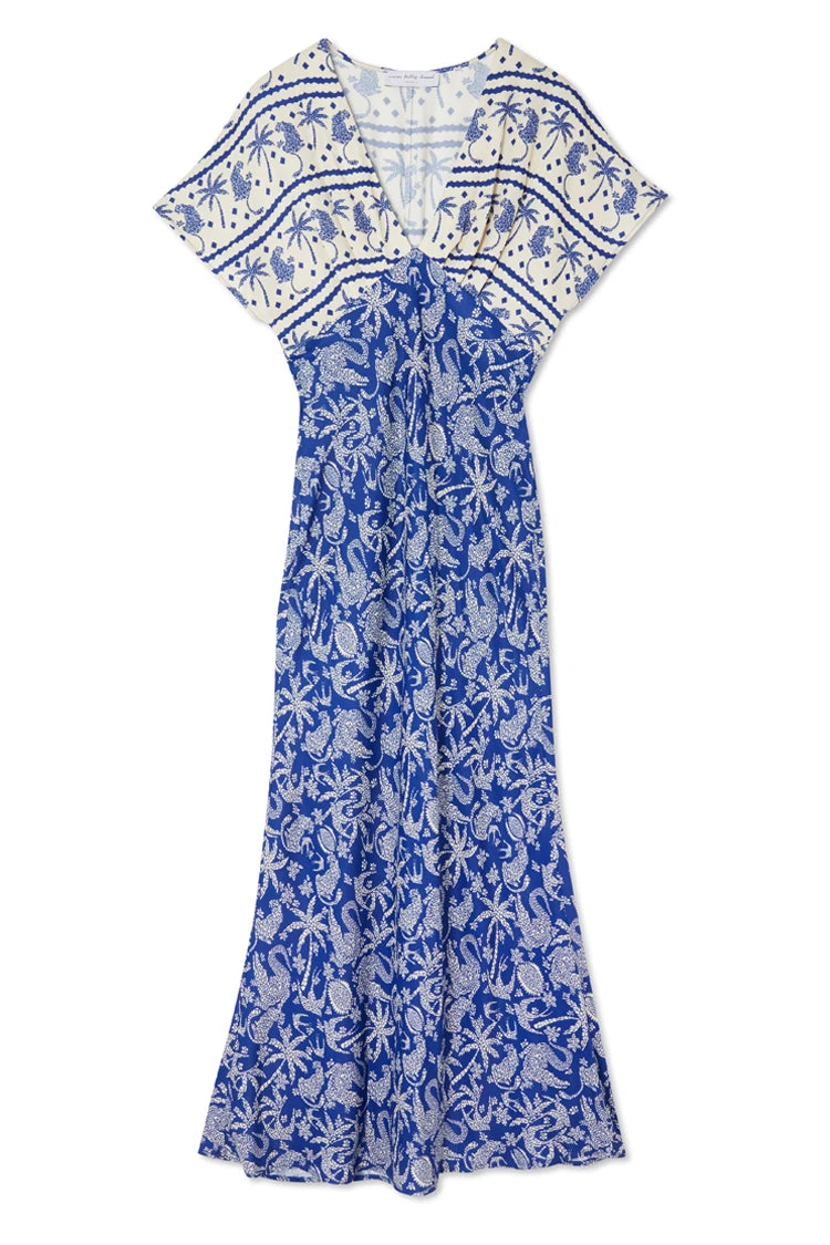 Influenced by traditional antique ceramic vases that have the most gorgeous intricate artworks painted upon them, we knew we wanted to create a print that had that ‘more than meets the eye’ attitude. We love to create prints within prints. This dress has an assortment of elements like palms, leopards, suns, birds and even crocodiles hidden within. The bestselling Elodie is a fitted shape with a really refined cap sleeve and V-neck combination that feels so elegant.