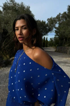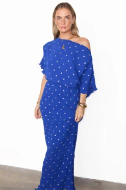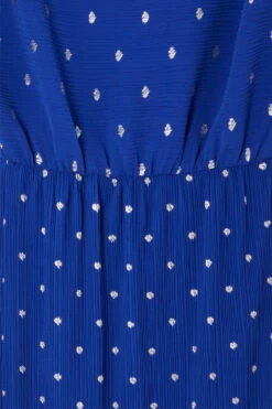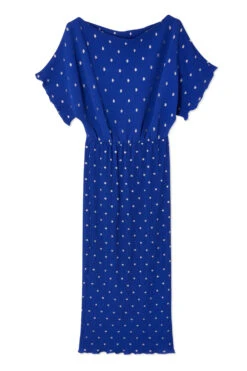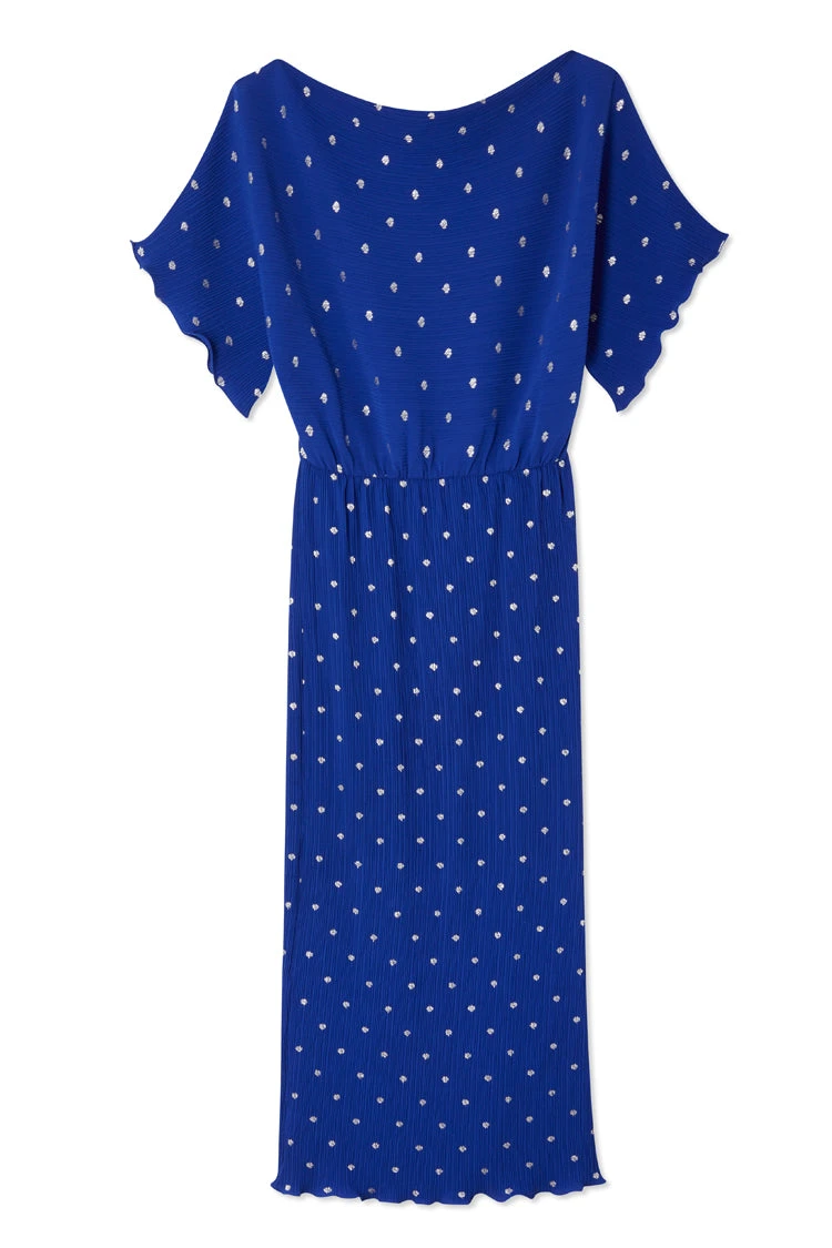 Baring a touch of skin with an effortless off the shoulder silhouette. Our classic plisse fabric in a deep cobalt blue, flecked with sparkling sliver dots. With an elasticated waist seam for a comfortable fit and definition on the figure (also great for bump dressing)!