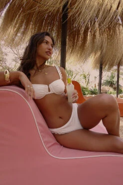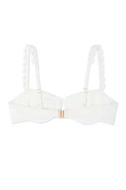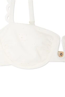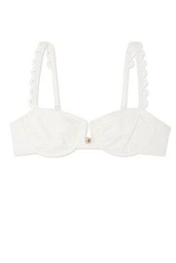 The ruched cups and deep u neckline paired with the intricate broderie fabric and delicate loop detailing make this the perfect item to add to your holiday wardrobe. Also available in black.