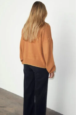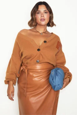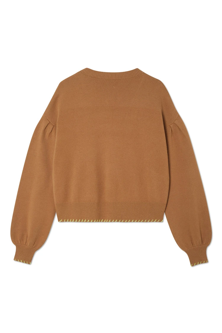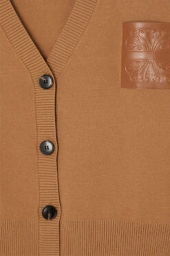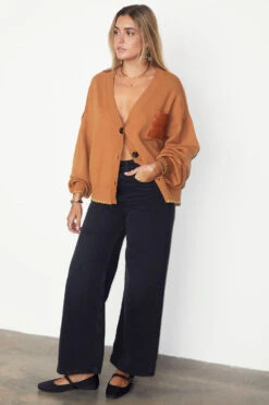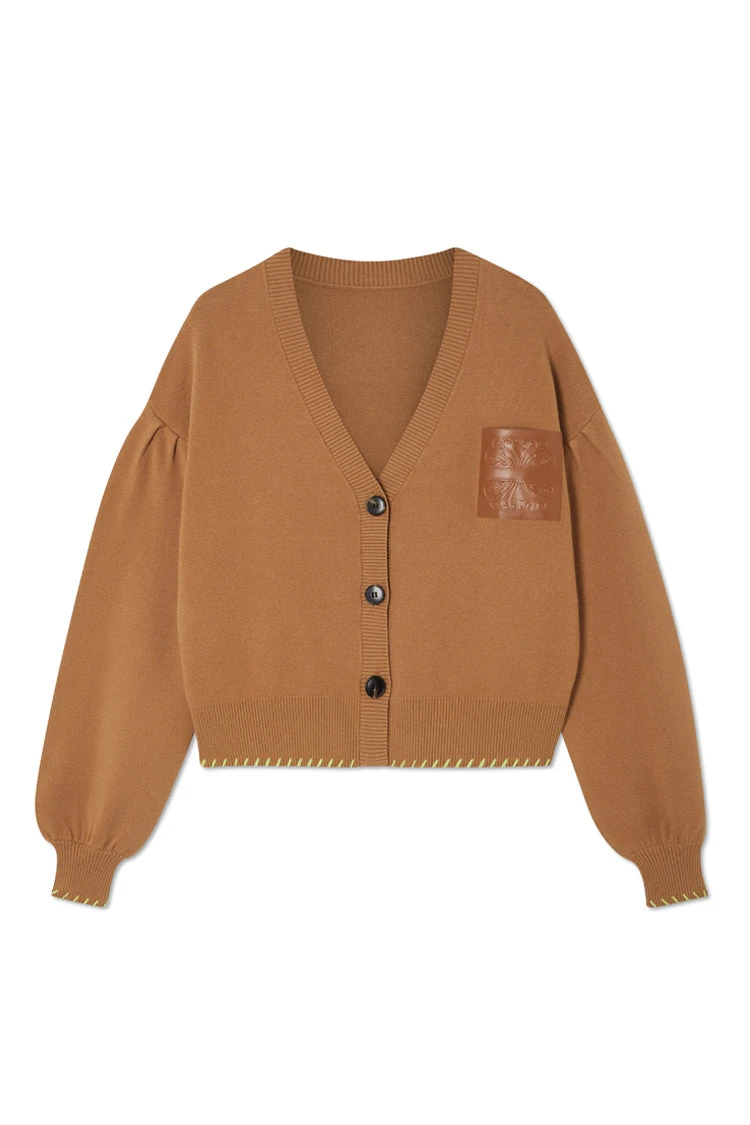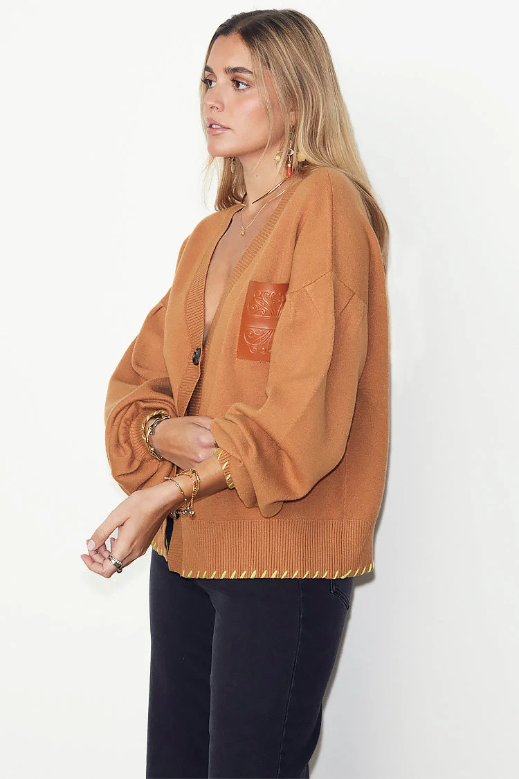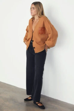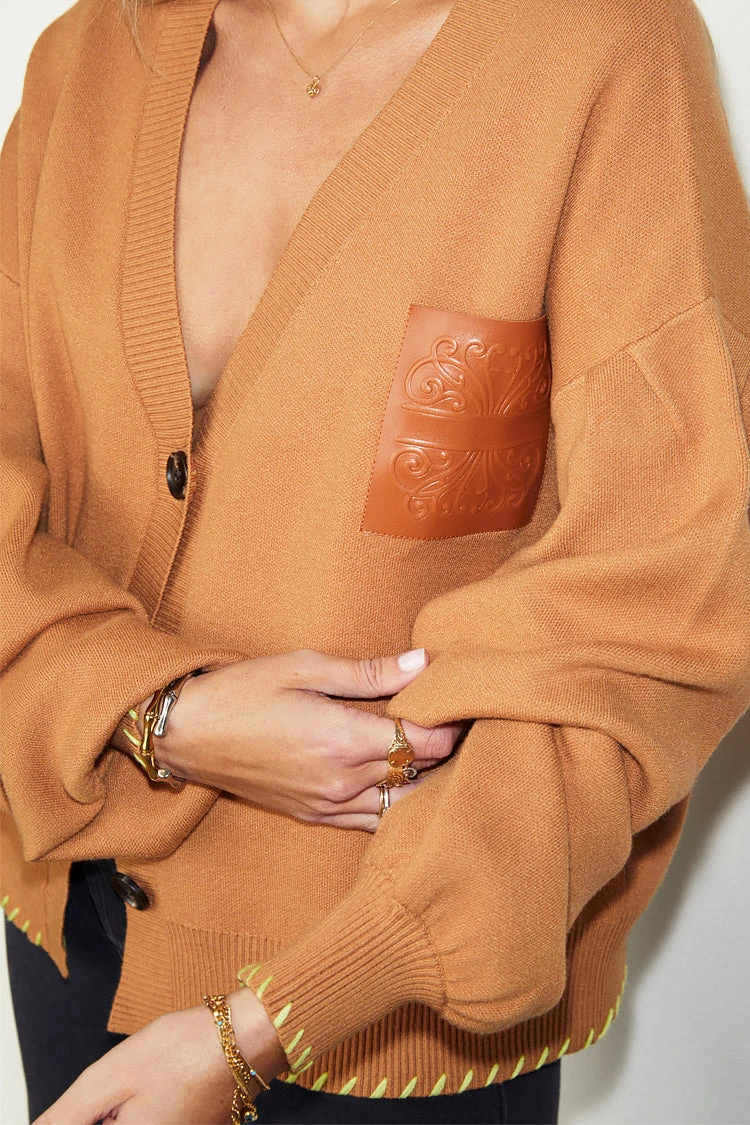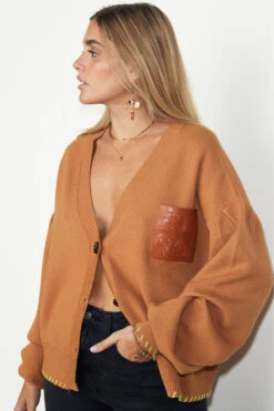 A cardigan knitted from a soft stretch weighty yarn. It has a drop shoulder with pleats, and blouson sleeves for a super relaxed and slouchy look. It has wide ribbed trims that help the fabric fit your body in the right places, and a bold yellow whip stitching for extra detail. A pocket cut from supple vegan leather sits on the left side, and is embossed with the NFD logo
