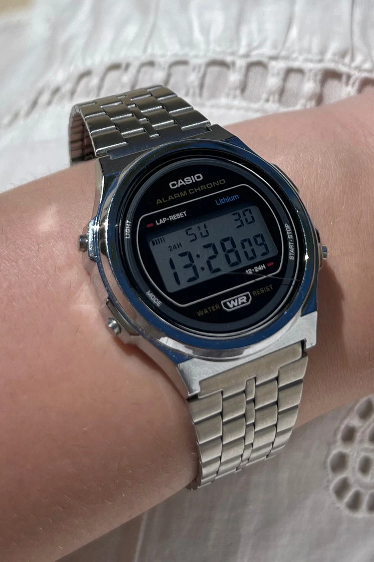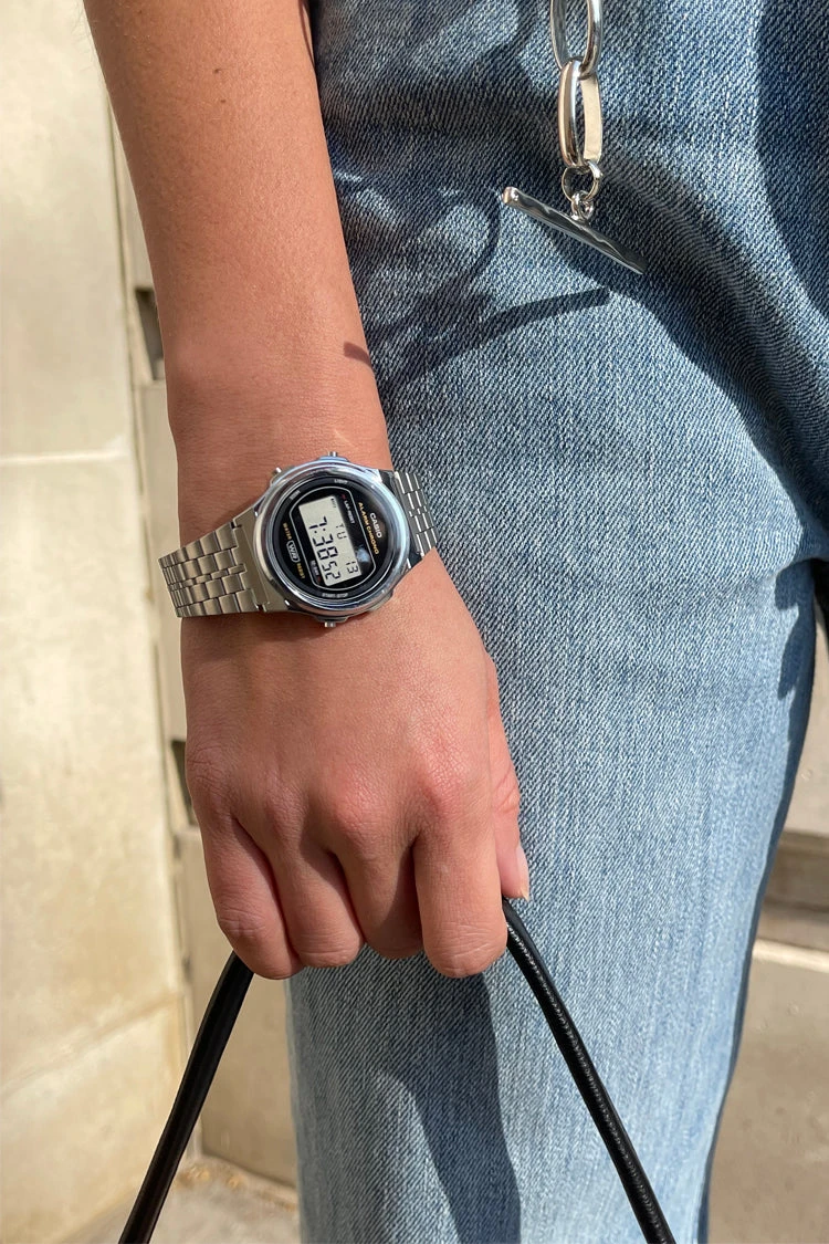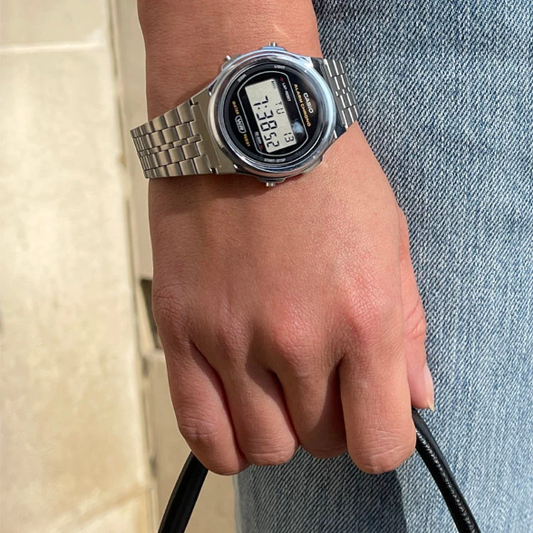 Introducing the A171 Series of round-face, unisex timepieces. Uncluttered monotone colouring combines with middle-sized designs that go great with a wide variety of styles. The bands feature a slide-type clasp that lets you easily adjust the band length without special tools. Features and functions include calendar and stopwatch capabilities, along with everyday wear water resistance and LED light illumination for easy reading in the dark. Classic silver for a staple accessory you can wear with anything.