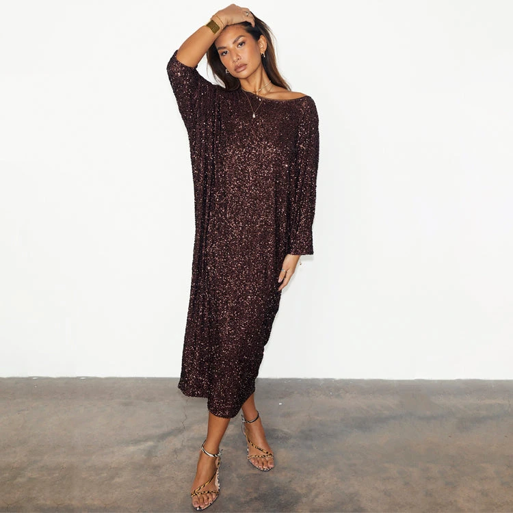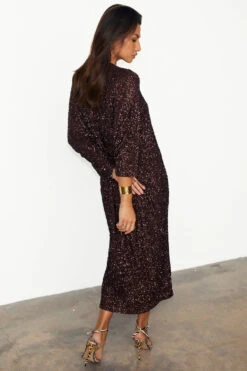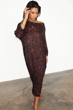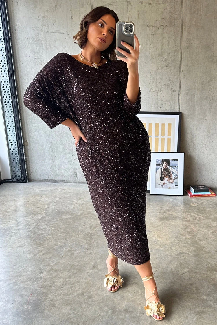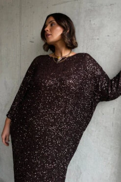 Made with hundreds of chocolate brown sequins, sewn into a heavy glossy satin base that skims the figure beautifully.. It has a really relaxed fit for versatile styling and adds a bit of contrast to the captivating sequin. Pair with gold jewellery to tie in with its warm tone.