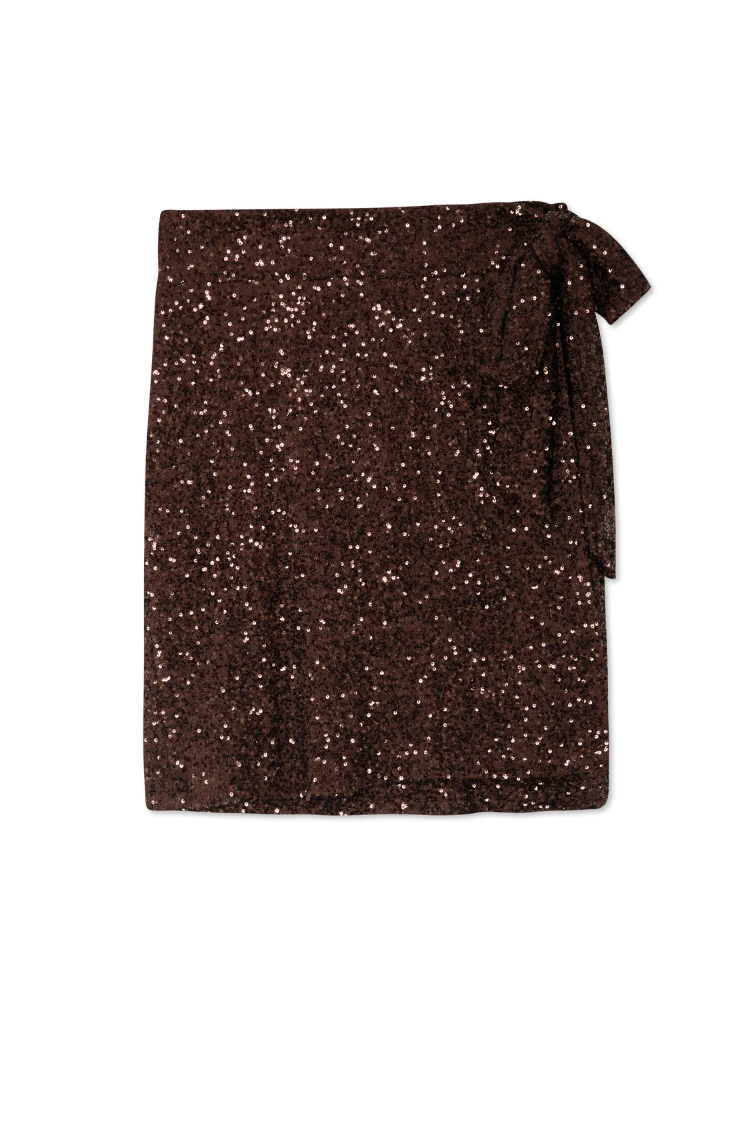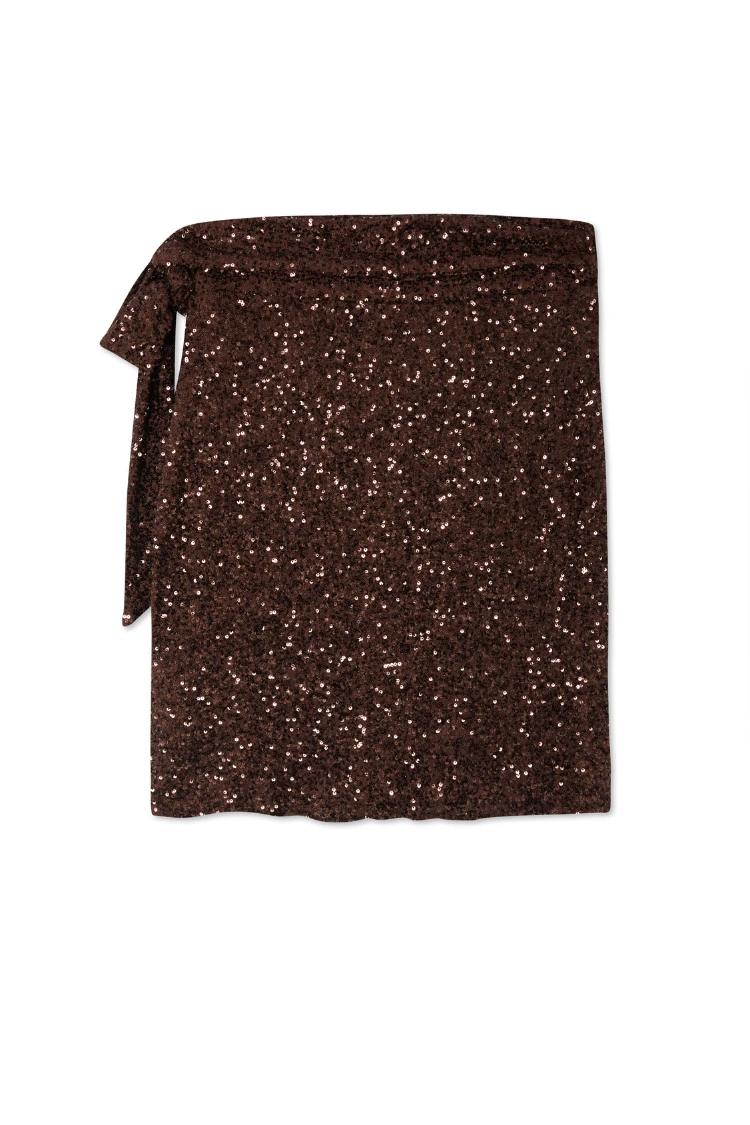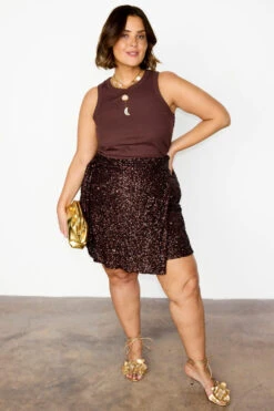 Sequin is really setting the tone this season. This chocolate sparkle is party perfection with some stilettos or a pointed toe heel. Or style with trainers and a white tee for day dressing, and let it catch and glimmer in the sunlight like a disco ball. Ties in a multitude of styles for amazing versatility. Sequins lined with a weighty satin that feels like it slinks over your figure and ensures a comfortable and non-scratchy feel.