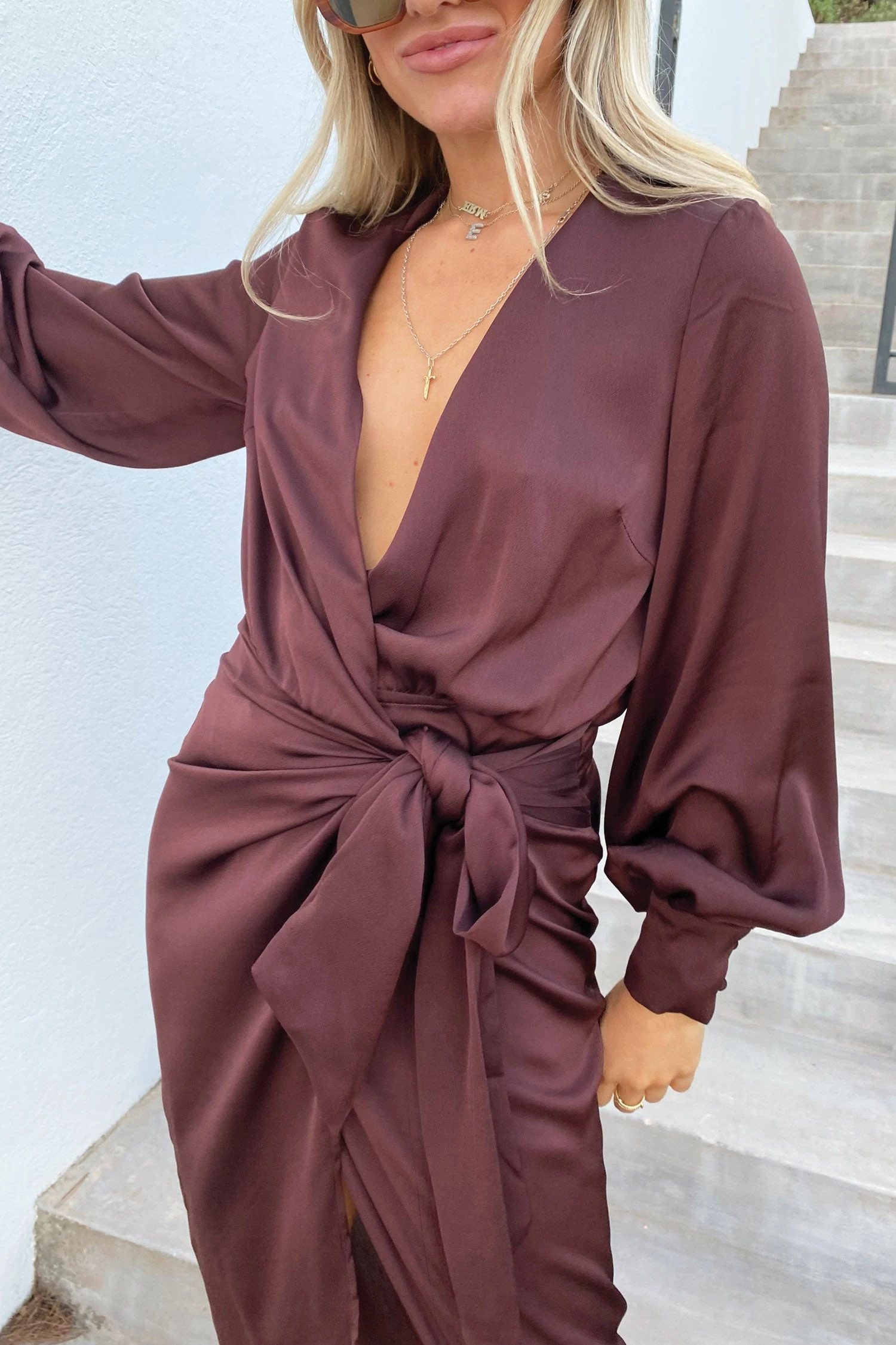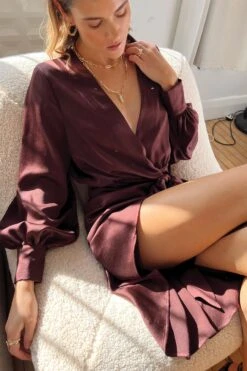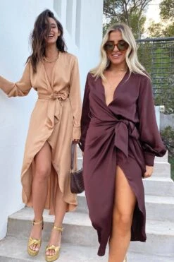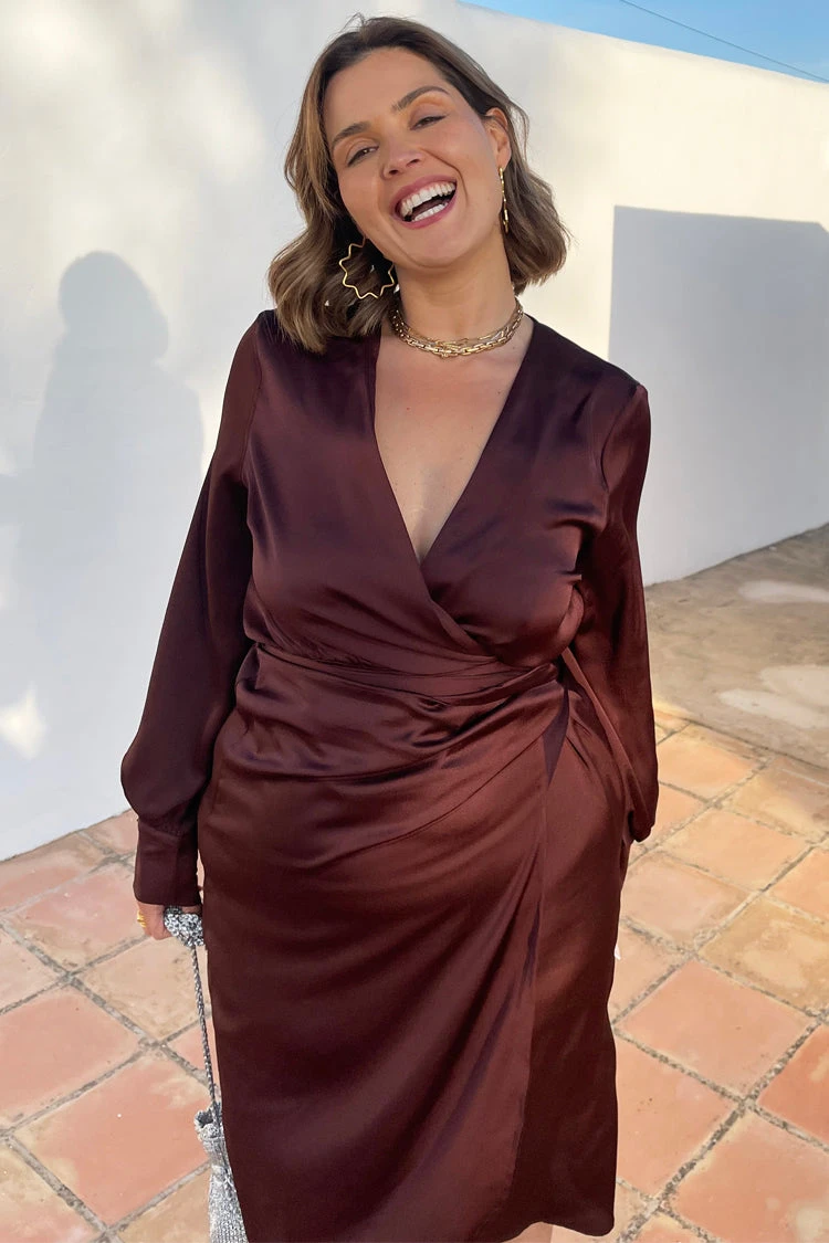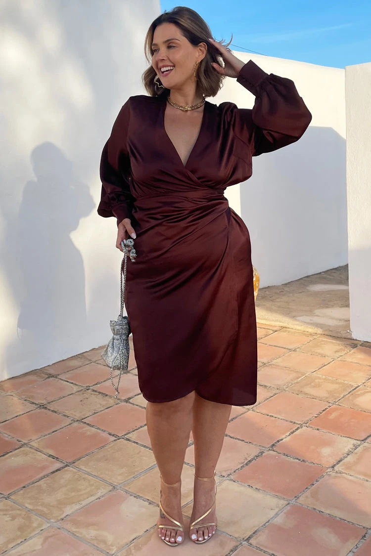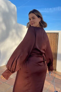 Brown is in and TRENDING! 🤎 Need a dress for an occasion? This is the perfect piece. Cut from an elegant satin fabric the waist tie creates a beautiful silhouette to flatter all body shapes. Style with strappy sandals and a small clutch bag.