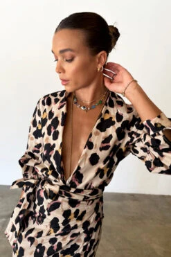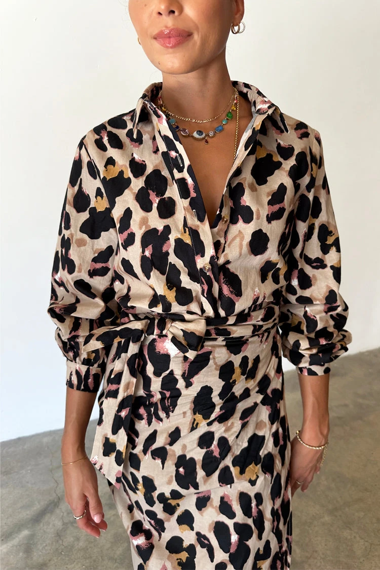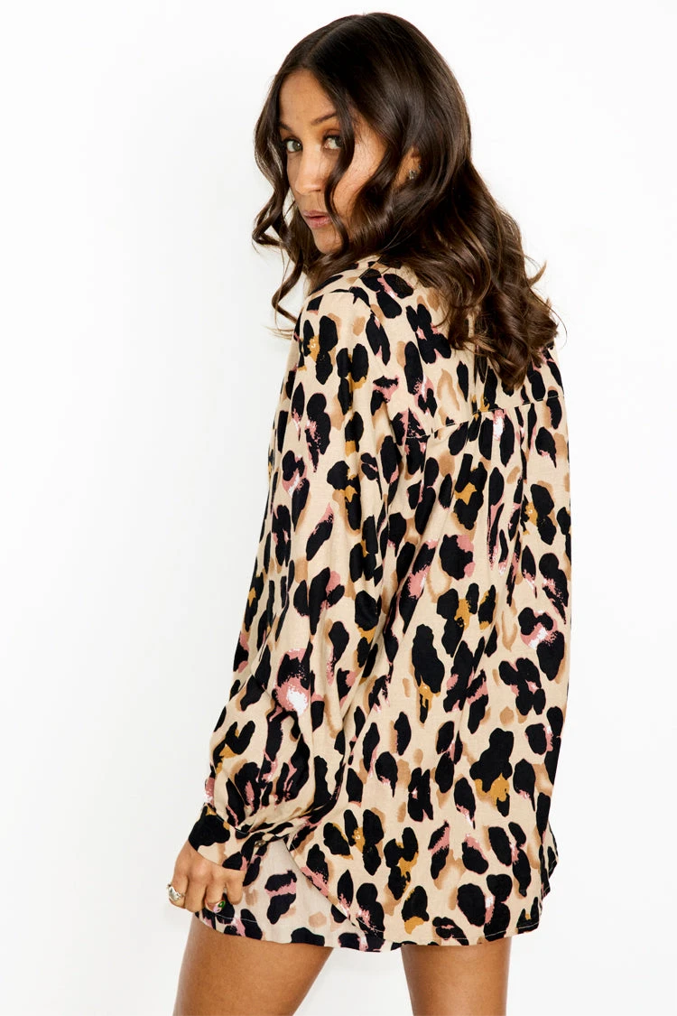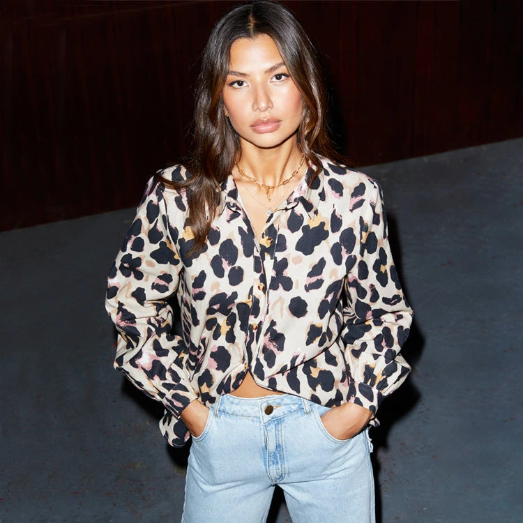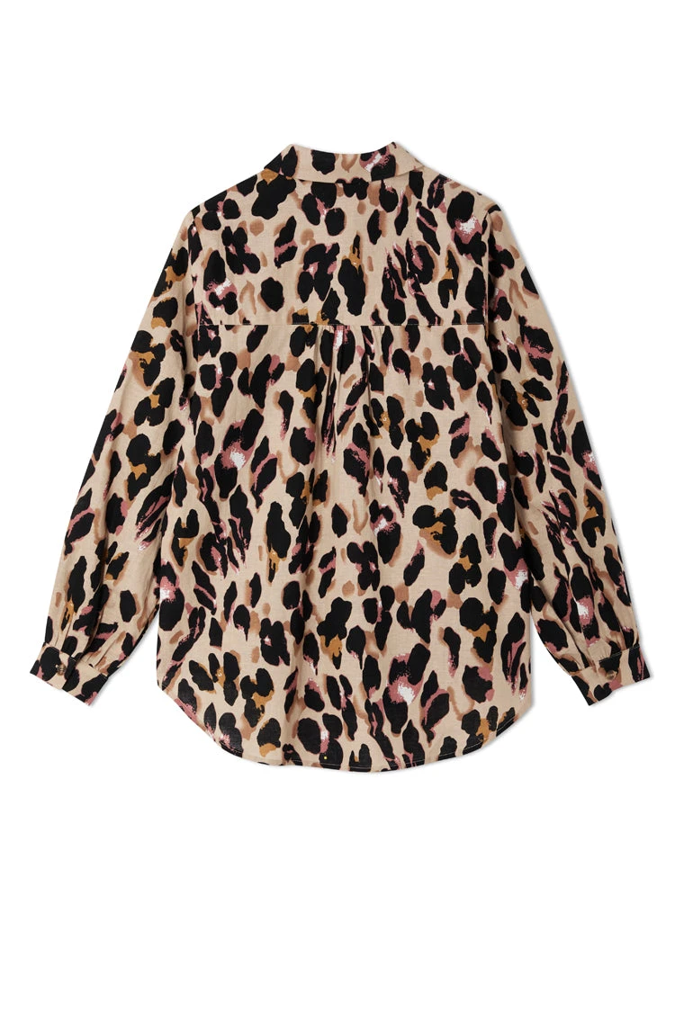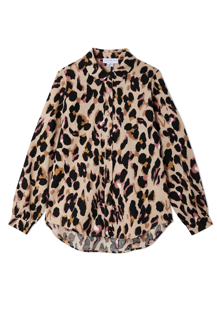 We’ve created a new take on our signature leopard satin pieces, and turned them into a new fabric base. A soft Linen cotton blend that is so fresh and breathable for warmer climates. It has a bold orange back neck tape and tortoise summarys for a clean finish and additional pop of colour. This shirt is perfect for layering under jumpers and pinafores in the colder months, and taking through to summer with jeans and shorts.