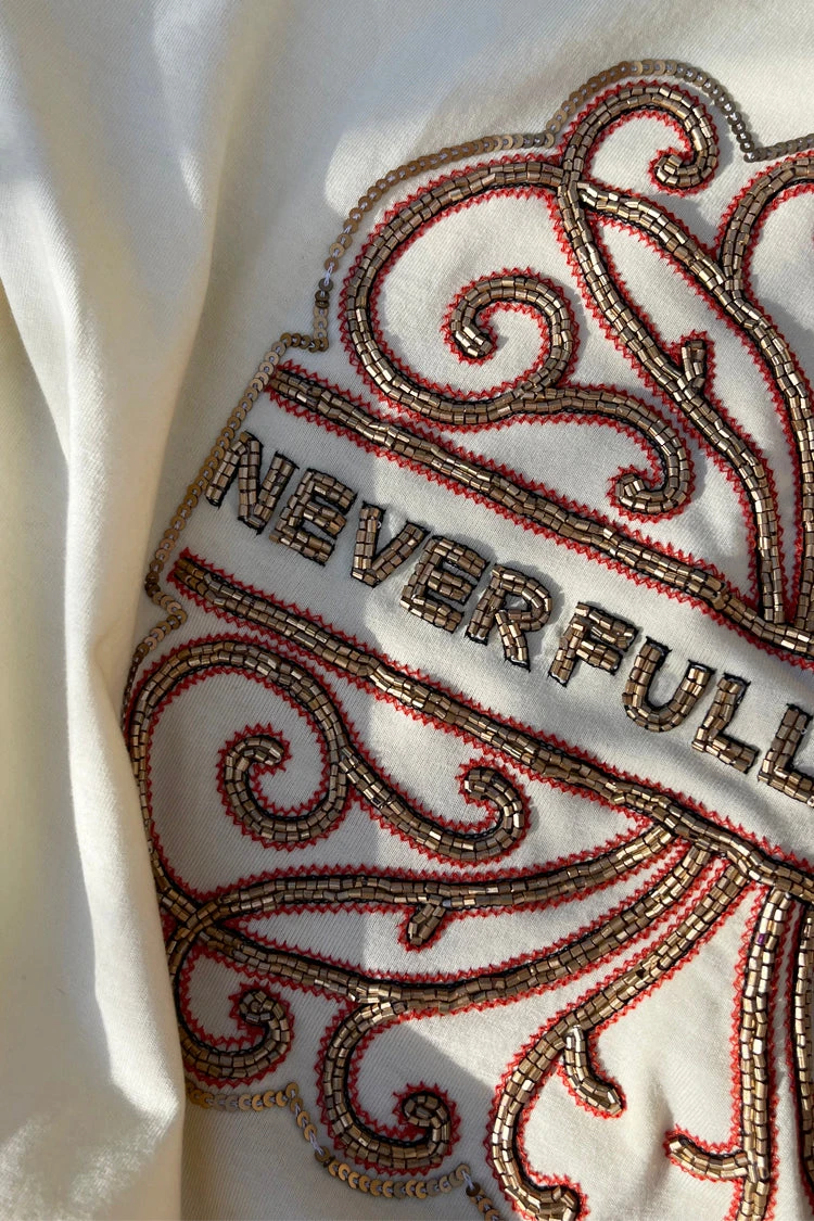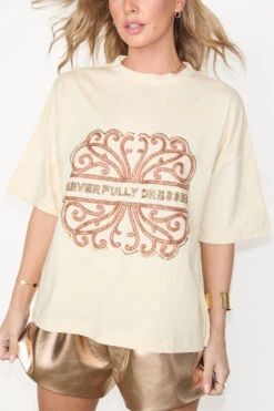 A boxy cream T-shirt with our iconic NFD logo embroidered in a gold beading. With a drop shoulder and relaxed fit, you can style it for date nights with a heel, or with your favourite denim and sneakers for that model off duty look.