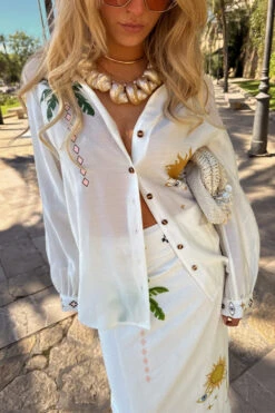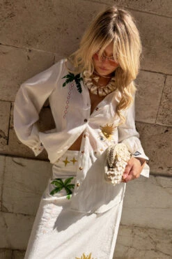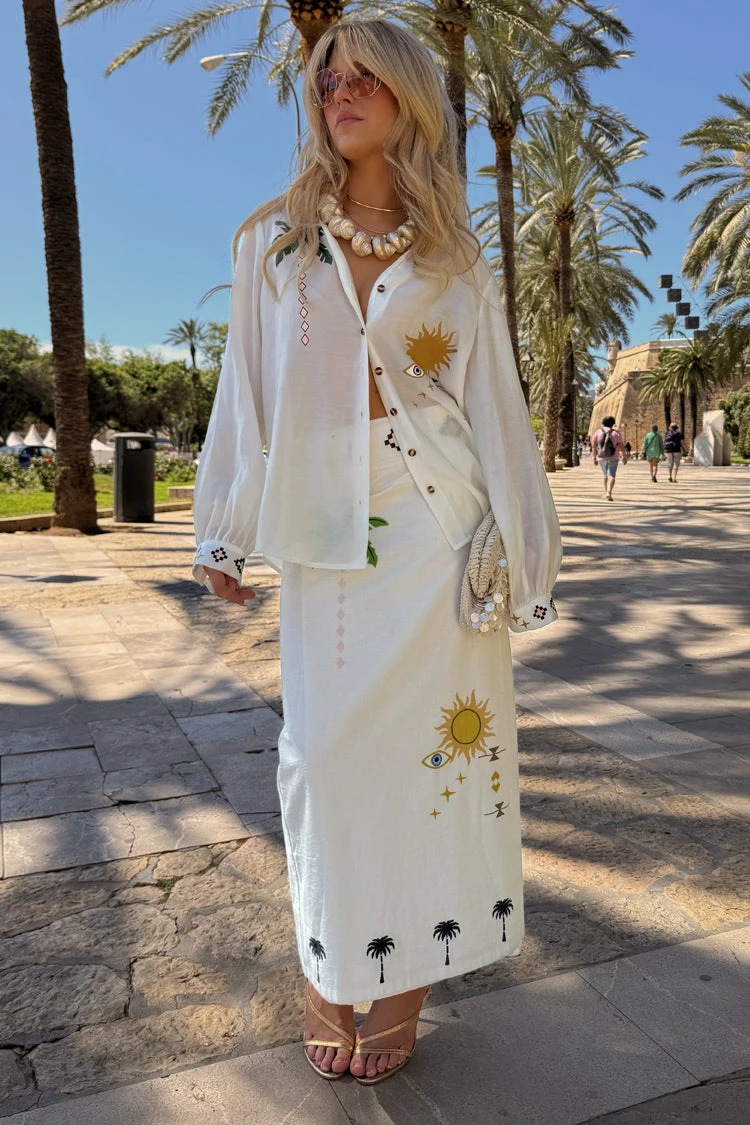 A very slight sheerness for a luxe and lightweight feel but solid enough for everyday work wear. In true NFD style we’ve added some of our iconic print motifs, like the suns, palms and eyes, as well as contrast tortoise summarys for an extra touch of interest. For the full effect, pair with the matching sahara Jaspre skirt, add some gold accessories and a heel.
