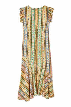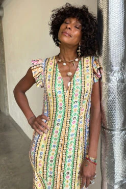 In a gorgeous multicoloured geometric print with fun, feminine frills along the sleeves and an a-symmetrical skirt. Perfect for a day out in the sun, paired with some gold accessories and some heels.