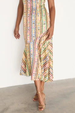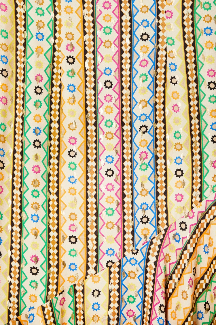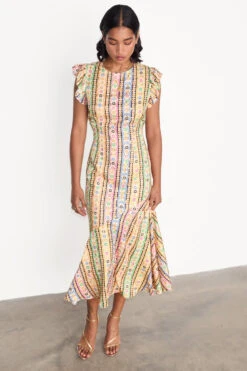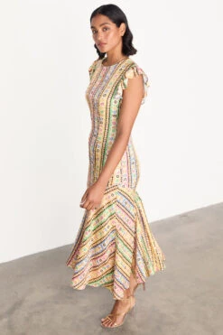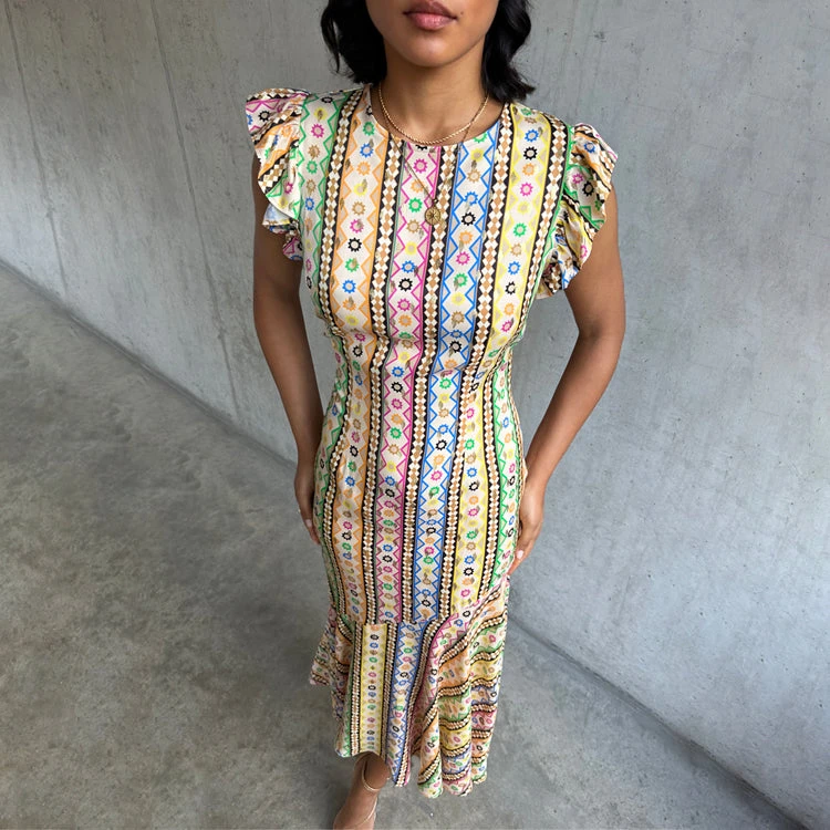 In a gorgeous multicoloured geometric print with fun, feminine frills along the sleeves and an a-symmetrical skirt. Perfect for a day out in the sun, paired with some gold accessories and some heels.