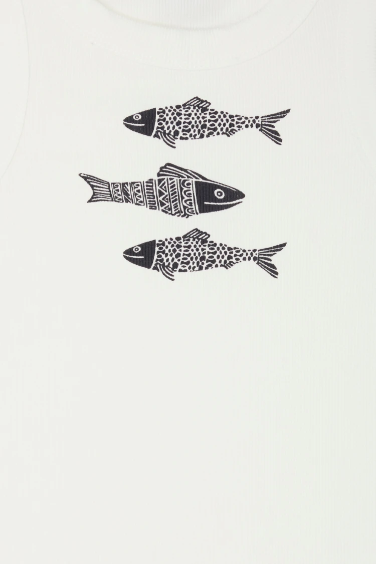 A soft stretch ribbed tank, the perfect foundation for versatile styling. These tanks can be paired with anything and layered under a light jacket for spring. Embroidered with the NFD logo and printed with little fish illustrations for a special finishing touch.