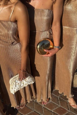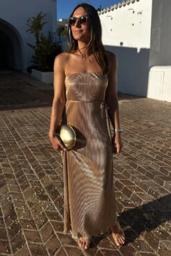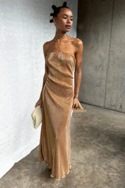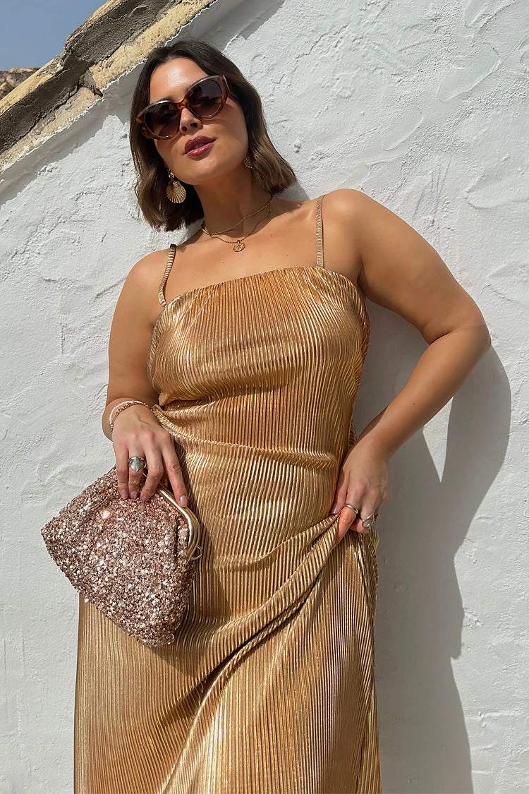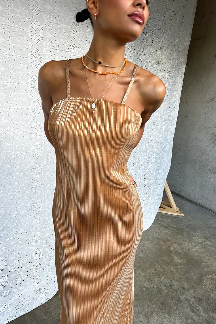 A slinky gold plisse that catches the light in each little fold, and creates a beautiful almost holographic shimmer. This figure skimming dress has dainty detachable straps for versatile styling – cross them over, wear conventionally, or as a bandeau.