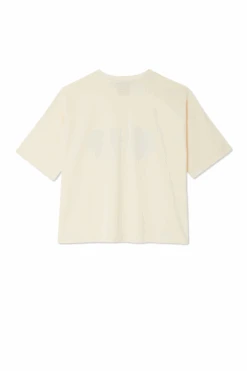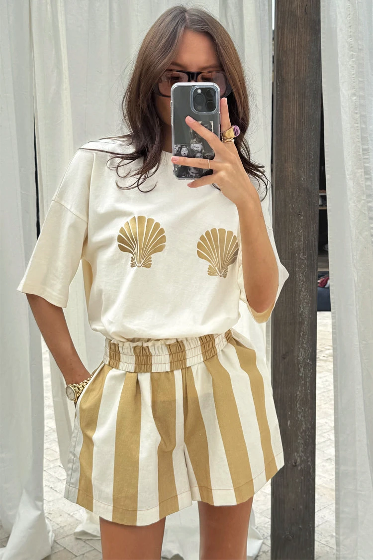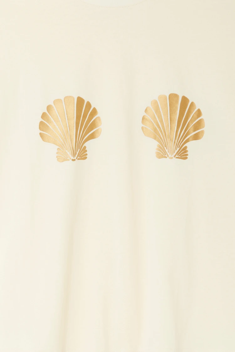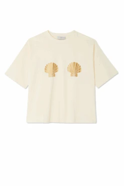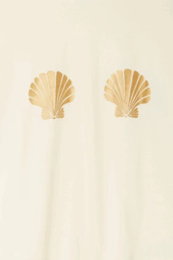 A staple white tee with a bit of a boxy fit, a reedition of our classic boob tee that has been selling out for almost 10 years. The gold shell print adds a pop of NFD flare to the simplicity of the t-shirt which allows you to dress it up with a jaspre skirt and some heels or tuck into some scallop jeans.