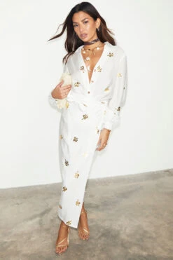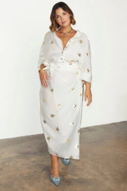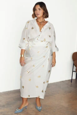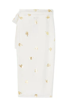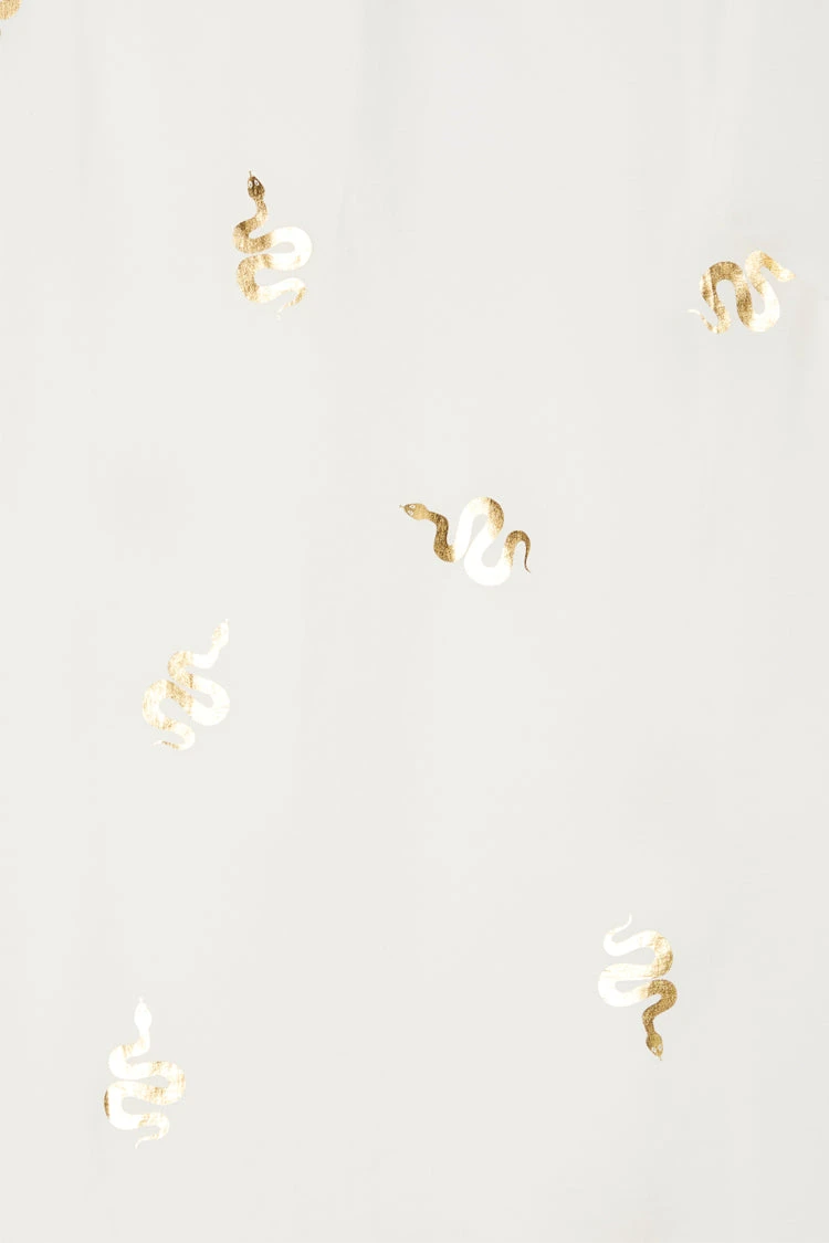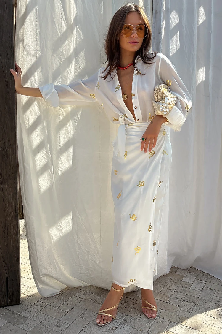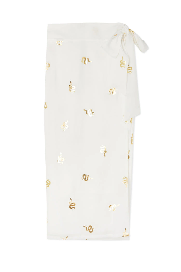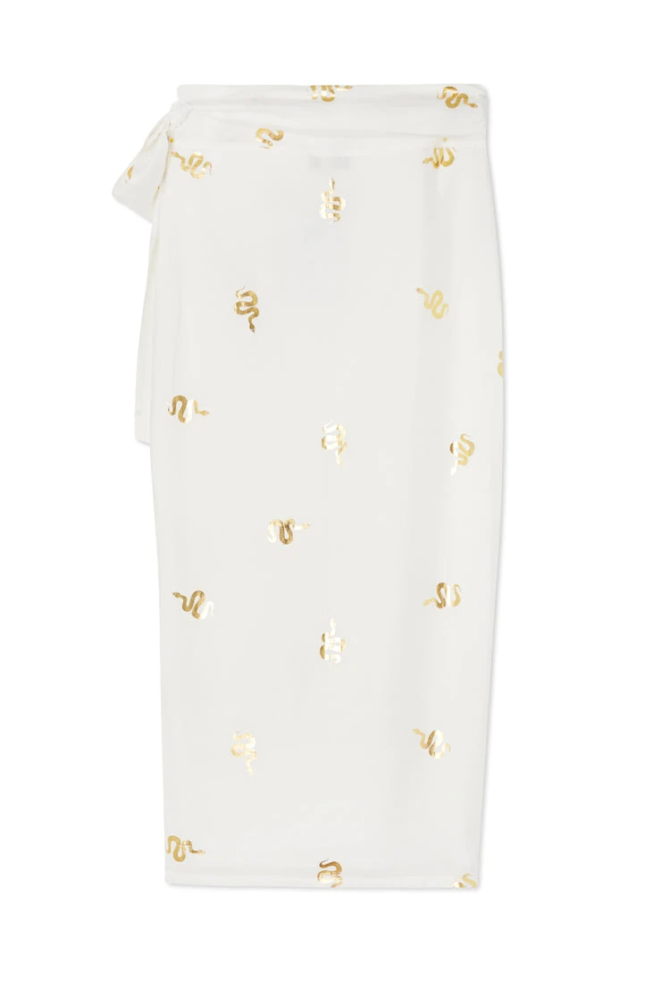 Our classic Jaspre skirt, with an adjustable wrap waist that ties in a multitude of styles – making it a super wearable and versatile closet staple. Stamped with snakes made from a gold foil that catches and glistens in the light, and is eye catching yet subtle enough to wear as everyday dressing with a tee and sneakers.