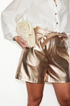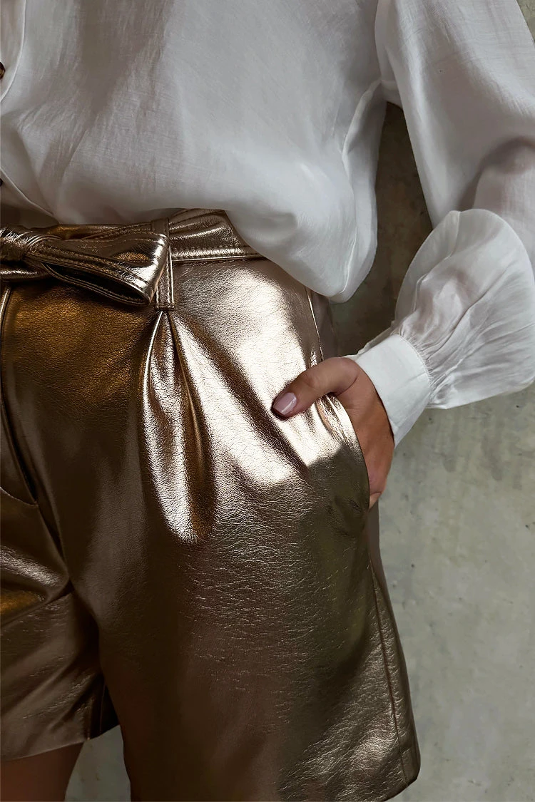 Made from a supple metallic gold leather, and has a bit of a tailored fit with darts and a belted waist for definition. A really elevated staple to pair with a white tank or shirt in the summer, or tights and boots in the colder months. Versatile enough to take from office wear to festival, meaning you get the most out of what you wear.