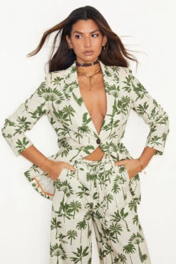 Timeless sophistication, crafted from a luxurious blend of cotton and linen, this blazer effortlessly marries comfort with elegance. Its tailored silhouette is fit for summer wedding and occasion dressing, while the refreshing green palm print adds a touch of NFD. Pair it with its coordinating pieces for a polished ensemble that transitions seamlessly from summer days to nights.