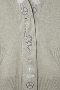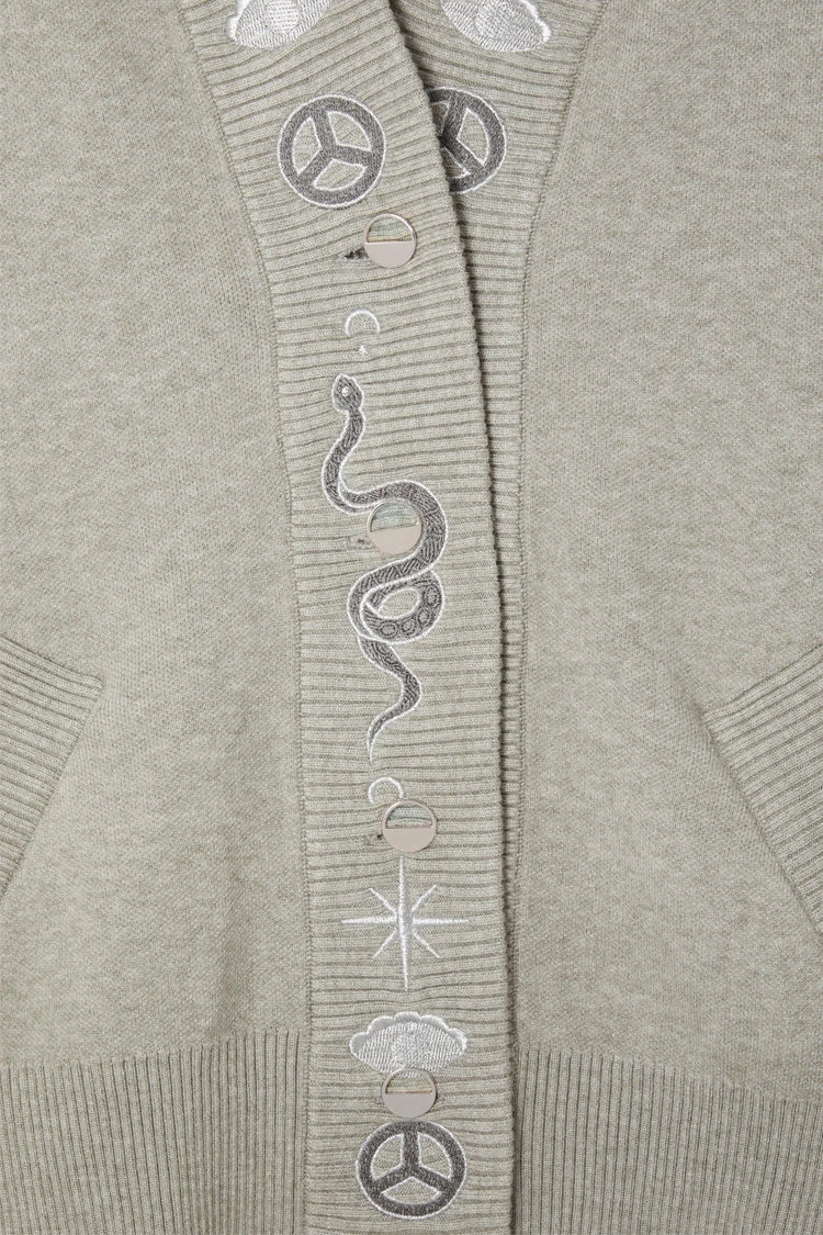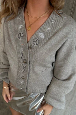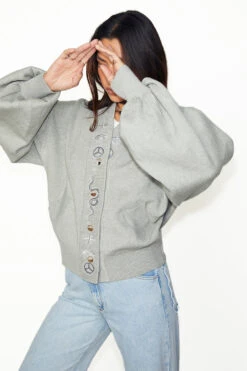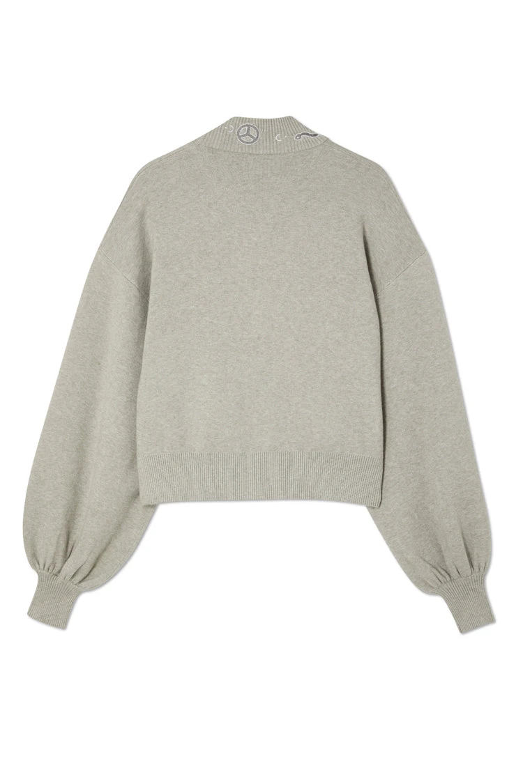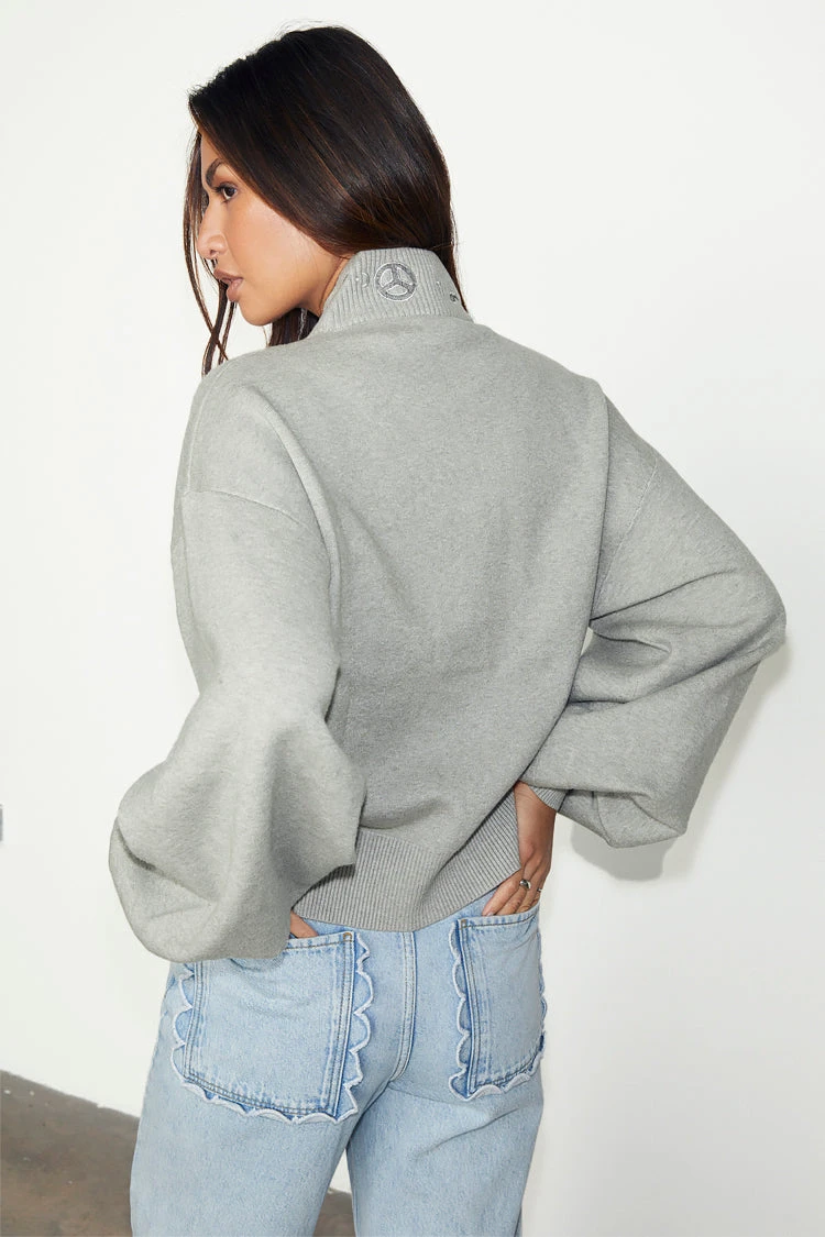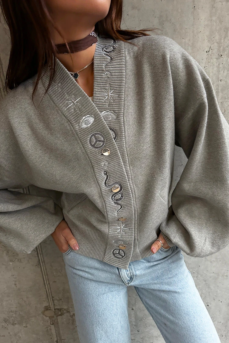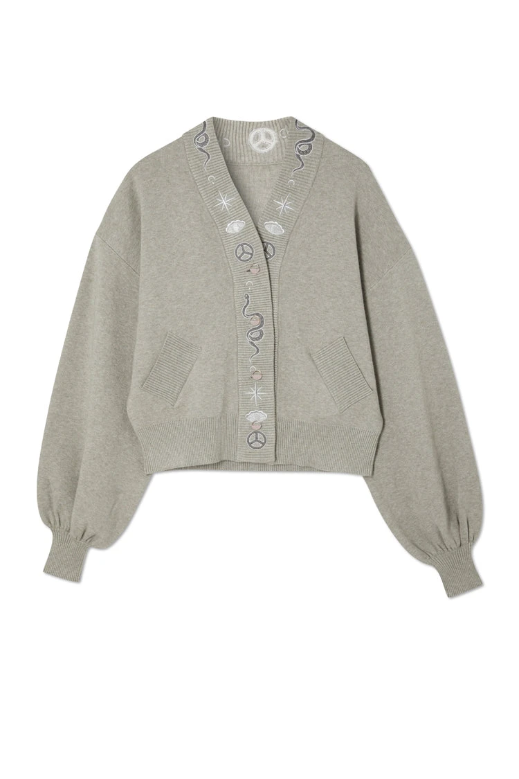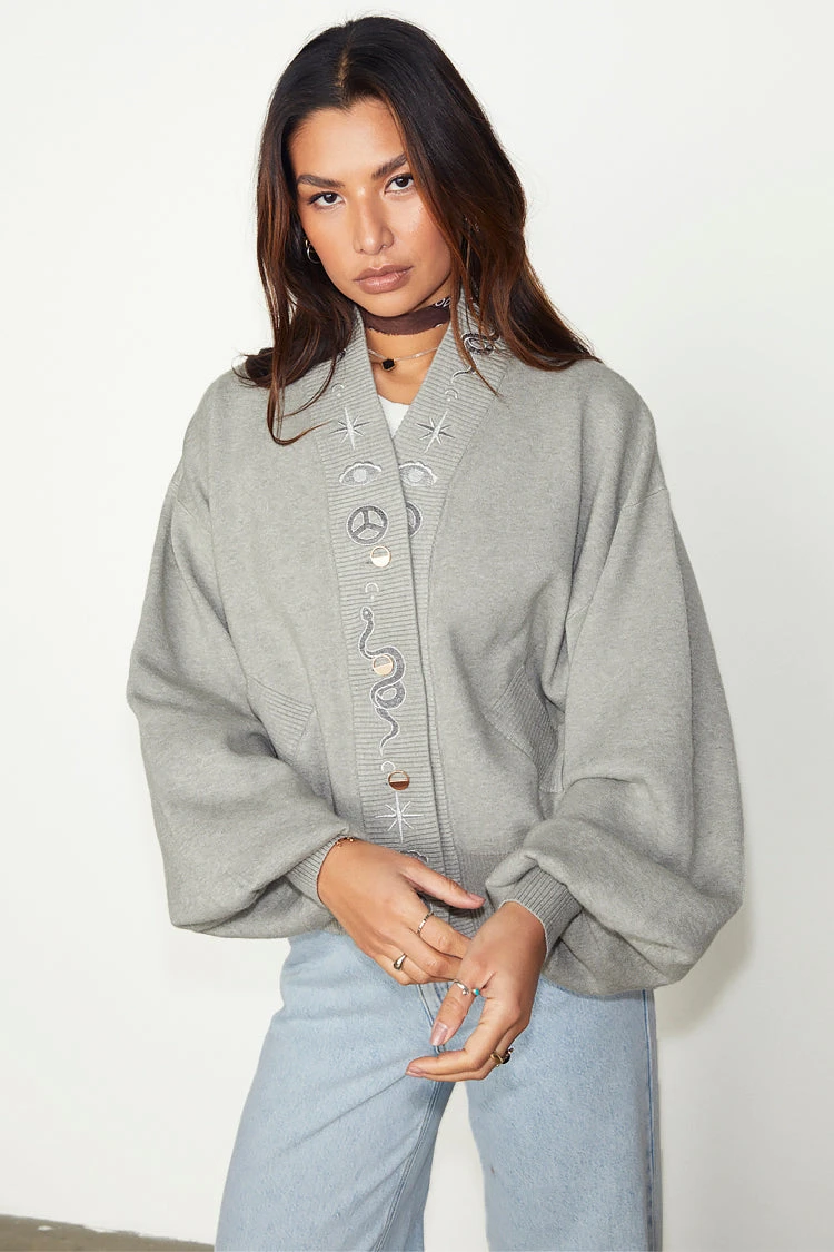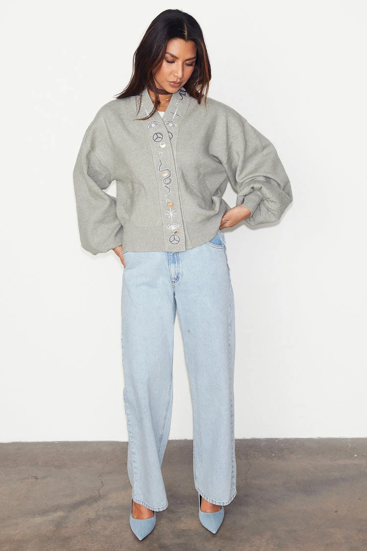 The knit is SO buttery soft, and feels gorgeously weighty and luxe. Thick ribbed trims embroidered with emblems that are part of our manifestation collection. The light will highlight the metallic threads adding to the mystical style. Dramatic blouson sleeves that drape over the cuffs, and a slouchy fit that gives it that ‘bomber’ look. A really flattering crop and neckline that you can layer as a cardigan or wear solo.