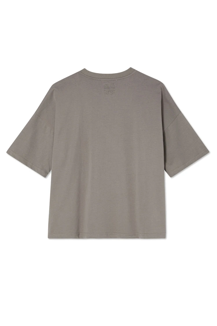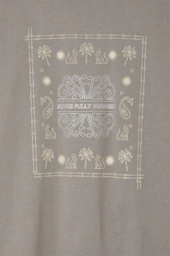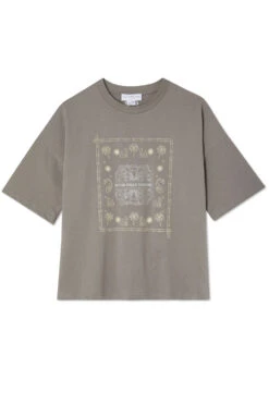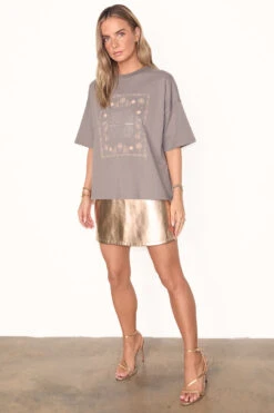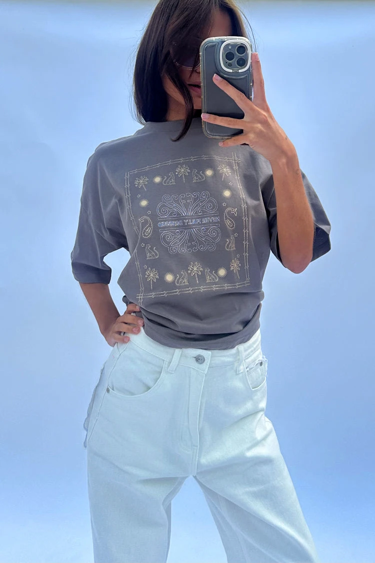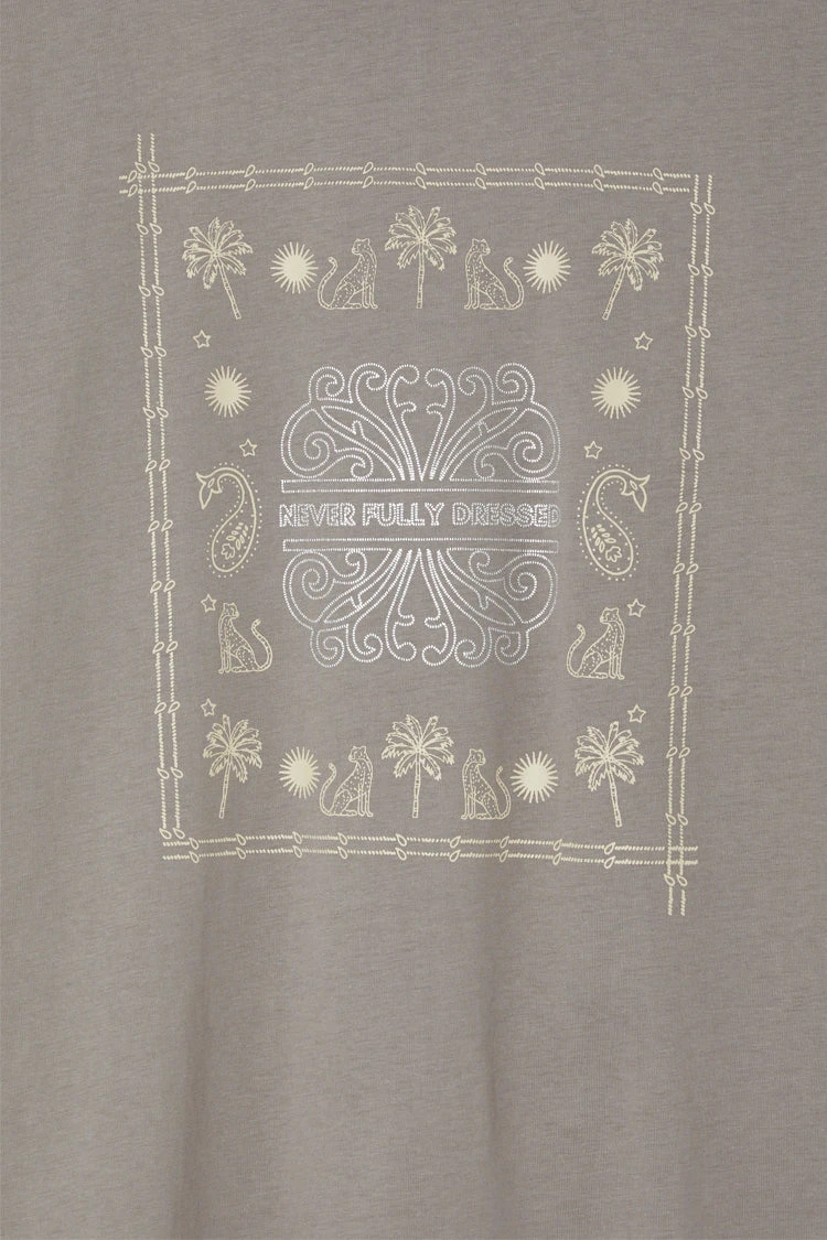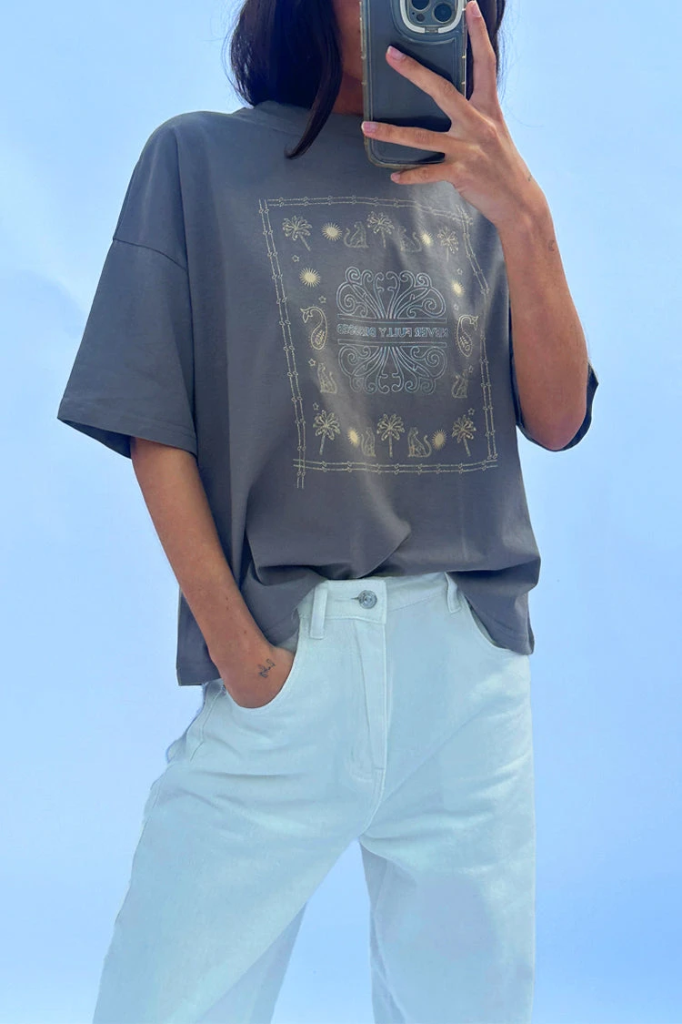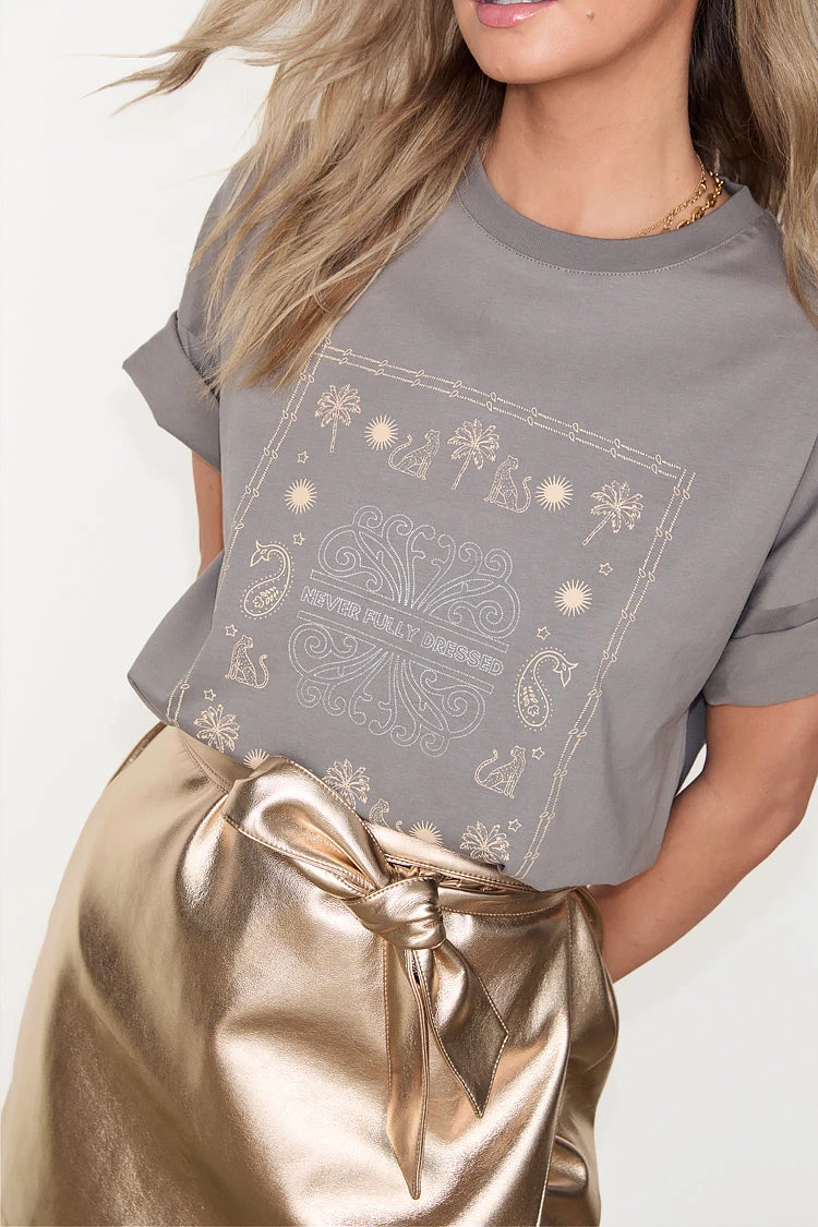 A boxy grey T-shirt decorated with gold foil elements like palms, bandanas and leopards – motifs that feel really true to NFD. With a drop shoulder and relaxed fit, you can style it for date nights with a heel, or with your favorite denim and sneakers for that model off duty look.