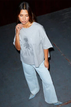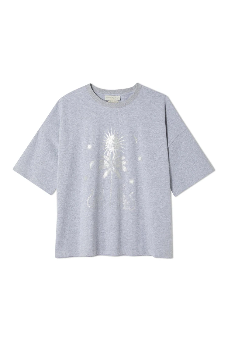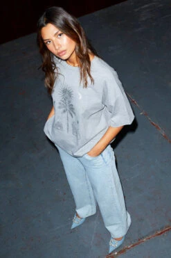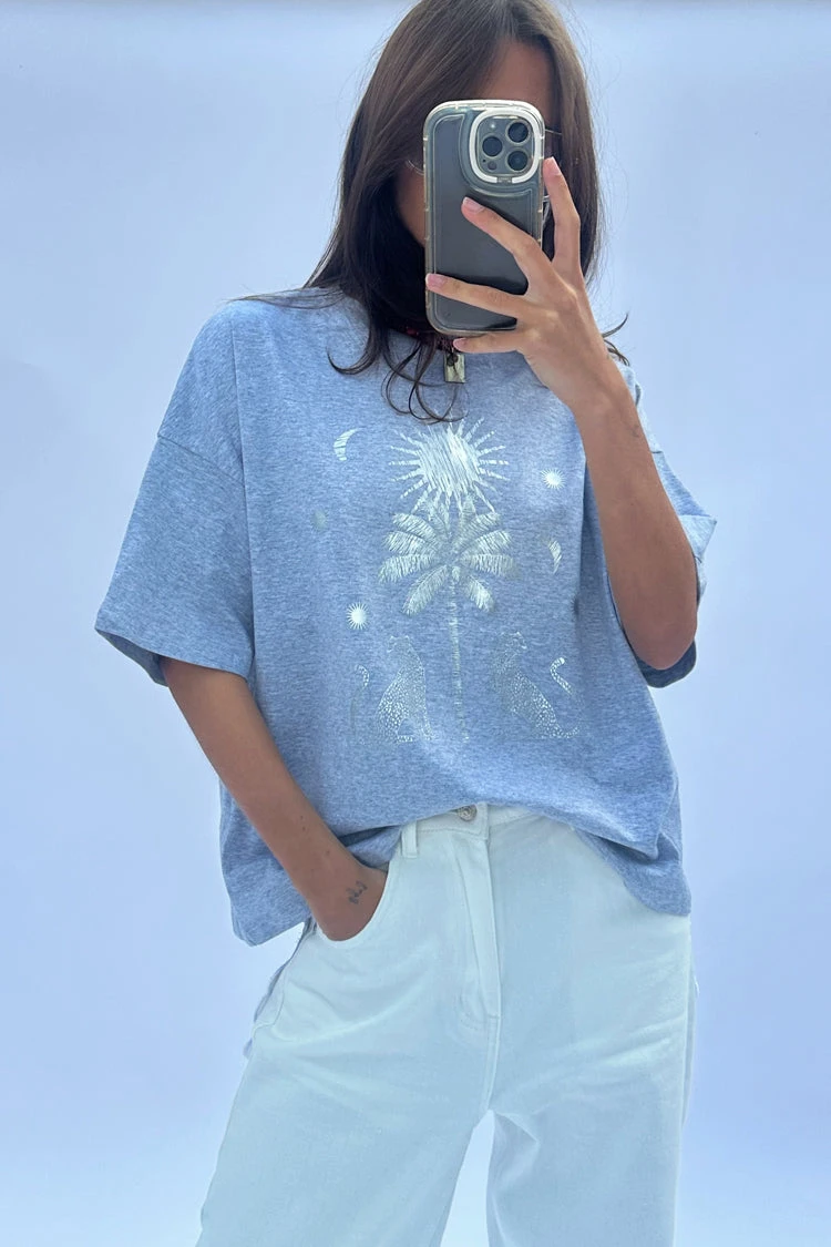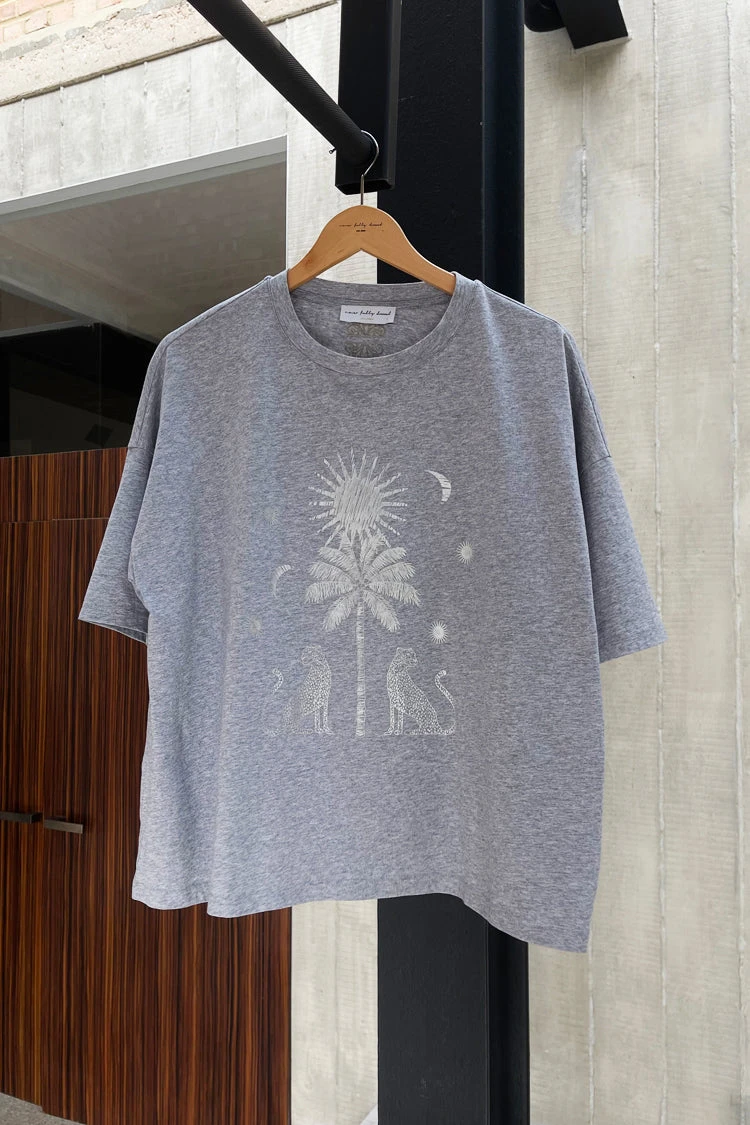 A move on from the sell out favourite black running wild tee. Featuring leopard motifs (somewhat an emblem of our brand), palms and sunshine made from a metallic silver foil. With a relaxed fit and dropped shoulder seams – partially tuck into jeans, or pair with leather pants and heels for an ultimate comfy night time look.