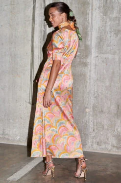 An elegant midi shape, decorated with an intricate pattern that feels so classic NFD . Softly pleated cups, short puff sleeves, and a body sculpting fit from bust to the hem. It has a shirred panel at the back to ensure a bit of stretch and variation on sizing.