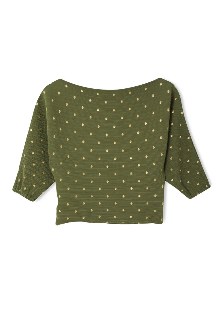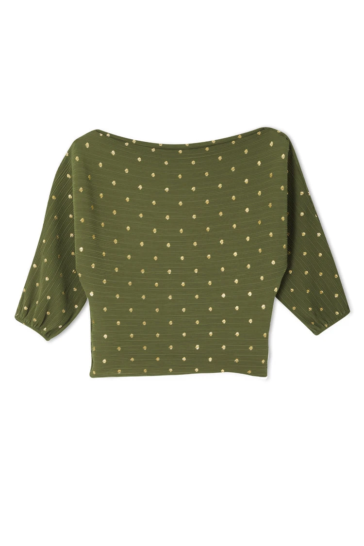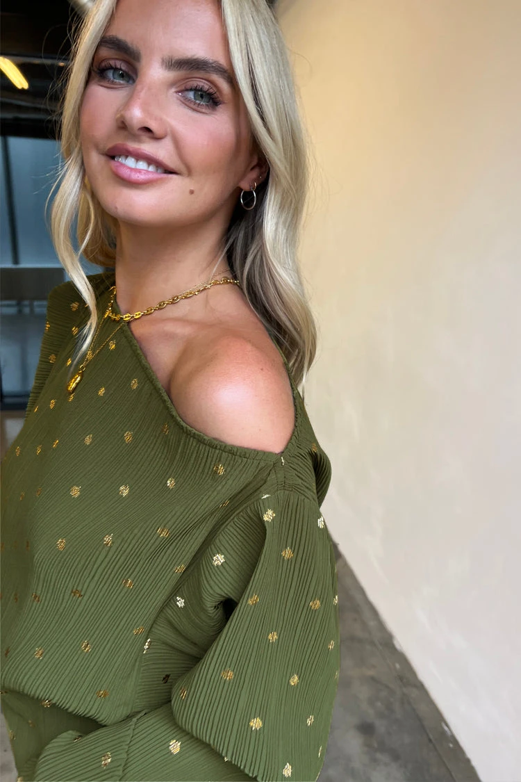 You loved the Tilly dress so now we’ve made it as a top. Classy khaki plisse material with a fun gold fleck. The flattering cold shoulder is suited to all bust sizes. Pair with Vegan Leather trousers or a Jaspre skirt and heels for an easy chic look for parties, date night or brunches.