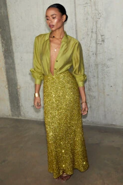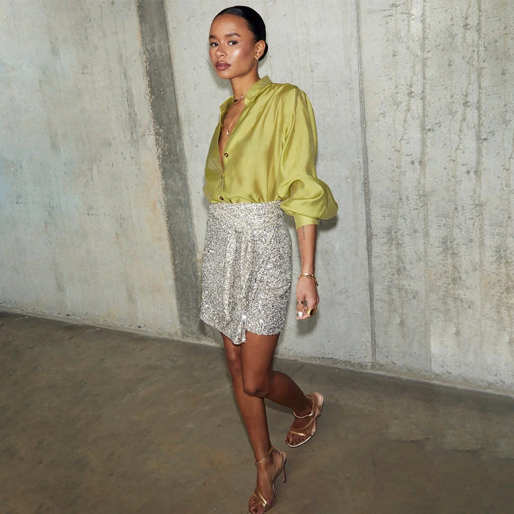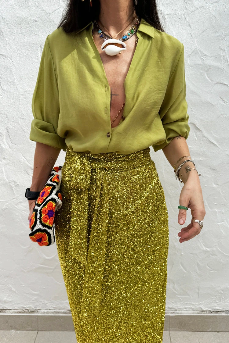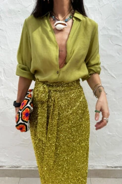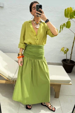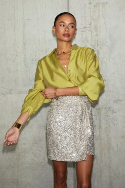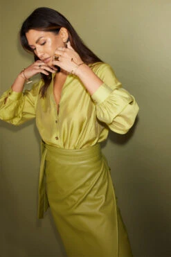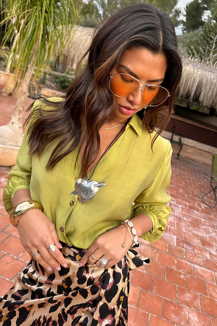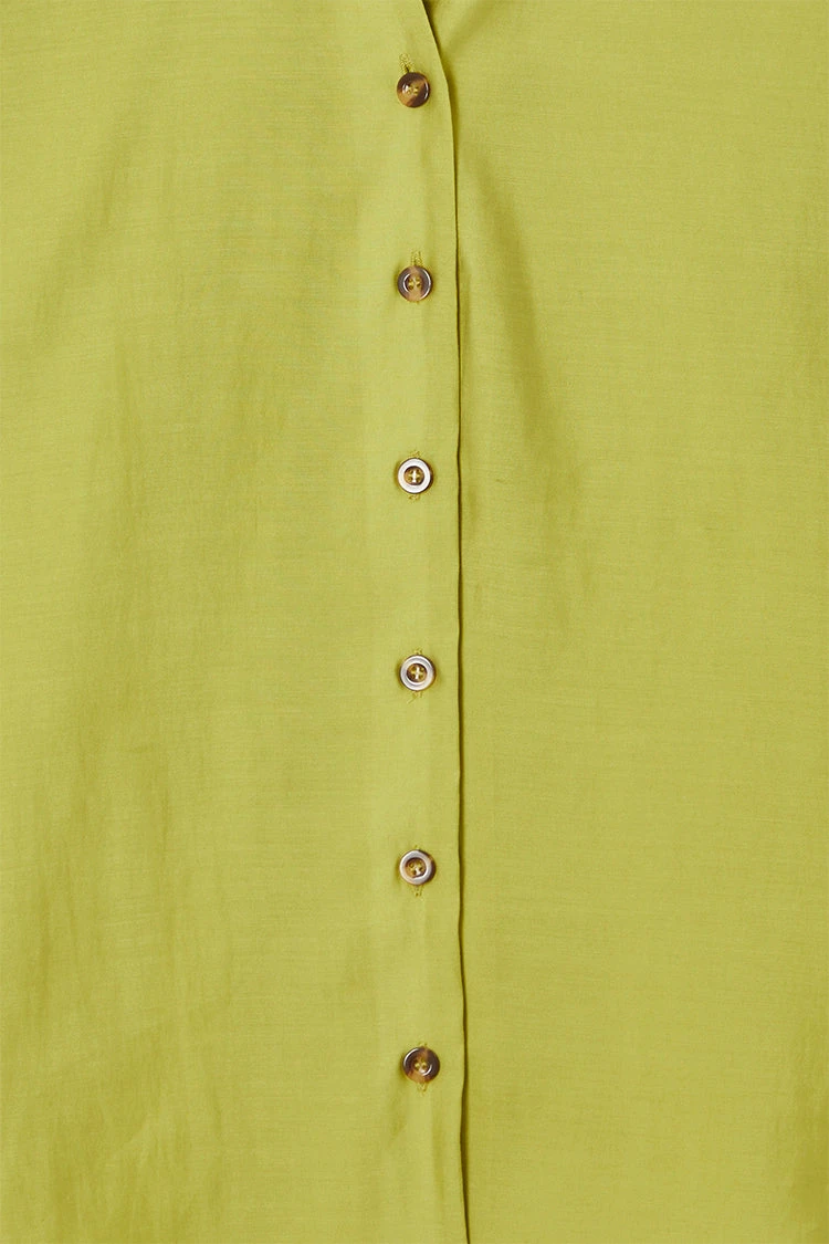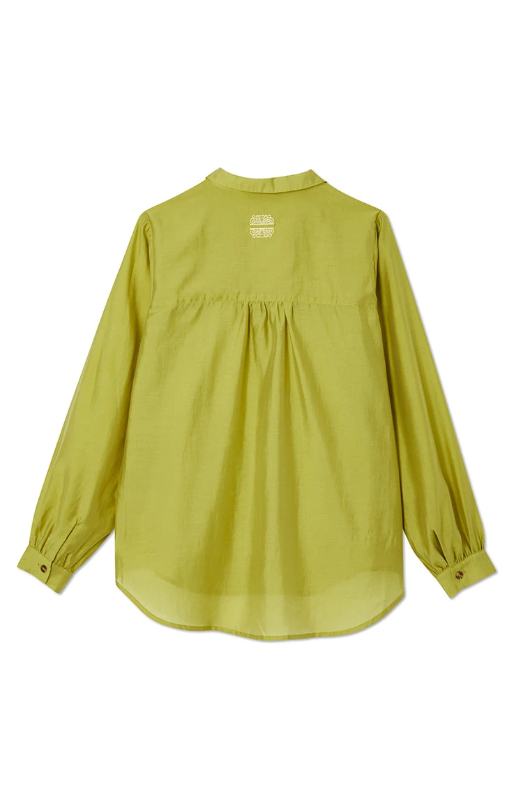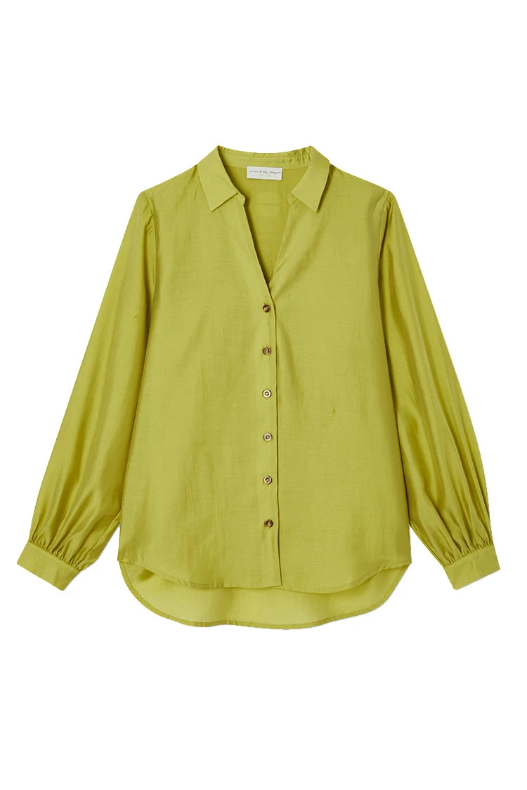 A super wearable lime shirt, with blouson sleeves and a floaty silhouette. A very slight sheerness for a luxe and lightweight feel but solid enough for everyday work wear. We have added contrast tortoise summarys for an extra touch of interest and gorgeous embroidered logo on the back neck.