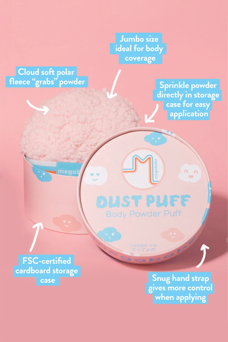 Dust Puff’s FSC-certified cardboard case does double duty as Puff storage and a built-in application hack — sprinkle your powder in the bottom and your Puff is always ready to go!