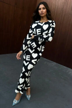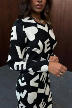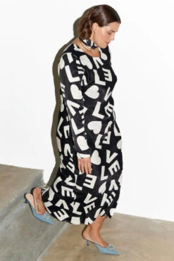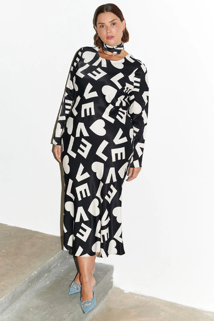 Made from a glossy satin that feels so weighty and luxe, this dress is a body skimming fit perfect for winter wedding guest dressing. Covered in our favourite LOVE emblem in a monochrome palette (a safe bet for every occasion). It features a little keyhole summary fastening on the back that you can wear backwards to create that 70s cut out vibe. We love a multi-wear moment.