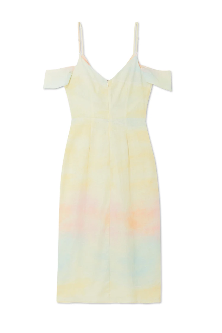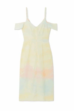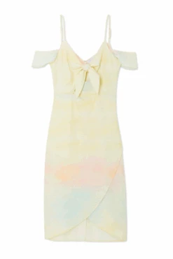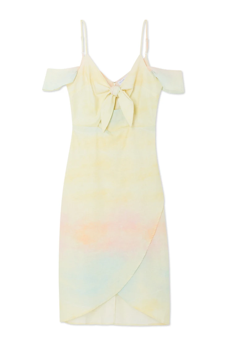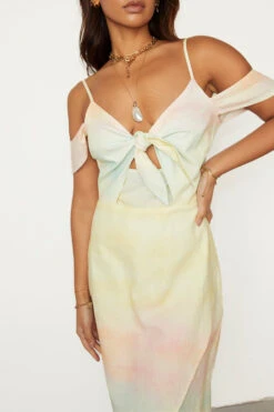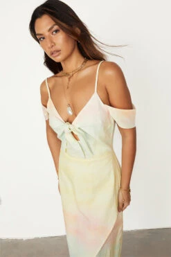 Made from a heavy linen viscose blend, in a beautifully unique new shape. It features an overlaying skirt that makes it look like one of our classic wraps, but ensures a little bit more coverage. The cold shoulder is so in right now, with little adjustable straps paired with drapey and feminine sleeves. It ties in a knot in the centre to create a cutout.